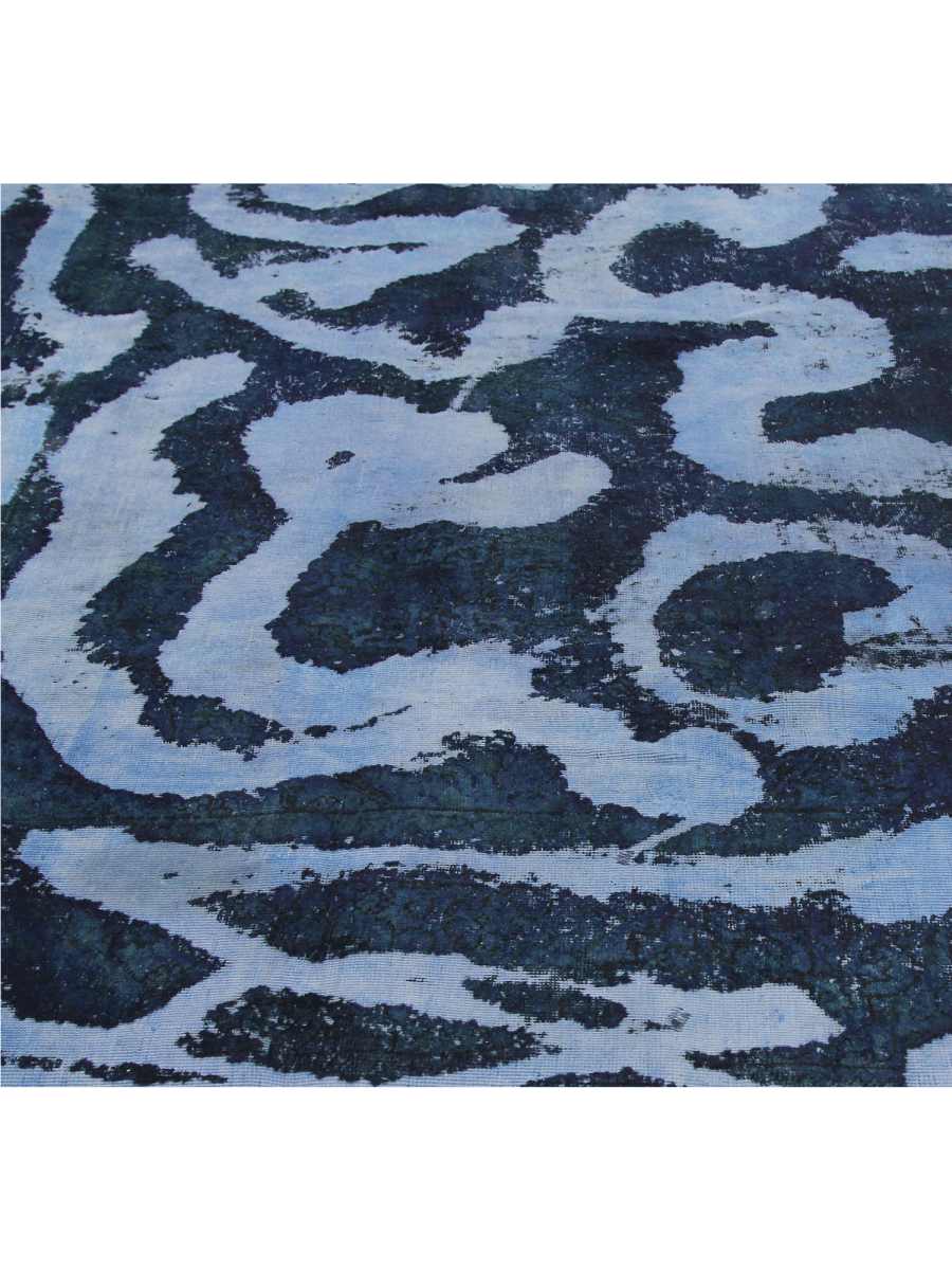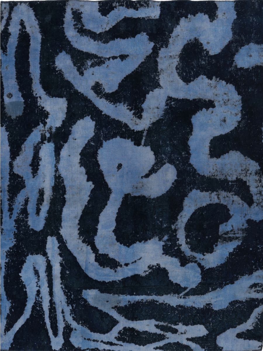 Hand-knotted in Persia, this 6x7 vintage distressed overdyed rug showcases a striking no-border pattern layered with rich blue and charcoal tones. The overdyed finish adds depth and character, creating a well-worn look with an artistic edge.