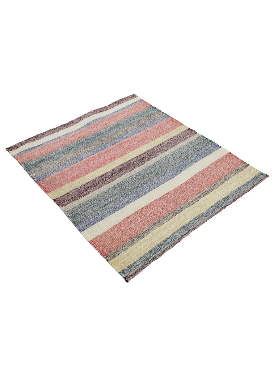 This 3x3 Persian Kilim Area Rug is a stunning fusion of sleek elegance. It is handwoven from premium wool and features a harmonious blend of muted red, blue, beige, and gray tones, creating a soft and inviting aesthetic. The flat-weave texture ensures durability, making it an ideal choice for small rooms, entryways, or as an elegant accent piece. The classic striped pattern adds a touch of rustic charm, making it a versatile fit for bohemian, farmhouse, or classic interiors.