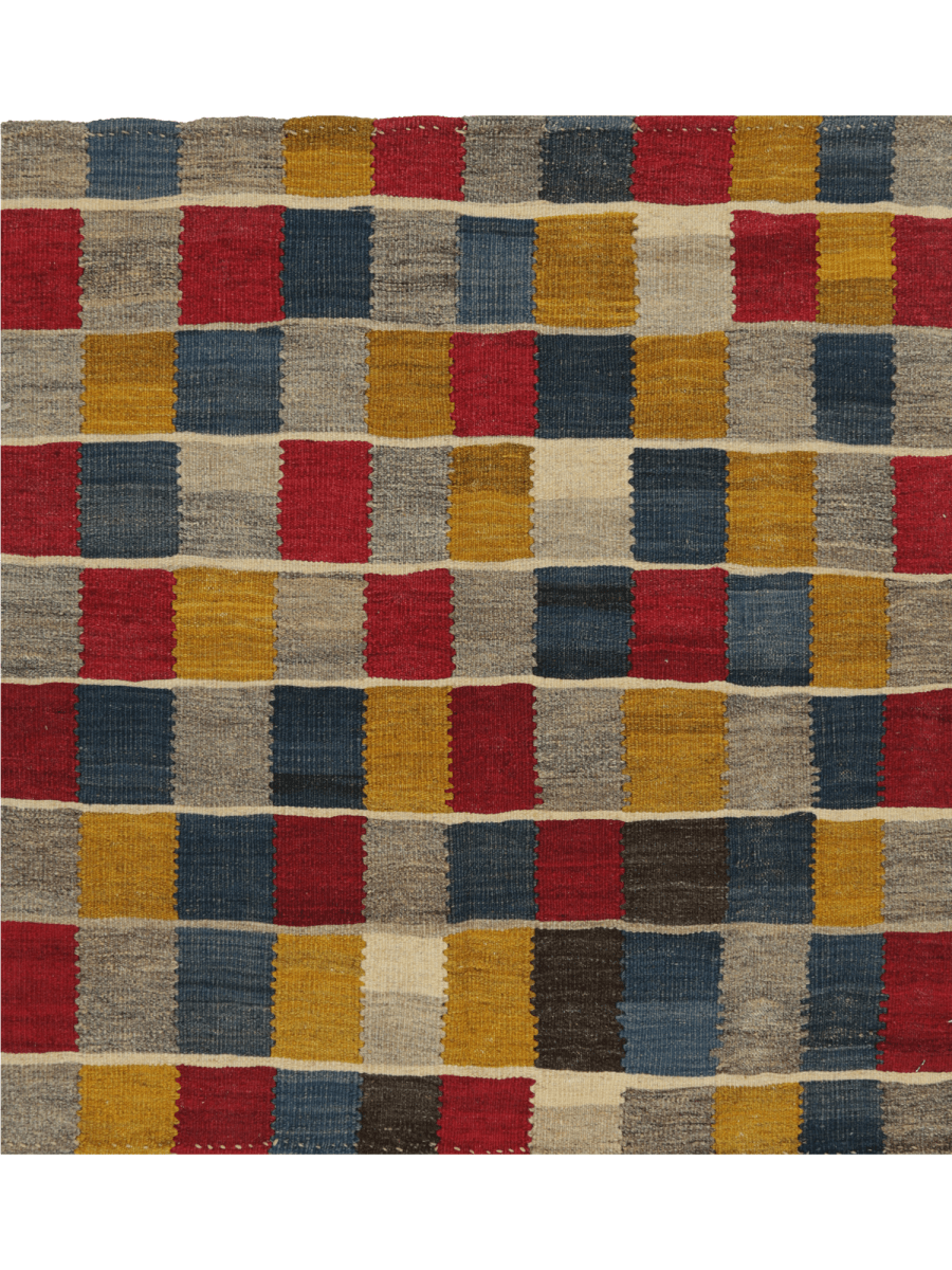 This 3x3 Persian Kilim rug showcases a striking patchwork pattern with small square blocks arranged in an irregular grid. The dynamic mosaic design features an artistic mix of red, mustard yellow, blue, gray, beige, and dark brown, creating a bold yet balanced look. Handwoven from high-quality wool in Persia, this flat-weave Kilim is both lightweight and durable, perfect for high-traffic areas. Its intricate craftsmanship and rich colors make it a captivating accent piece for any interior. The unique combination of textures and tones enhances its visual appeal. A timeless addition, it effortlessly brings warmth and character to any space.