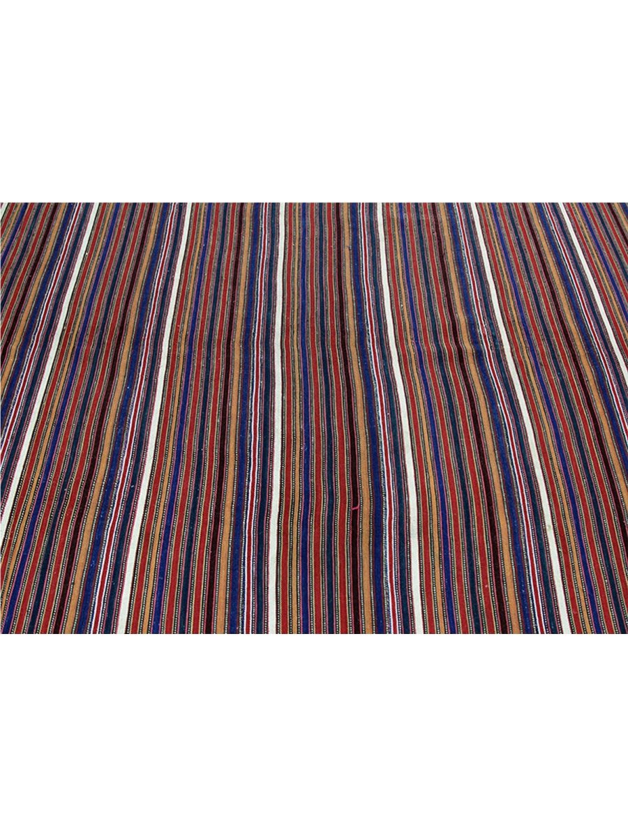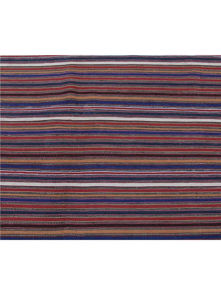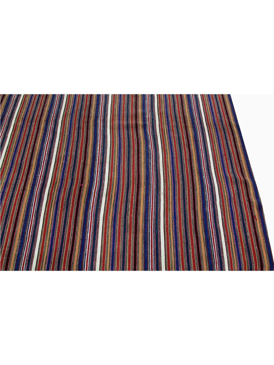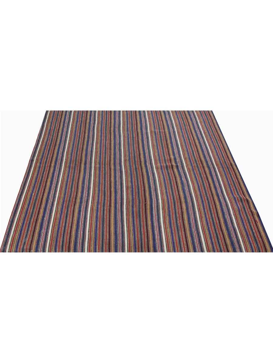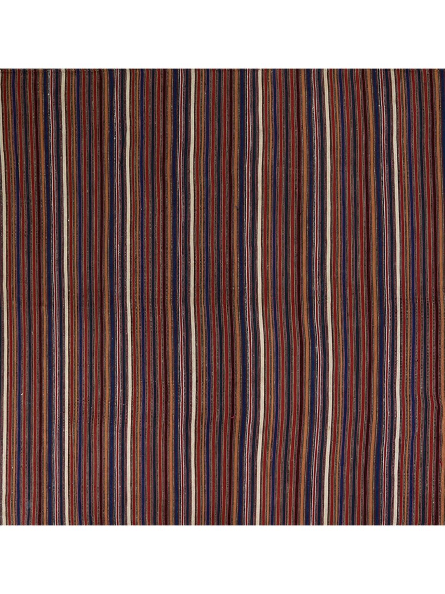 Enhance your space with this 6x6 Persian Kilim rug, featuring an elegant striped pattern in rust, cream, and brown. Hand-knotted from high-quality wool, this rug offers durability and softness underfoot. The warm color palette adds depth and character to any setting, complementing classic interiors. Free shipping within the US.