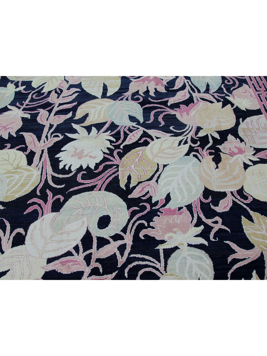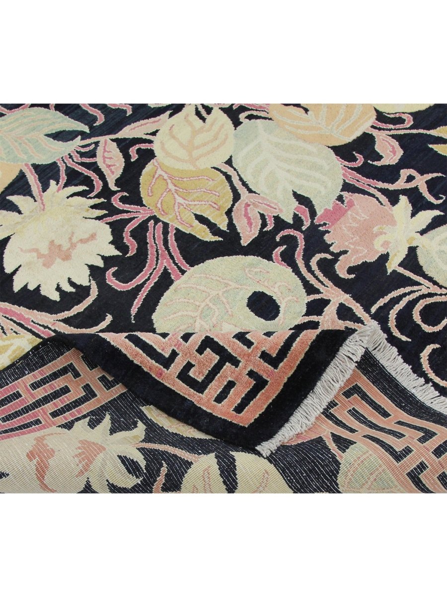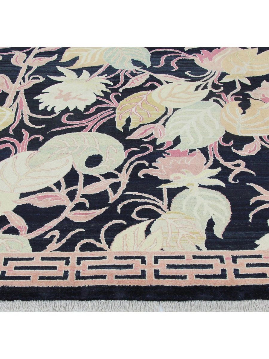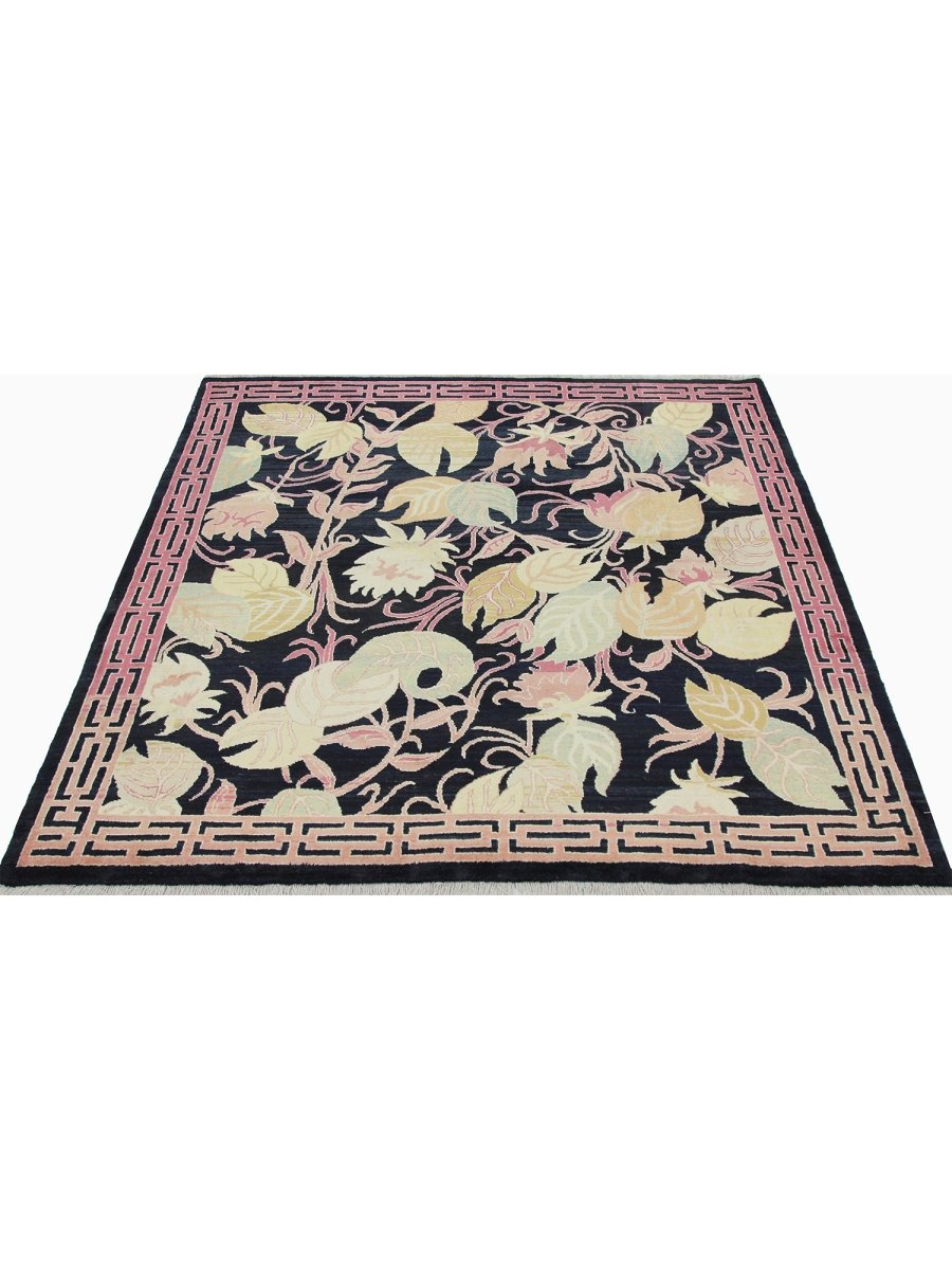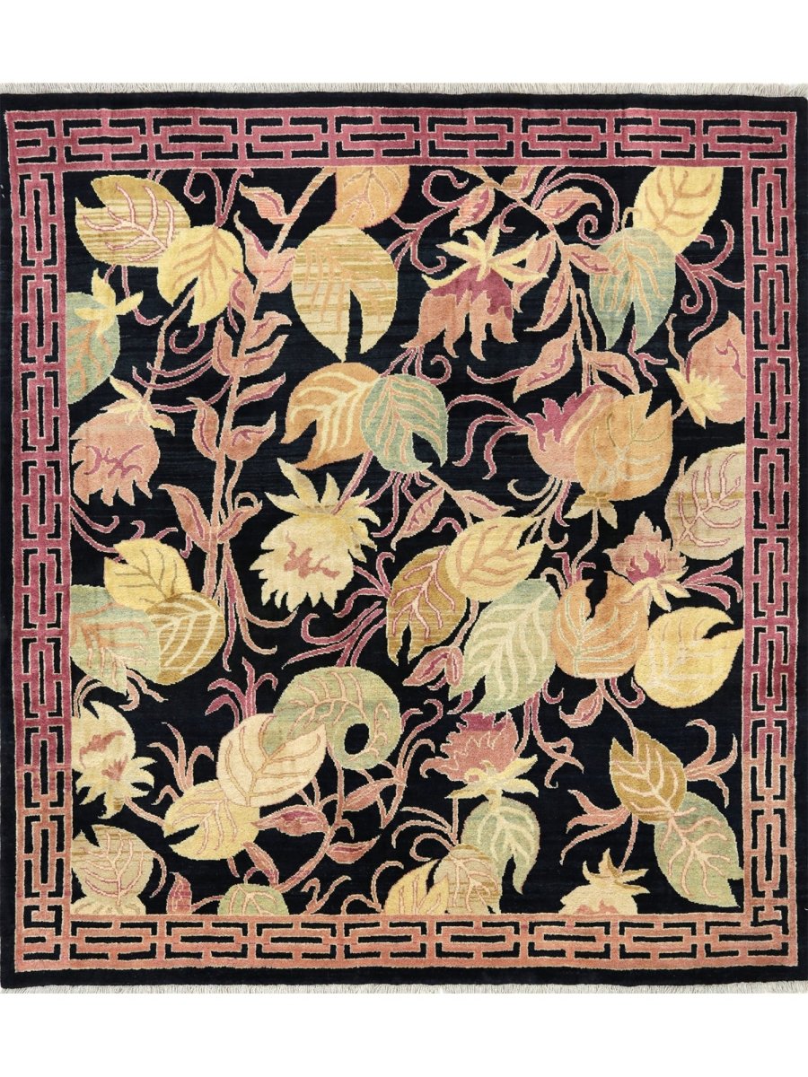 This captivating 7x7 Persian Shiraz area rug brings artistic expression and charm to any room. Handwoven by artisans of Persia, this piece reflects the rich weaving heritage and individual creativity often found in rugs from this area. Its unique square shape offers versatile placement options, perfect for defining a cozy bedroom or living room. The rug features a dramatic black, which provides a striking backdrop for an all-over pattern of large, stylized leaves and bold floral motifs.