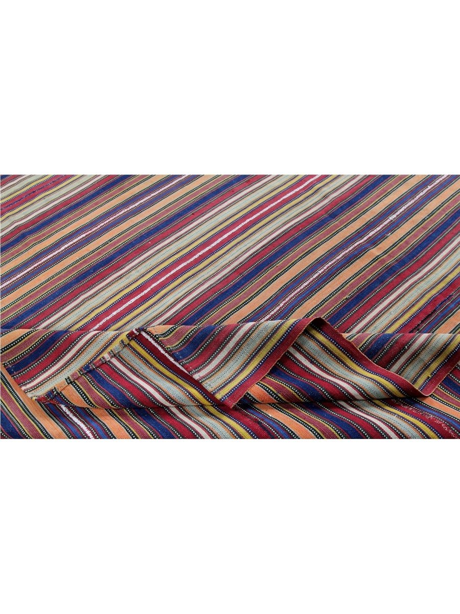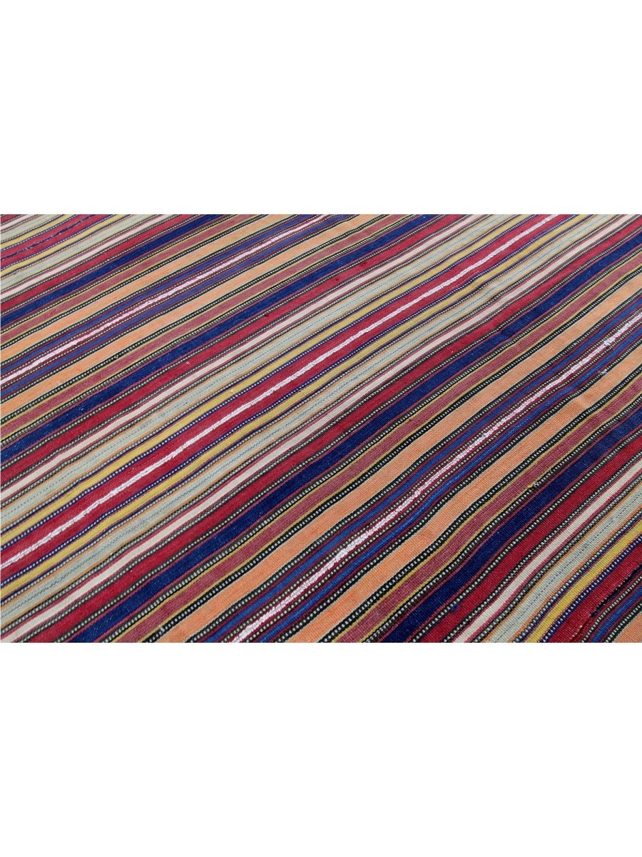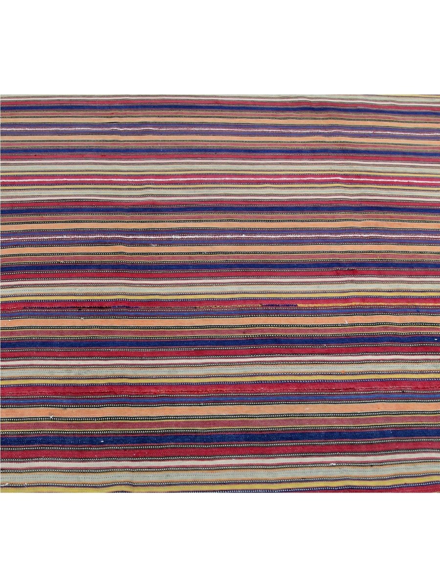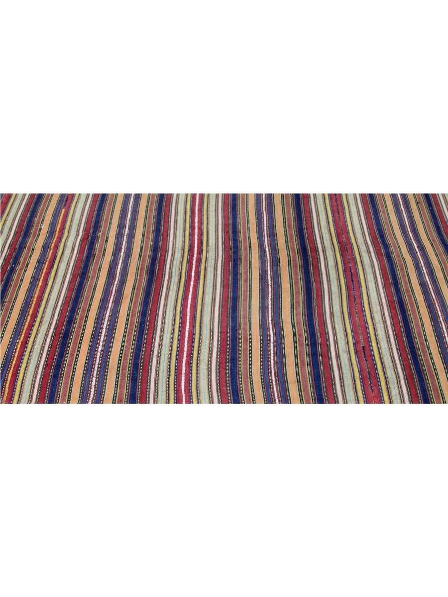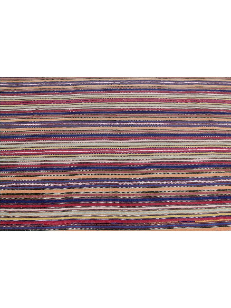 This 9x9 Old Persian Kilim Rug showcases a striking striped pattern in rich red, blue, peach, brown, and yellow hues, adding warmth and character to any space. Hand-knotted in Persia from high-quality wool, this flat-weave rug is durable and lightweight, making it an excellent choice for high-traffic areas. The bold yet harmonious color palette enhances its visual appeal, seamlessly complementing rustic, bohemian, or eclectic interiors. With its intricate craftsmanship and cultural significance, this Persian Kilim is a functional floor covering and a timeless decorative piece, bringing authenticity and charm to your home.
