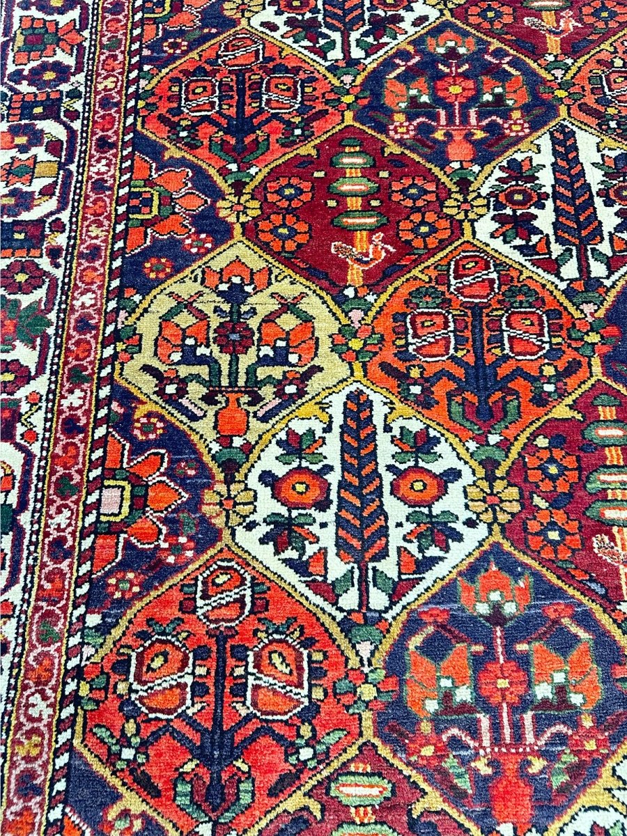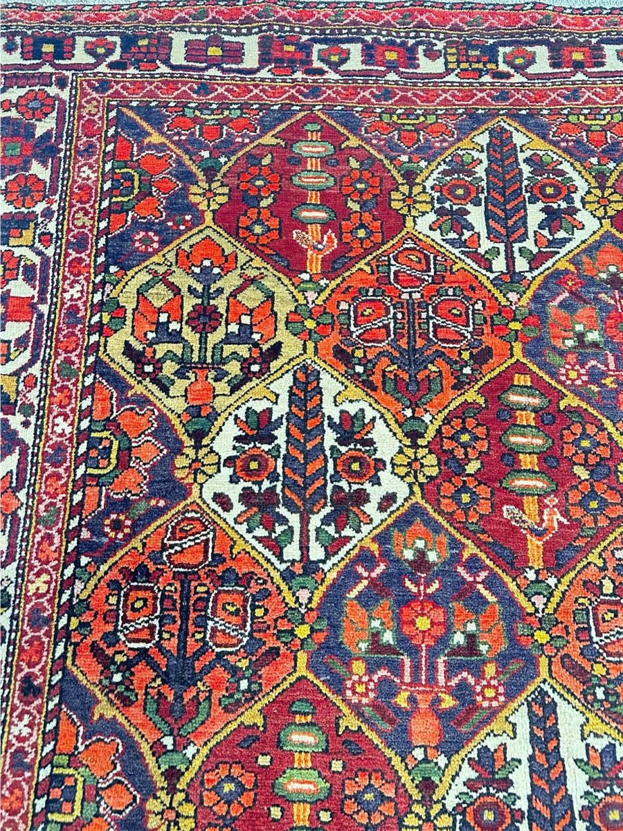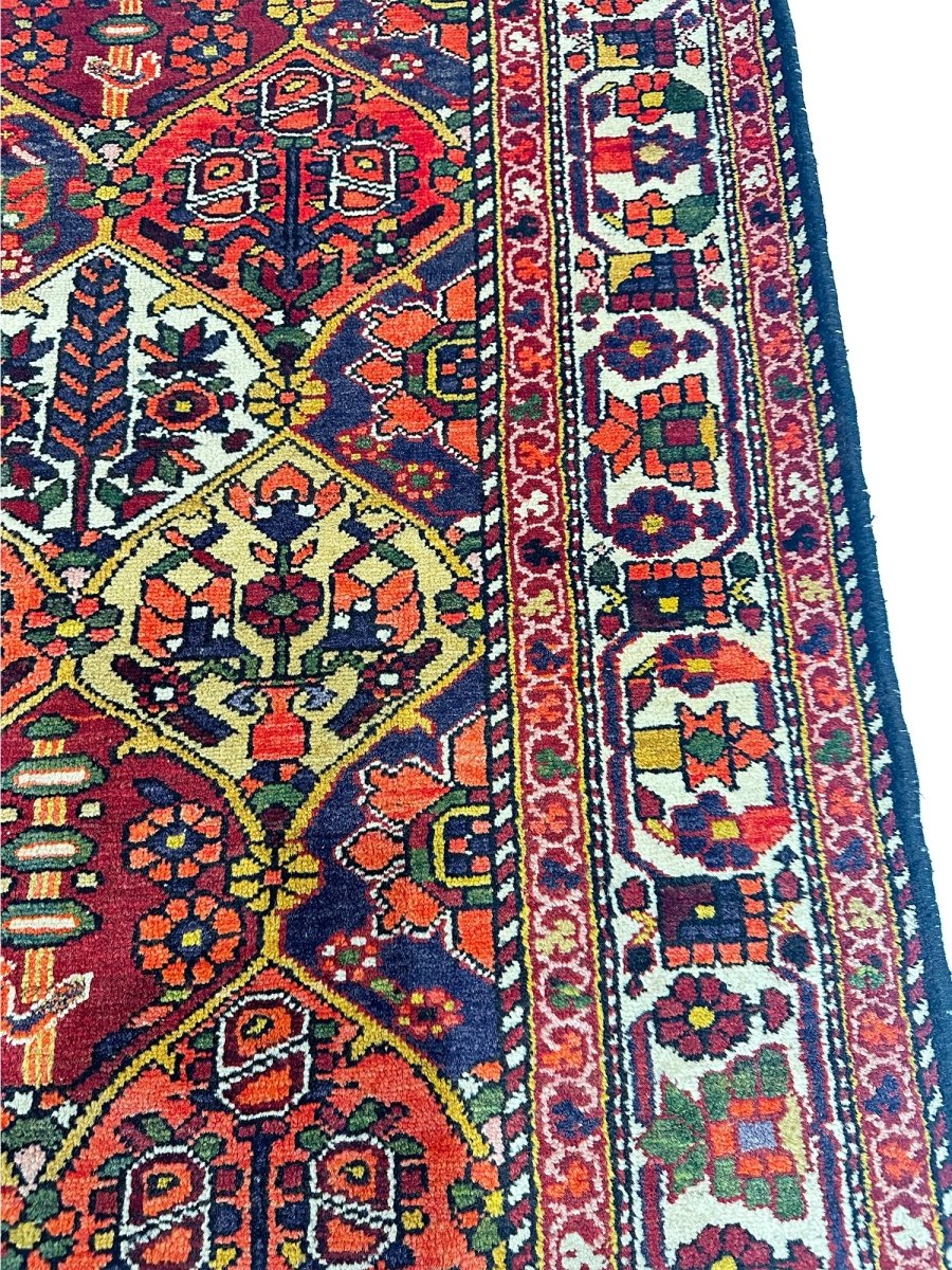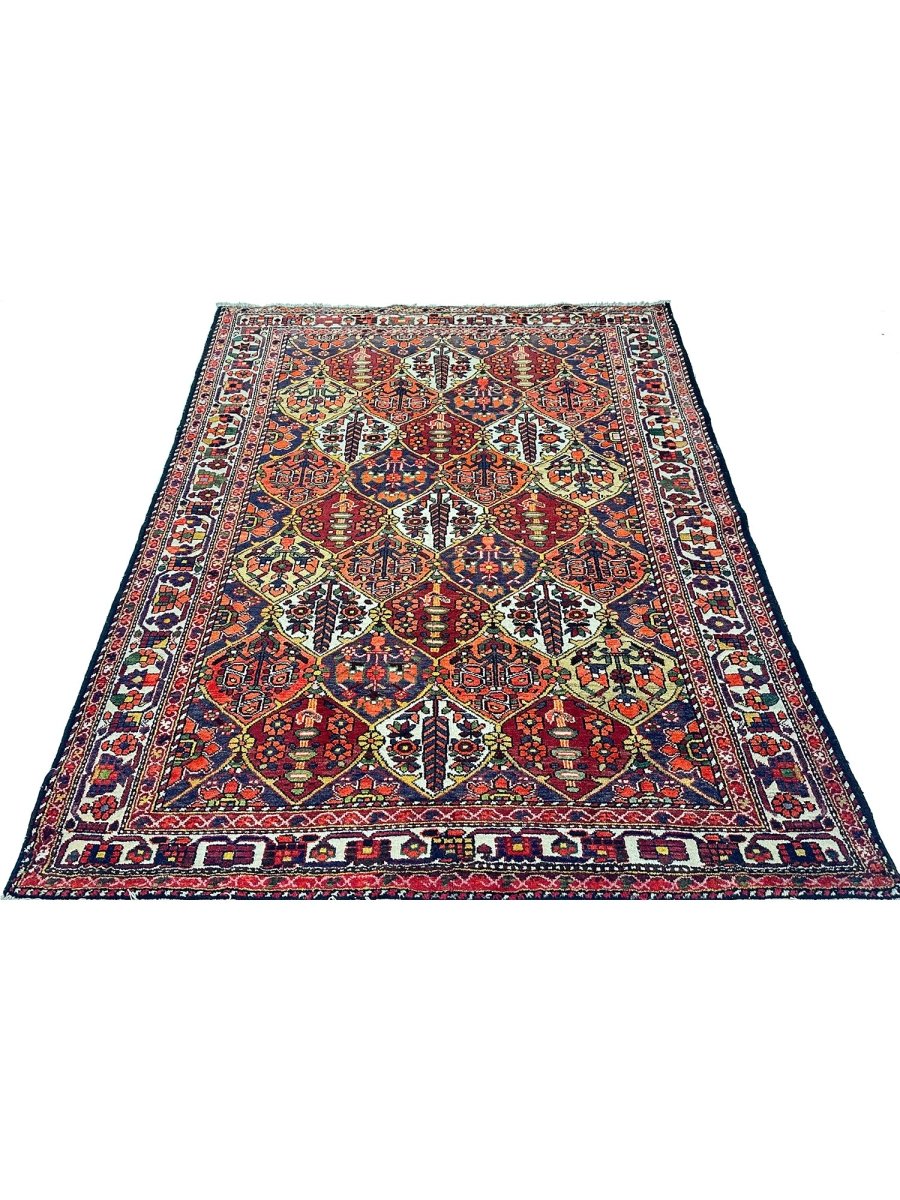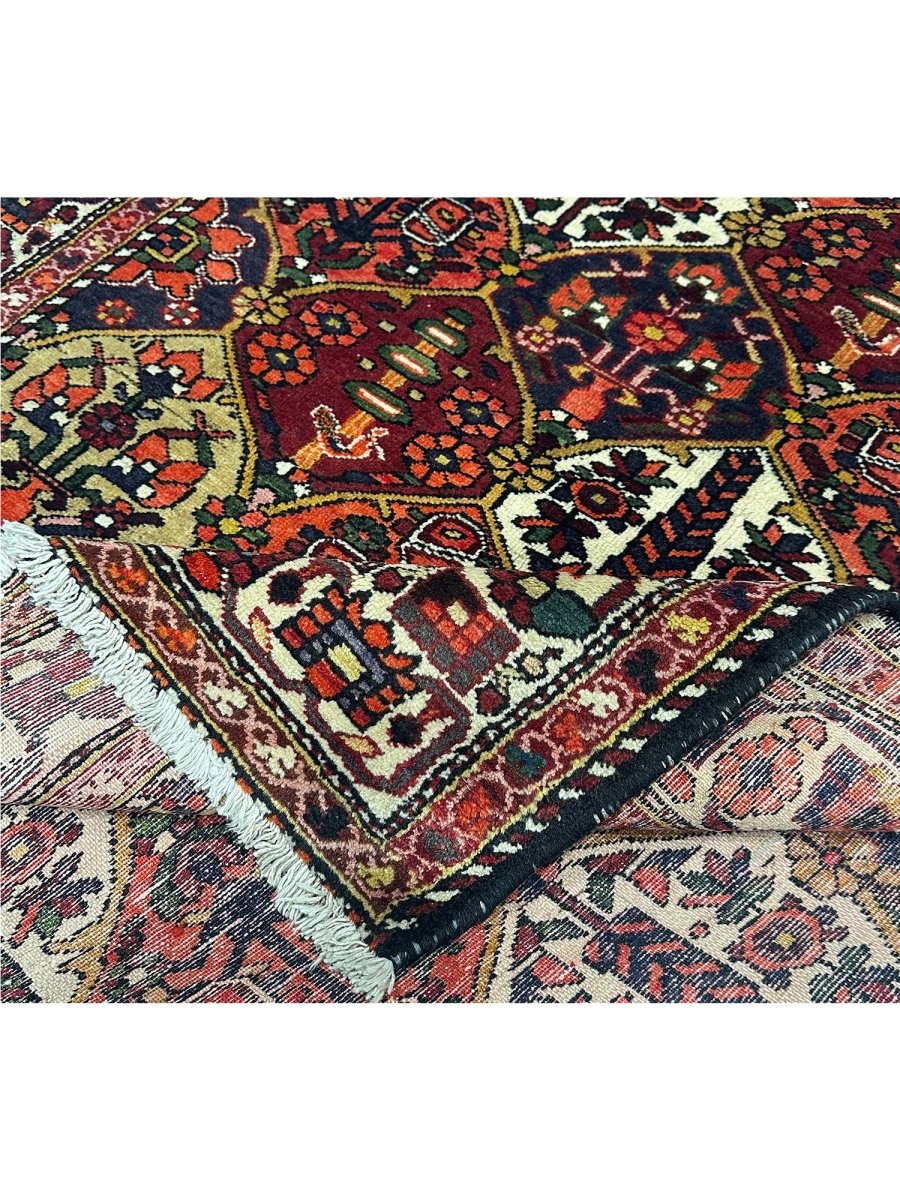5x7 Persian Bakhtiari area rug, a sophisticated piece that adds charm to your interior. Intricate repeated geometric design that gives modern touches with a color palette of rust, red, blues, and ivory. Skillfully handcrafted by talented craftsmen of Persia with fine-quality wool, ensures the durability and softness of the rug. Get the benefit from our complimentary shipping services.