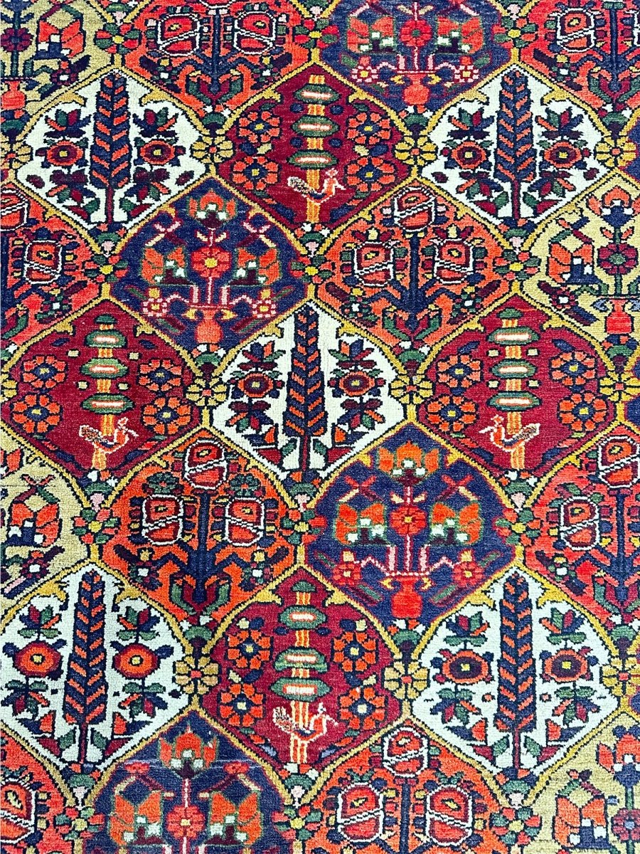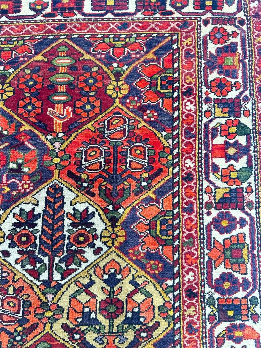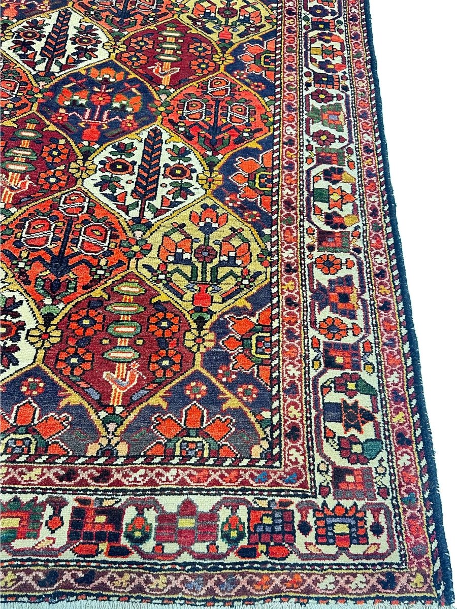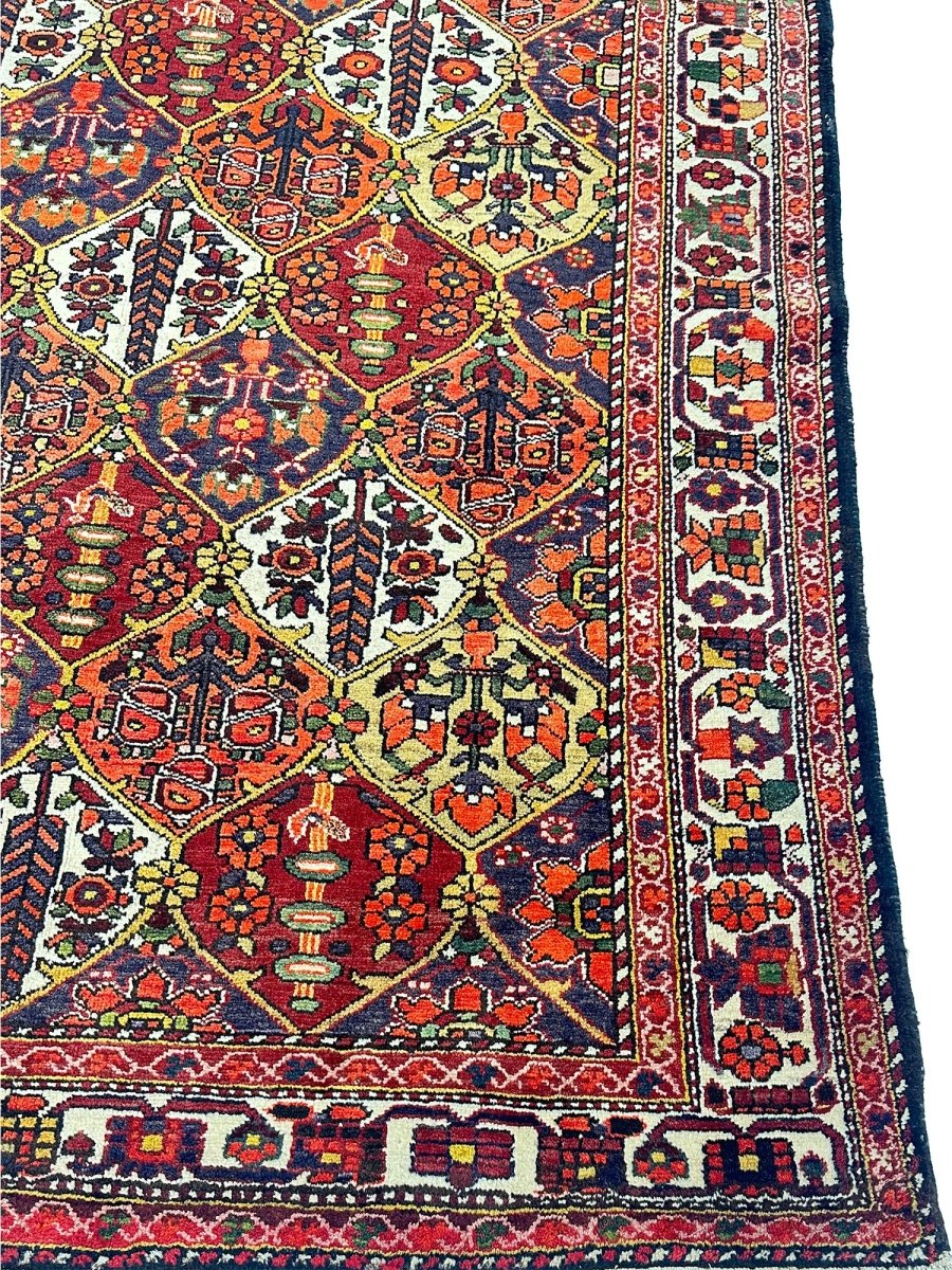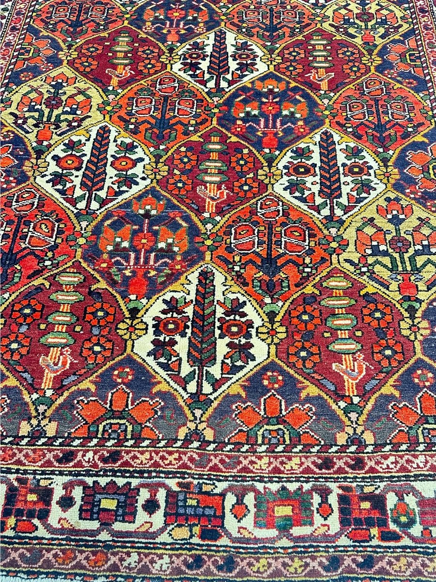 5x7 Persian Bakhtiari area rug, a sophisticated piece that adds charm to your interior. Intricate repeated geometric design that gives modern touches with a color palette of rust, red, blues, and ivory. Skillfully handcrafted by talented craftsmen of Persia with fine-quality wool, ensures the durability and softness of the rug. Get the benefit from our complimentary shipping services.