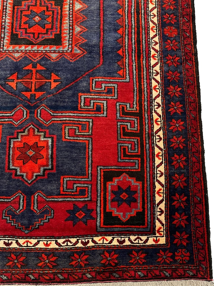 A true classic Persian Hamedan hand-knotted 5x7 rug with loud colors and detailed medallion designs. Designed by a hard-working artisan in Persia with durable wool, which benefits you with the qualities of endurance and softness in your home. This rug features beautiful borders and a center design in vibrant, bold colors of navy blue and red, which gives it a luxurious and sophisticated feel. Order now and enjoy our free shipping offer all across the US.
