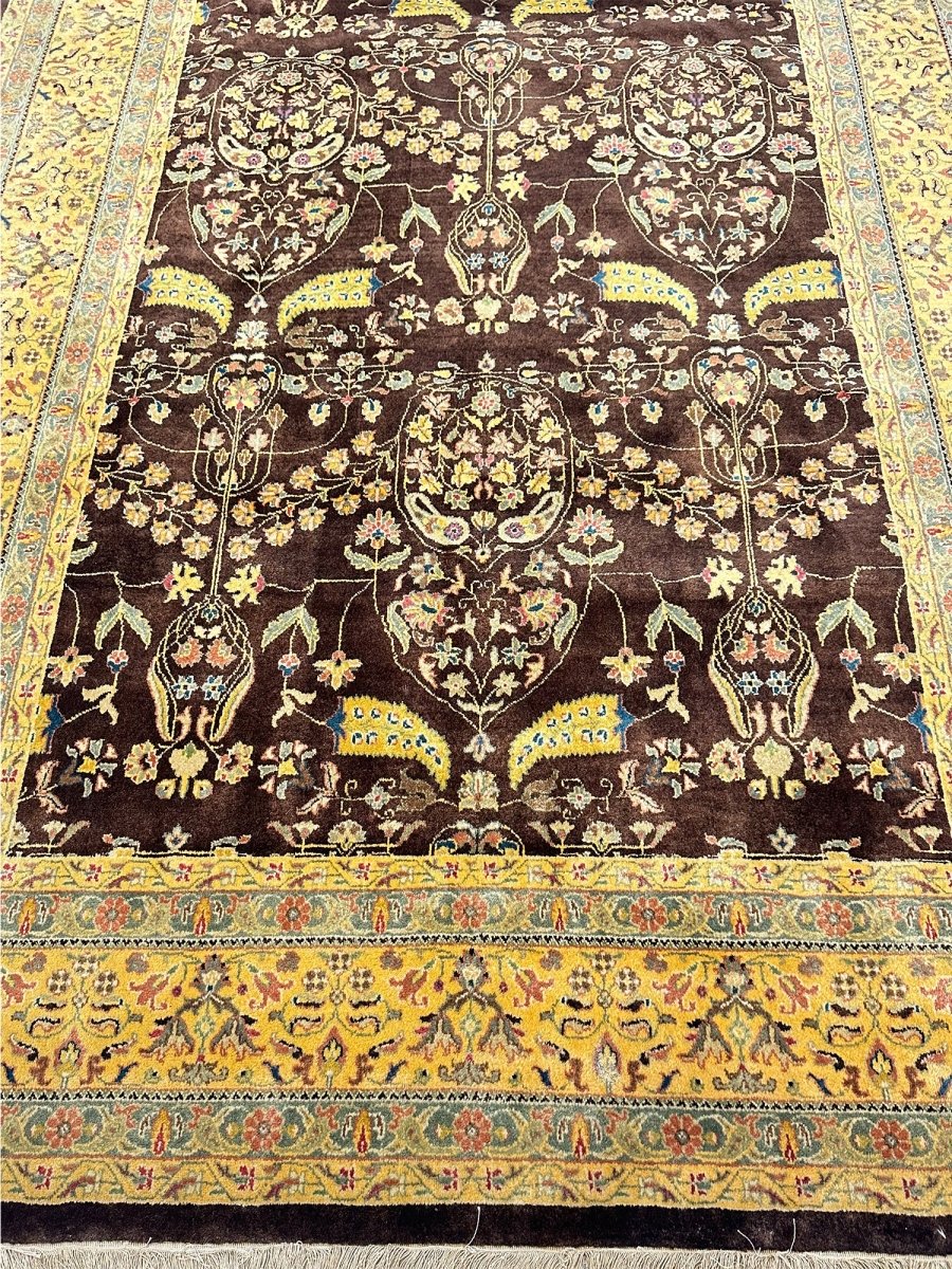 6x9 Persian Tabriz-style area rug, sophisticated beauty that adds depth and character to any space with its bold geometric design and dark-toned black center, accompanied by wide borders in brown, black, and gold. A handwoven luxury from India, made with top-quality wool for durability and comfort. This rug brings sophistication and warmth to any area it is placed in. Enjoy our convenient and free US shipping.