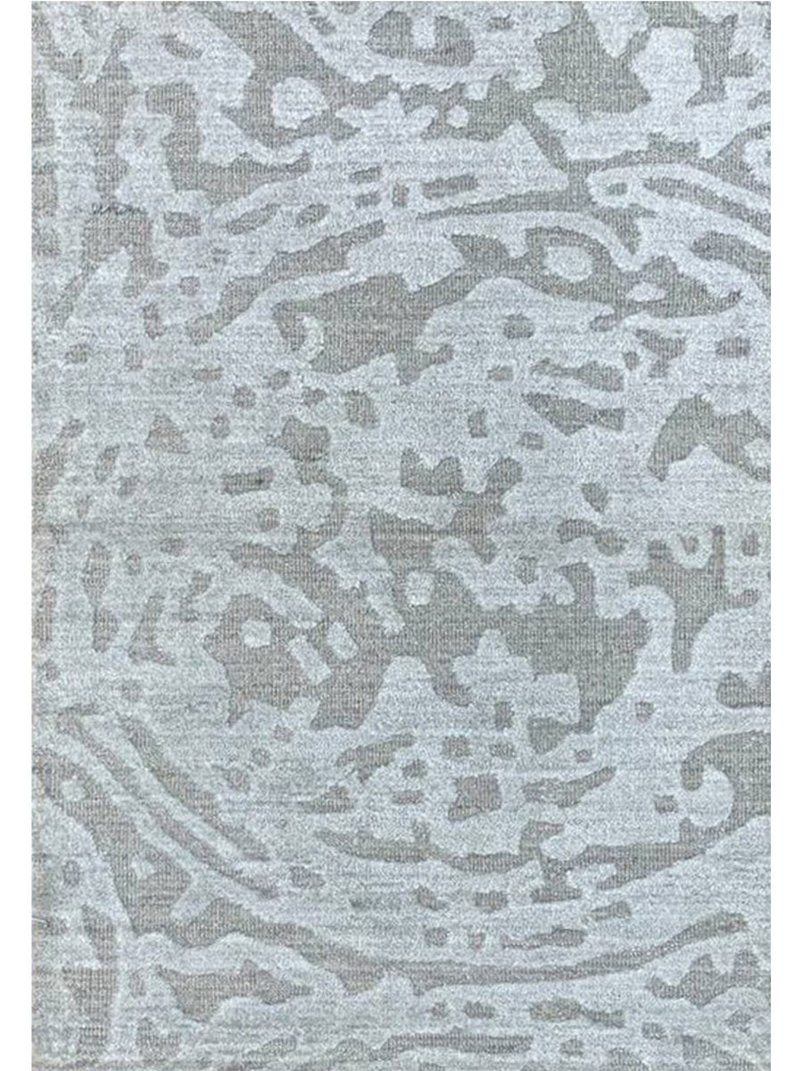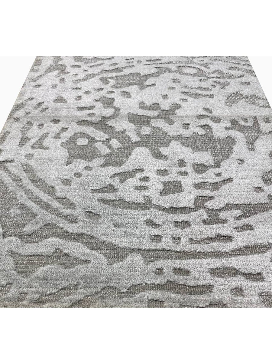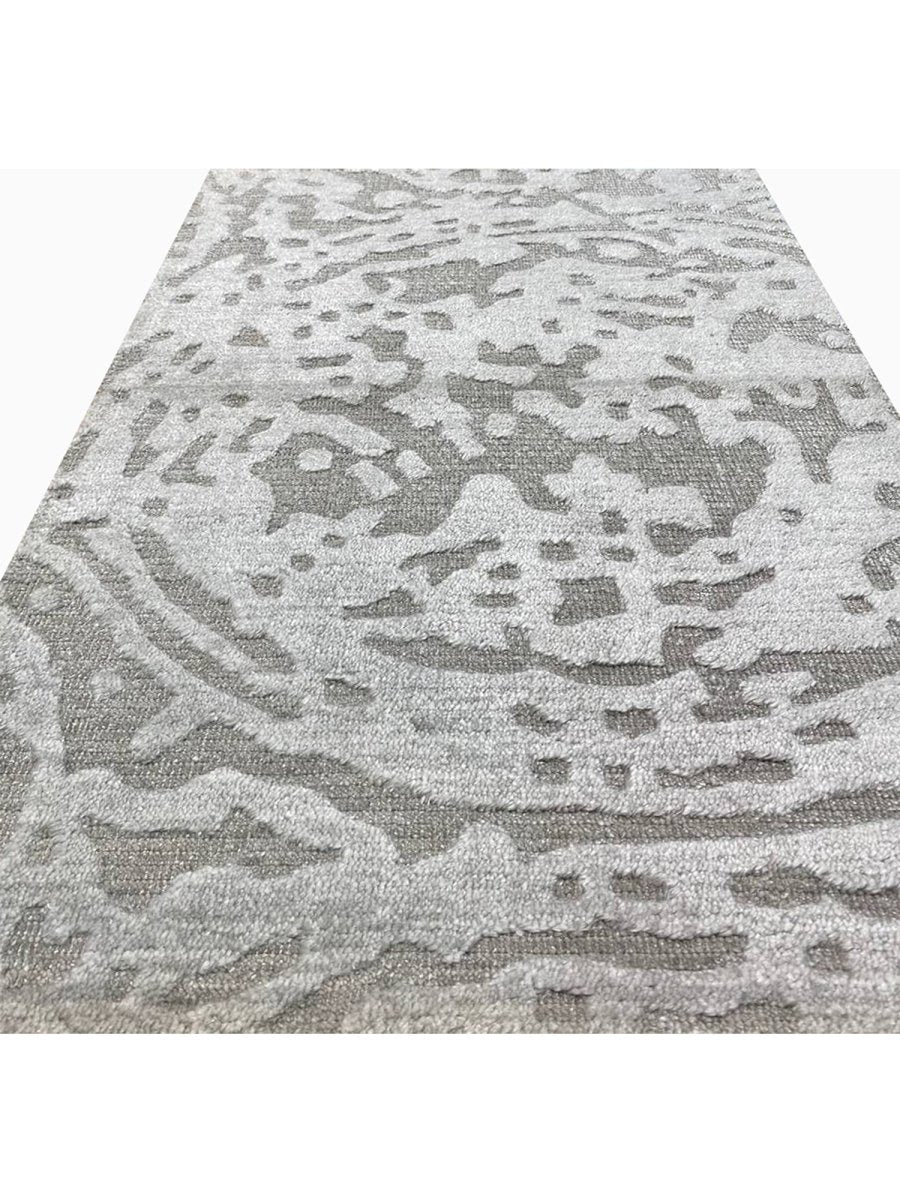 This 2x3 modern abstract area rug blends refined craftsmanship with striking contemporary style. Hand-loomed in India from a premium blend of high-quality wool and luminous bamboo silk, it showcases exceptional artistry and a captivating abstract pattern with a dynamic flow of organic shapes. The sophisticated color palette highlights various shades of light and dark gray, creating a visually engaging and elegant rug.