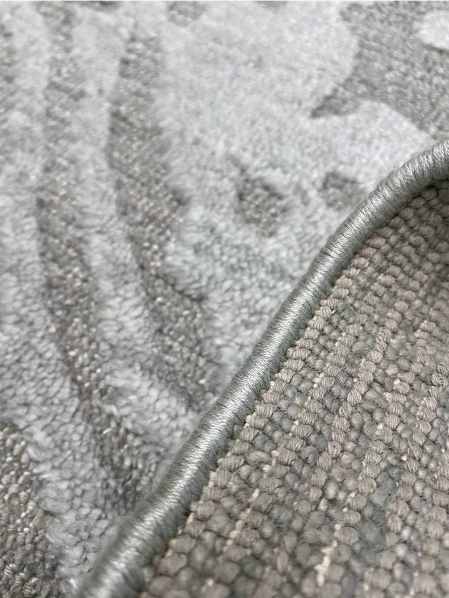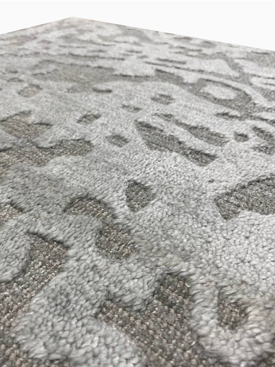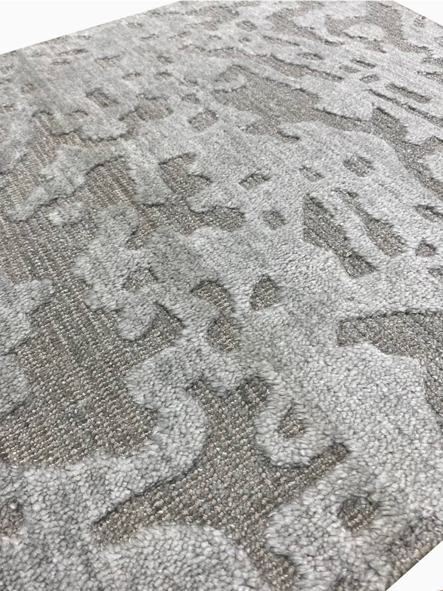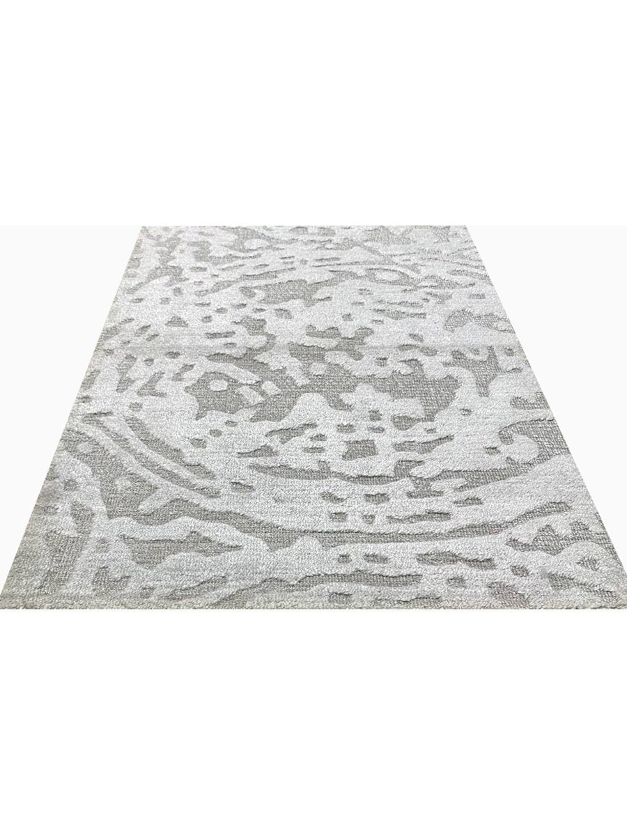 This 2x3 modern abstract area rug blends refined craftsmanship with striking contemporary style. Hand-loomed in India from a premium blend of high-quality wool and luminous bamboo silk, it showcases exceptional artistry and a captivating abstract pattern with a dynamic flow of organic shapes. The sophisticated color palette highlights various shades of light and dark gray, creating a visually engaging and elegant rug.