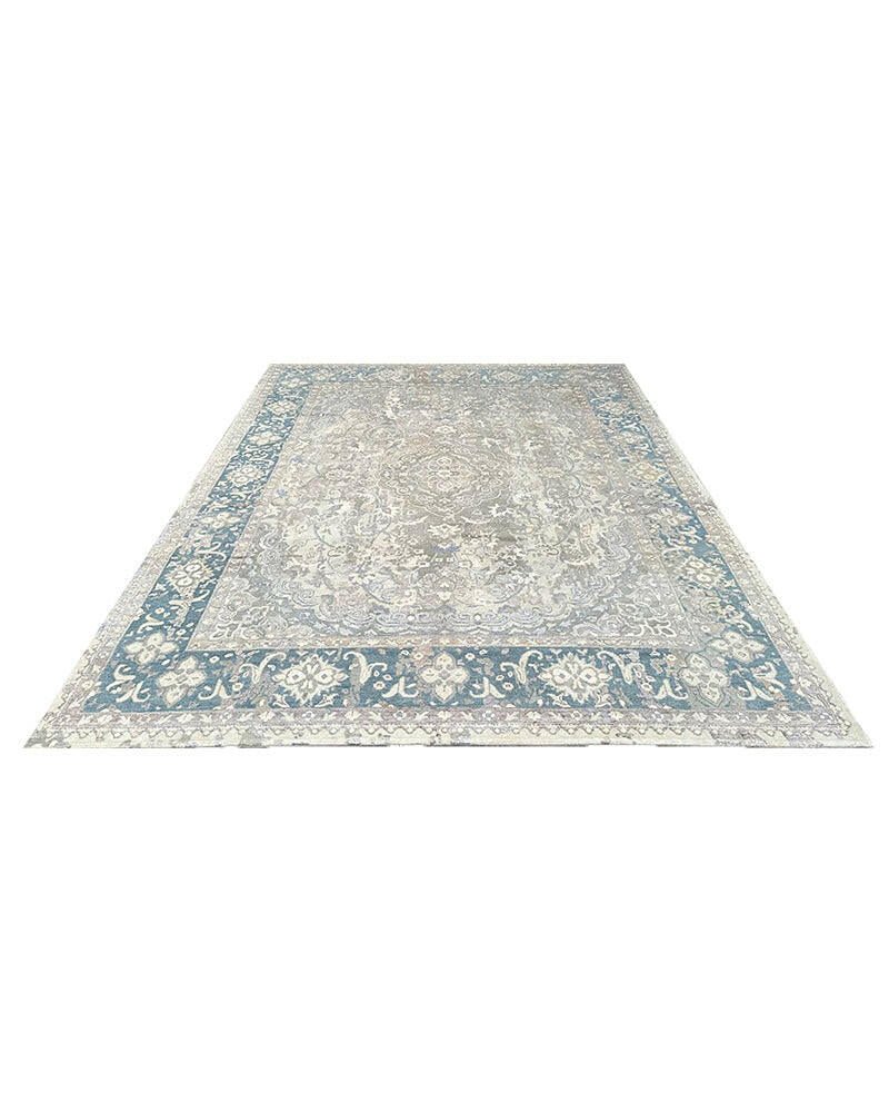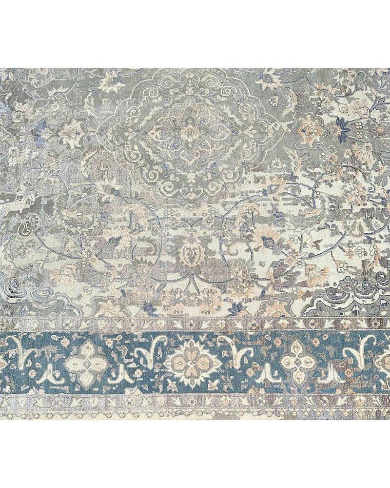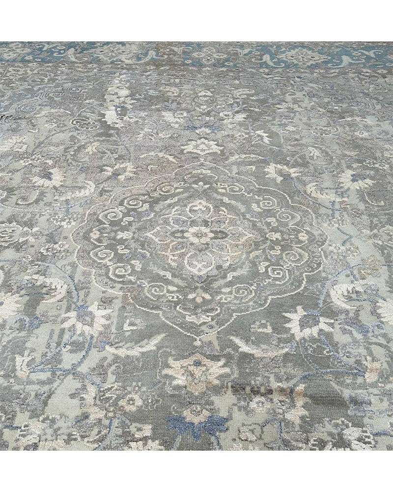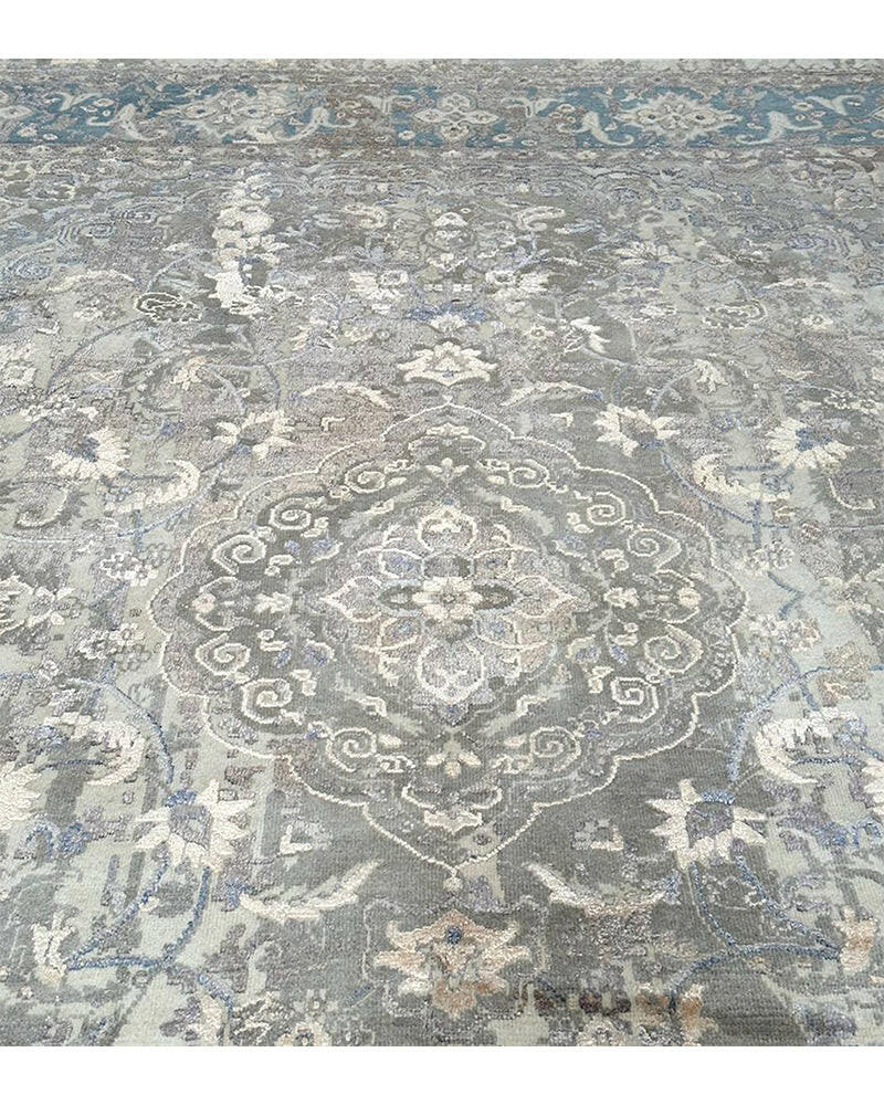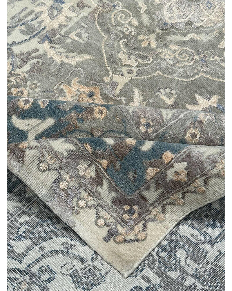 Immerse your space in the sophisticated charm of this magnificent 8x10 Transitional area rug. Handwoven by skilled artisans in India, this piece showcases an elegant blend of beige, ivory, blue, and gray tones, creating a versatile aesthetic that complements a wide range of interior styles. The detailed medallion pattern is beautifully rendered, adding an intricate and harmonious focal point. Crafted from a luxurious blend of premium wool and bamboo silk, this rug offers a soft, inviting texture underfoot while ensuring long-lasting durability and resilience.