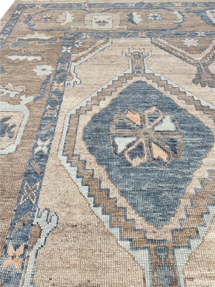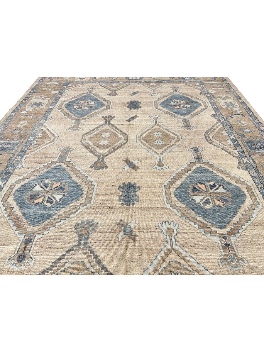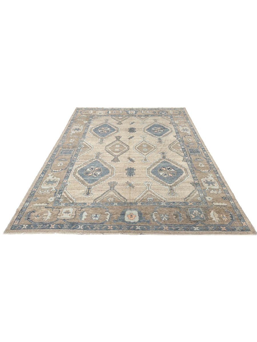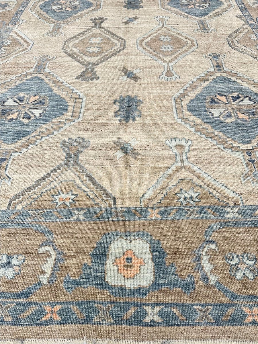 The muted colors of soft creams, dusty blues, and earthy browns make this rug a valuable addition to any contemporary or traditional interiors. Hand-knotted using premium wool, this piece is surely a hallmark of authentic Oushak craftsmanship. Enjoy our free shipping services in the US.