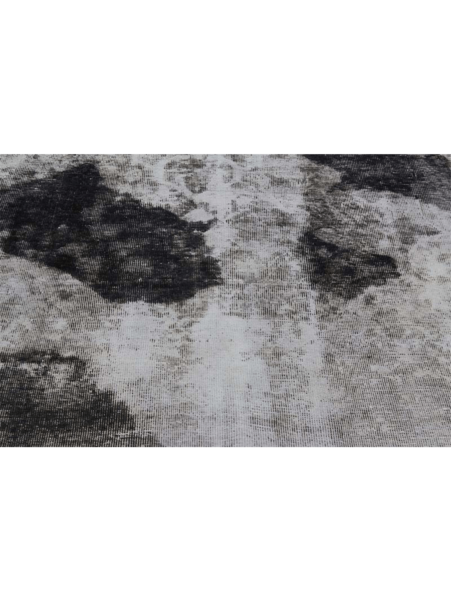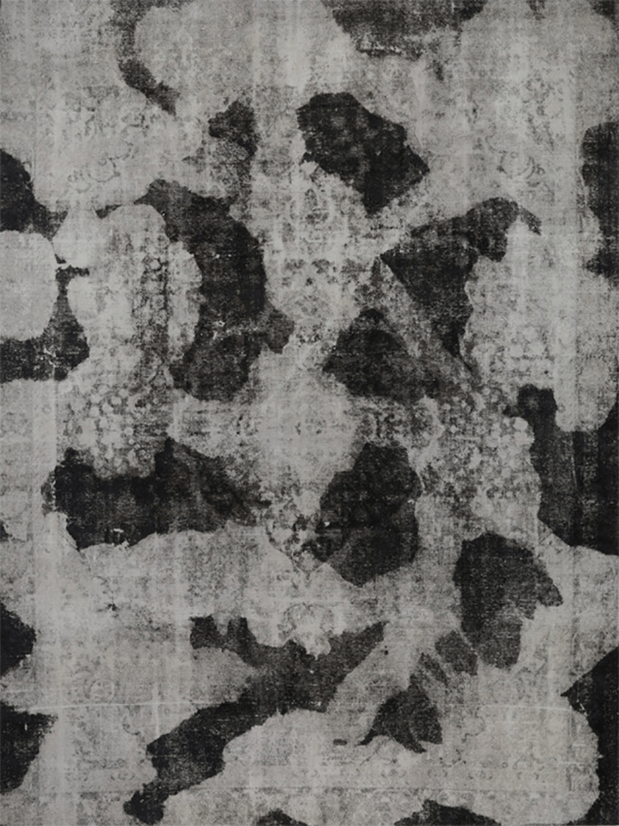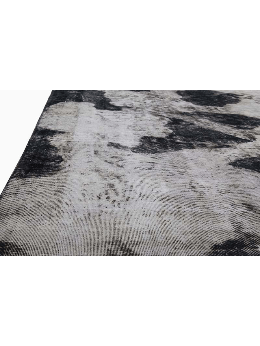 This 9x12 Vintage Persian Rug is one-of-a-kind, handwoven from wool and designed with a bold, distressed no-border pattern. A fusion of deep black, slate, charcoal, gray, and faded ivory tones creates a moody and abstract presence across its large surface. The overdyed finish gives the motifs a softened, aged look that feels collected and expressive.