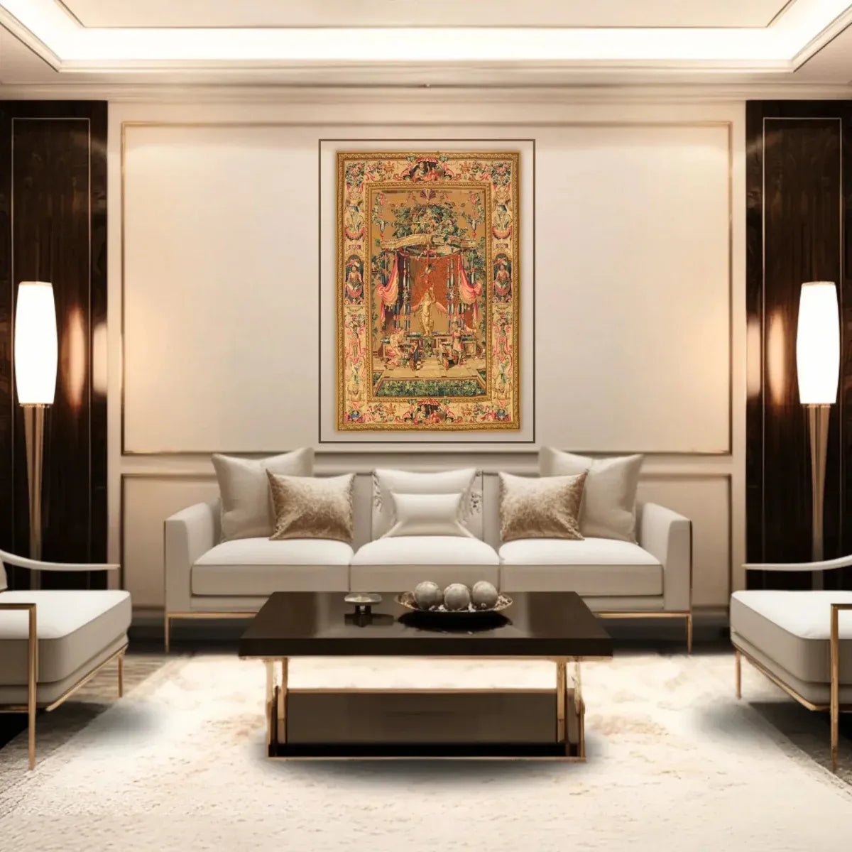 Transform your space with the classic elegance of this 6x9 17th-century wall Tapestry rug. Expertly handwoven in China from premium materials, this tapestry features a striking pictorial pattern in deep red, gold, and beige tones, exuding timeless charm and sophistication. Its durable construction and intricate design make it an ideal piece for walls of living rooms or large open areas. Crafted for both beauty and longevity, this tapestry enhances any classic or diverse decor with its unique appeal and exceptional quality. Shop now to avail the benefit of fast and free shipping in the United States to make this beautiful piece a perfect addition to your home.