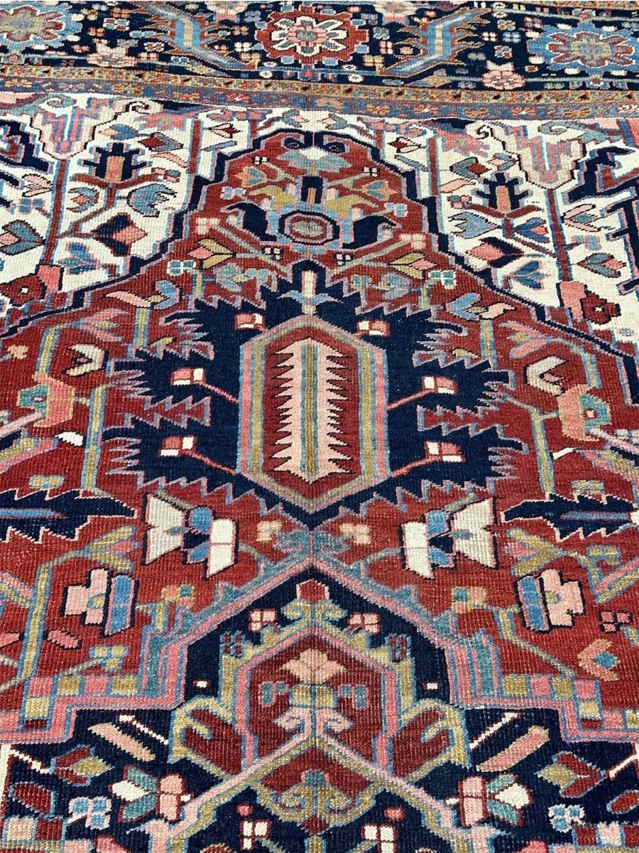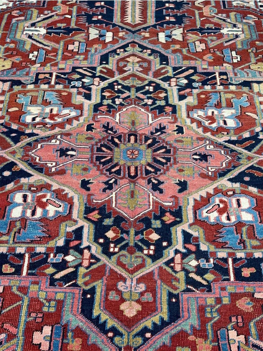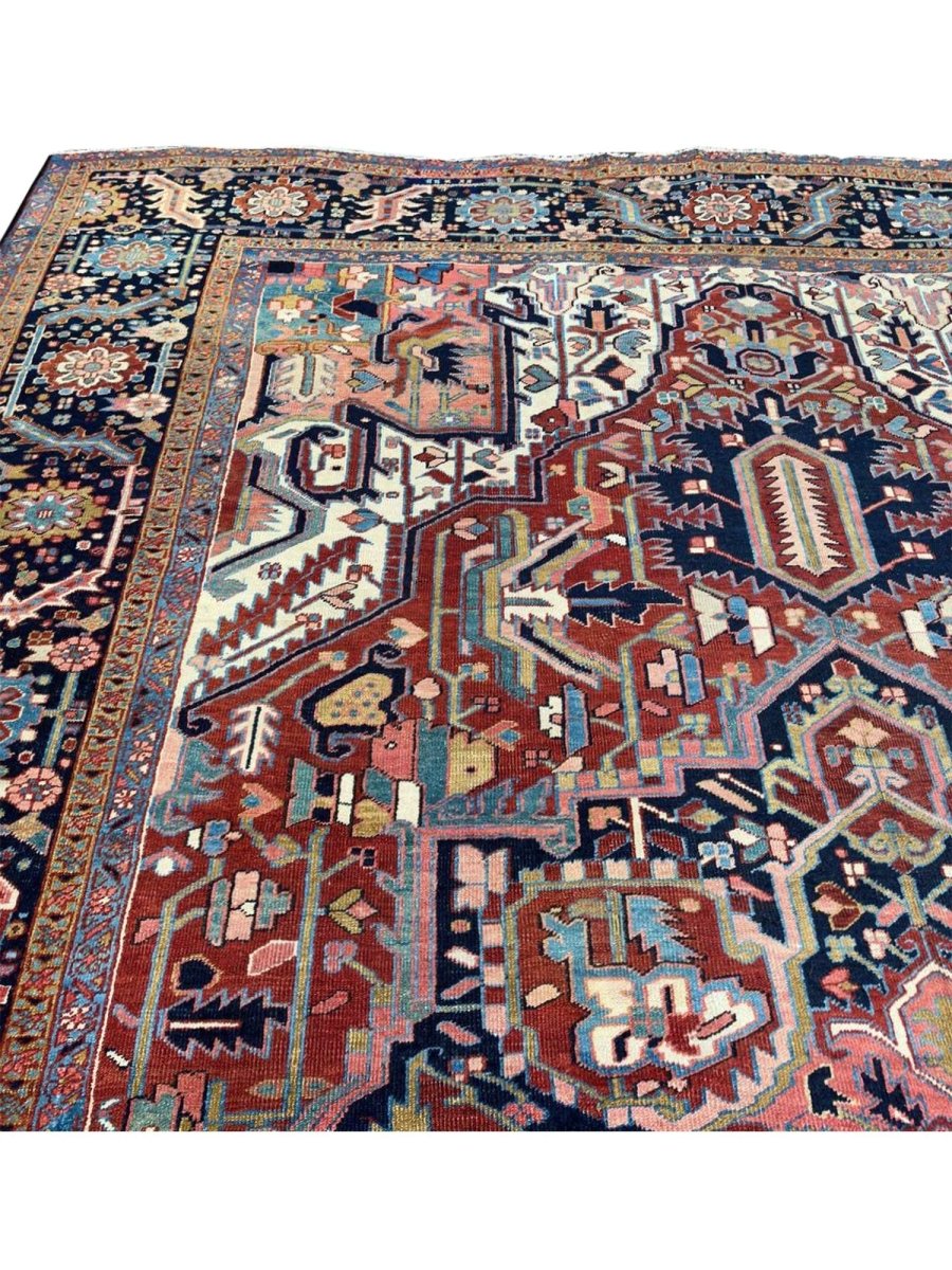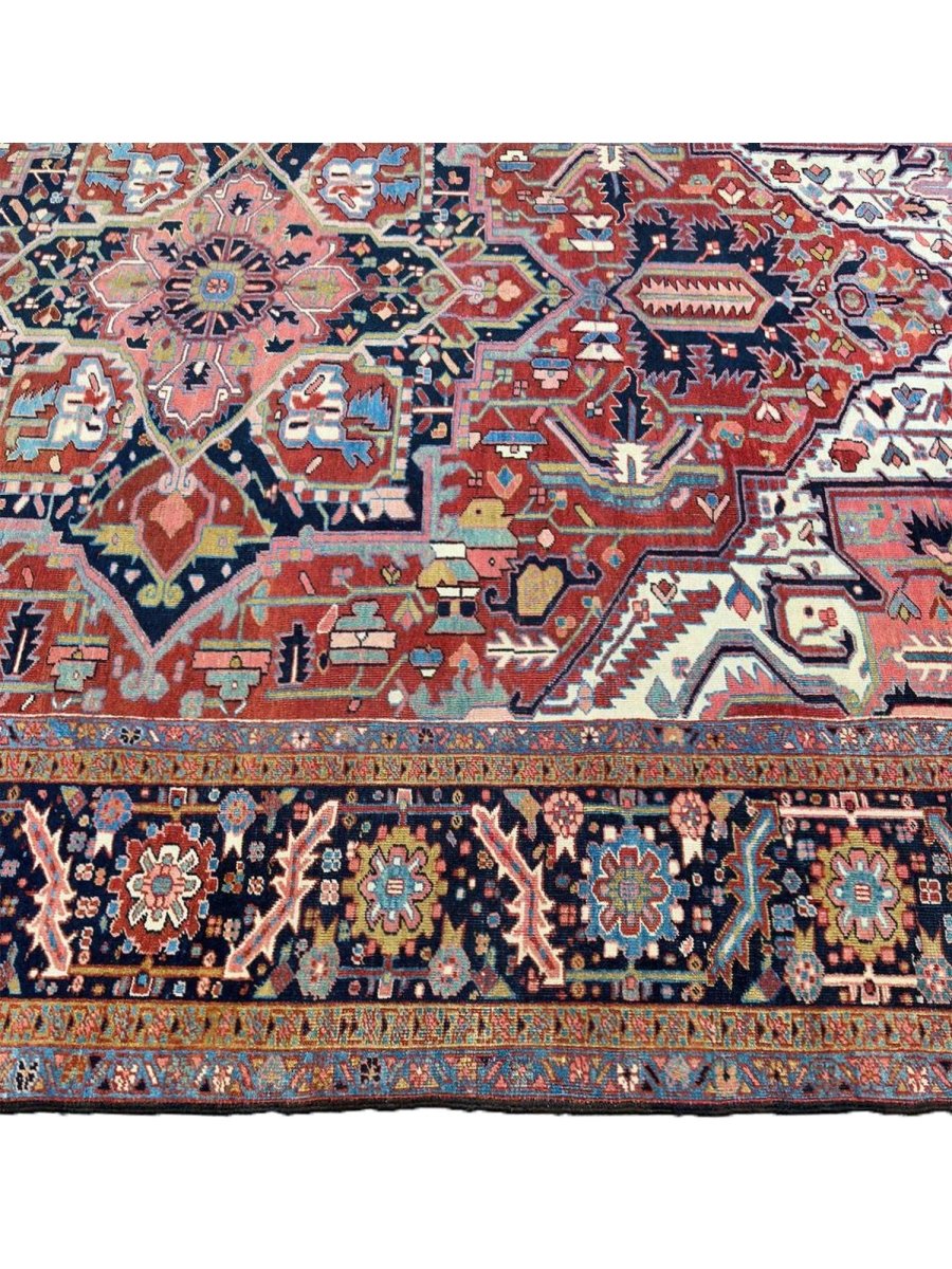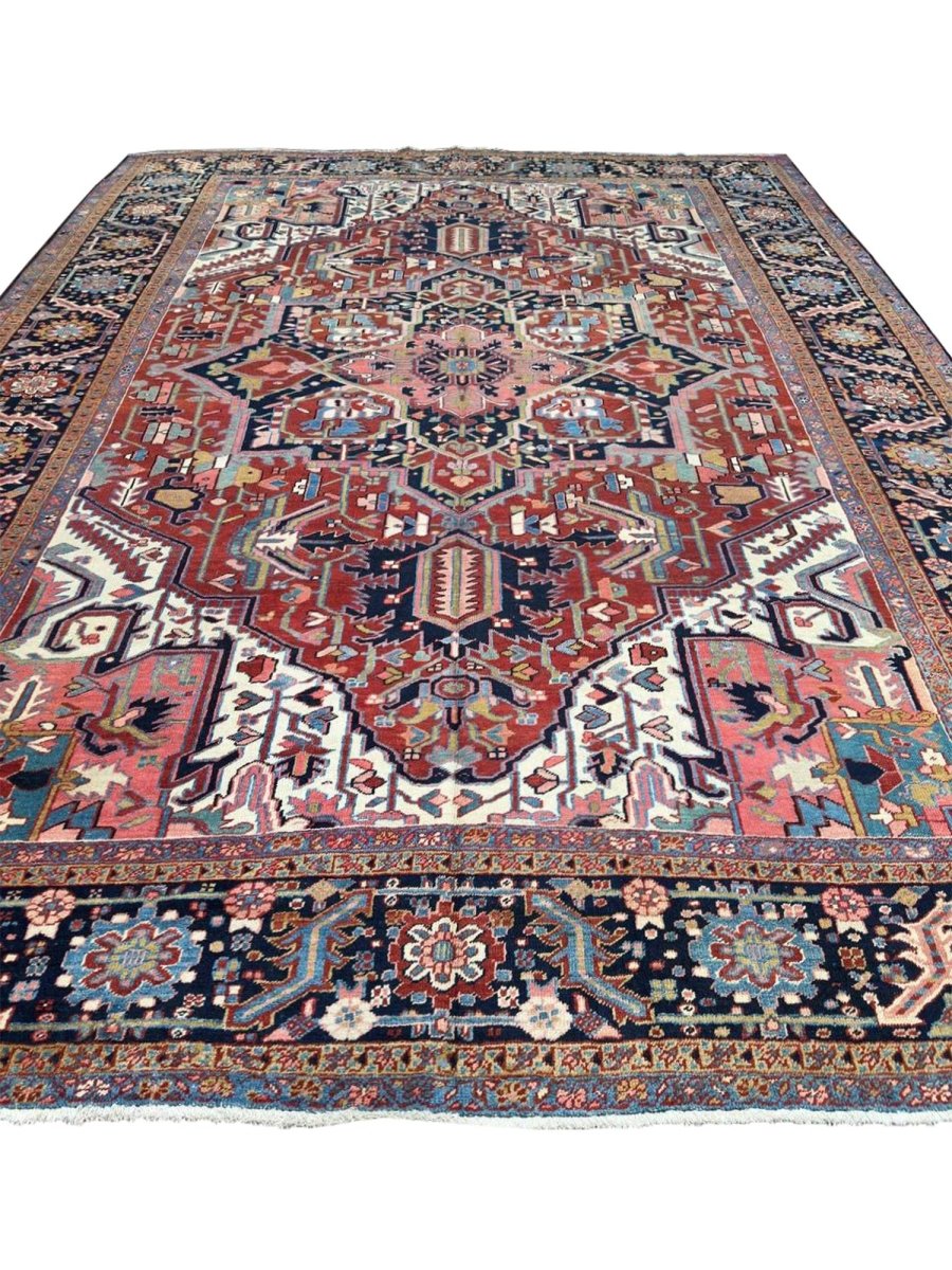 Decorate your space with the striking beauty of this 11x14 Antique Persian Heriz area rug. The magnificent rug is handmade in Persia from wool and showcases a commanding central medallion design. The background presents beautiful tones of red and ivory, providing the classic backdrop to intricate design. The rich geometric motifs have a color palette of blue, beige, and green accents. This generously sized piece is perfect for anchoring spacious bedrooms, living rooms, or dining areas. Crafted with traditional hand-making techniques, this wool rug offers enduring durability and a soft touch underfoot. Enjoy the convenience of free and fast delivery within the United States.