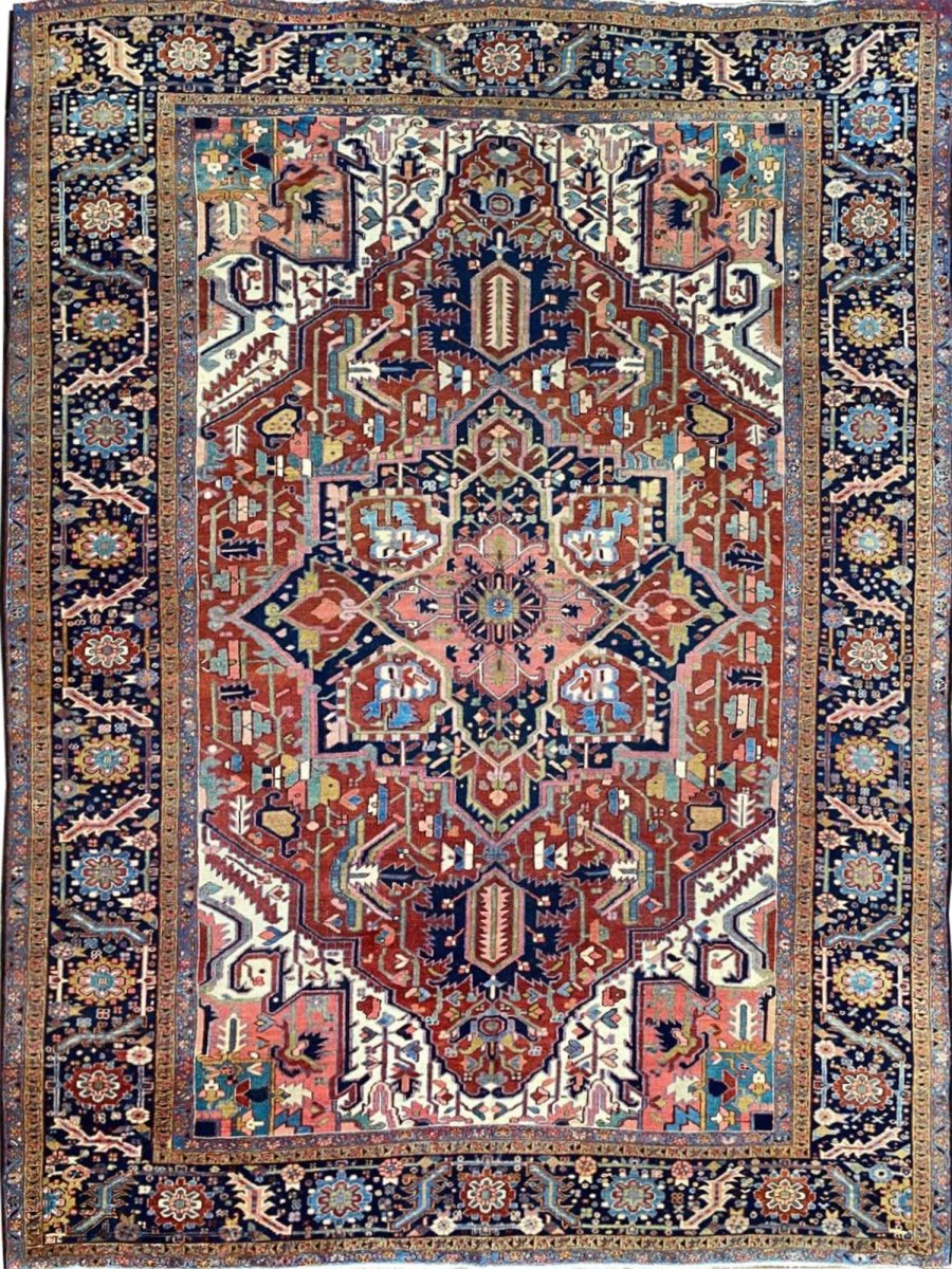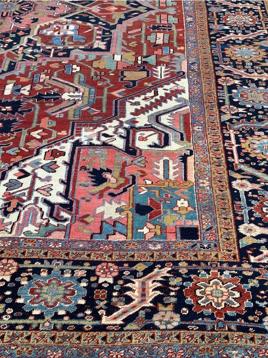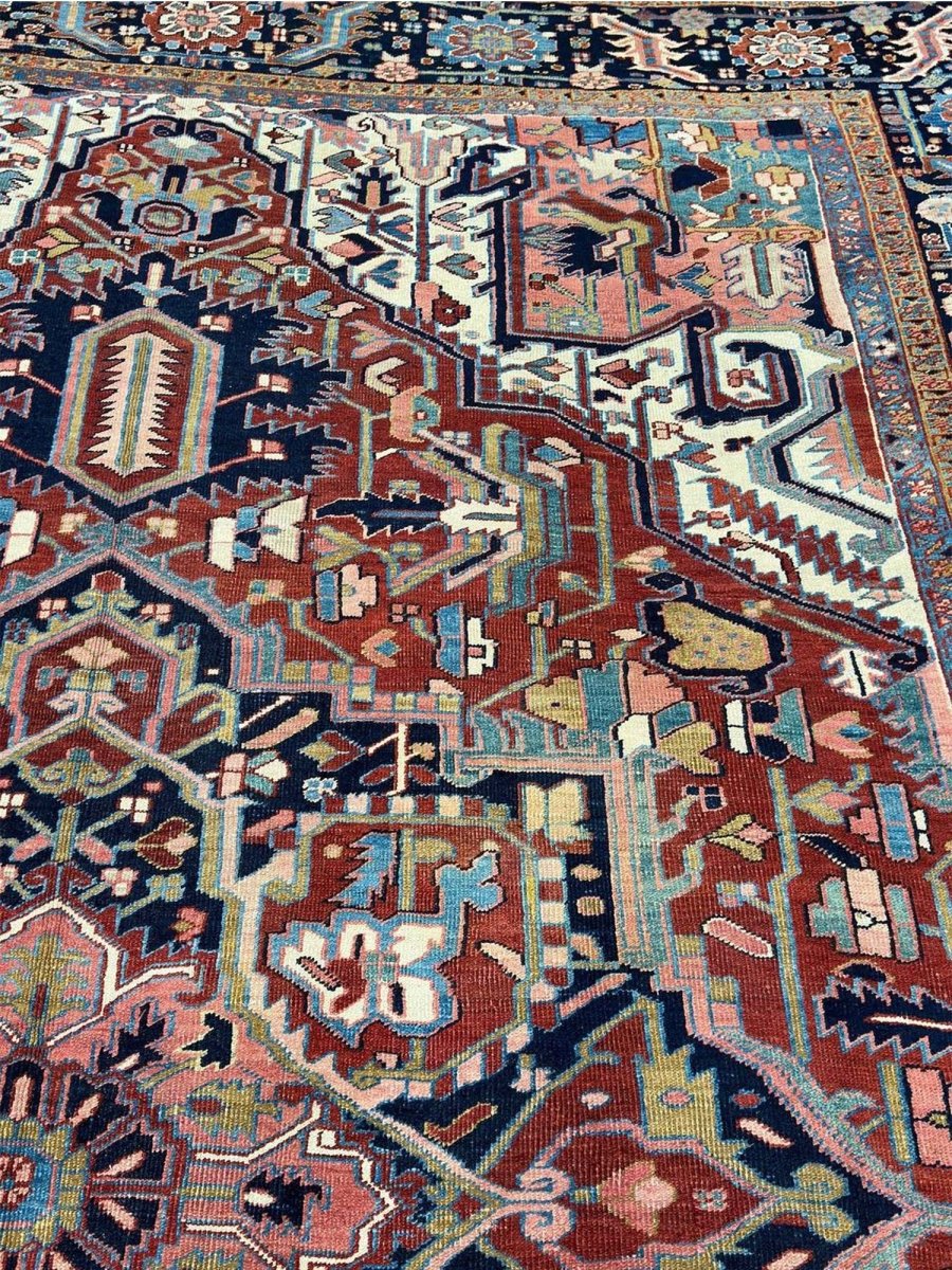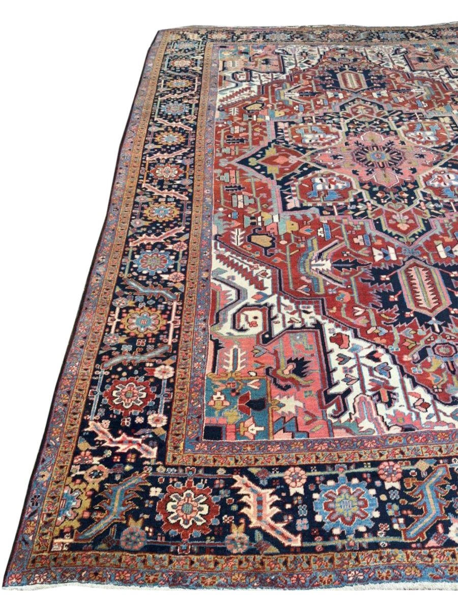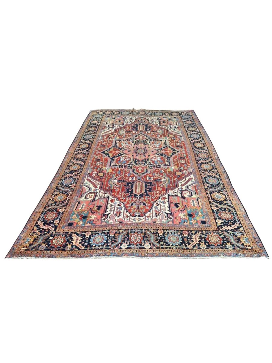 Decorate your space with the striking beauty of this 11x14 Antique Persian Heriz area rug. The magnificent rug is handmade in Persia from wool and showcases a commanding central medallion design. The background presents beautiful tones of red and ivory, providing the classic backdrop to intricate design. The rich geometric motifs have a color palette of blue, beige, and green accents. This generously sized piece is perfect for anchoring spacious bedrooms, living rooms, or dining areas. Crafted with traditional hand-making techniques, this wool rug offers enduring durability and a soft touch underfoot. Enjoy the convenience of free and fast delivery within the United States.