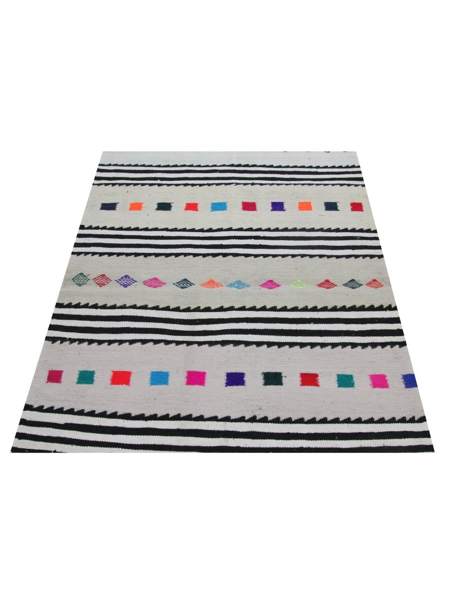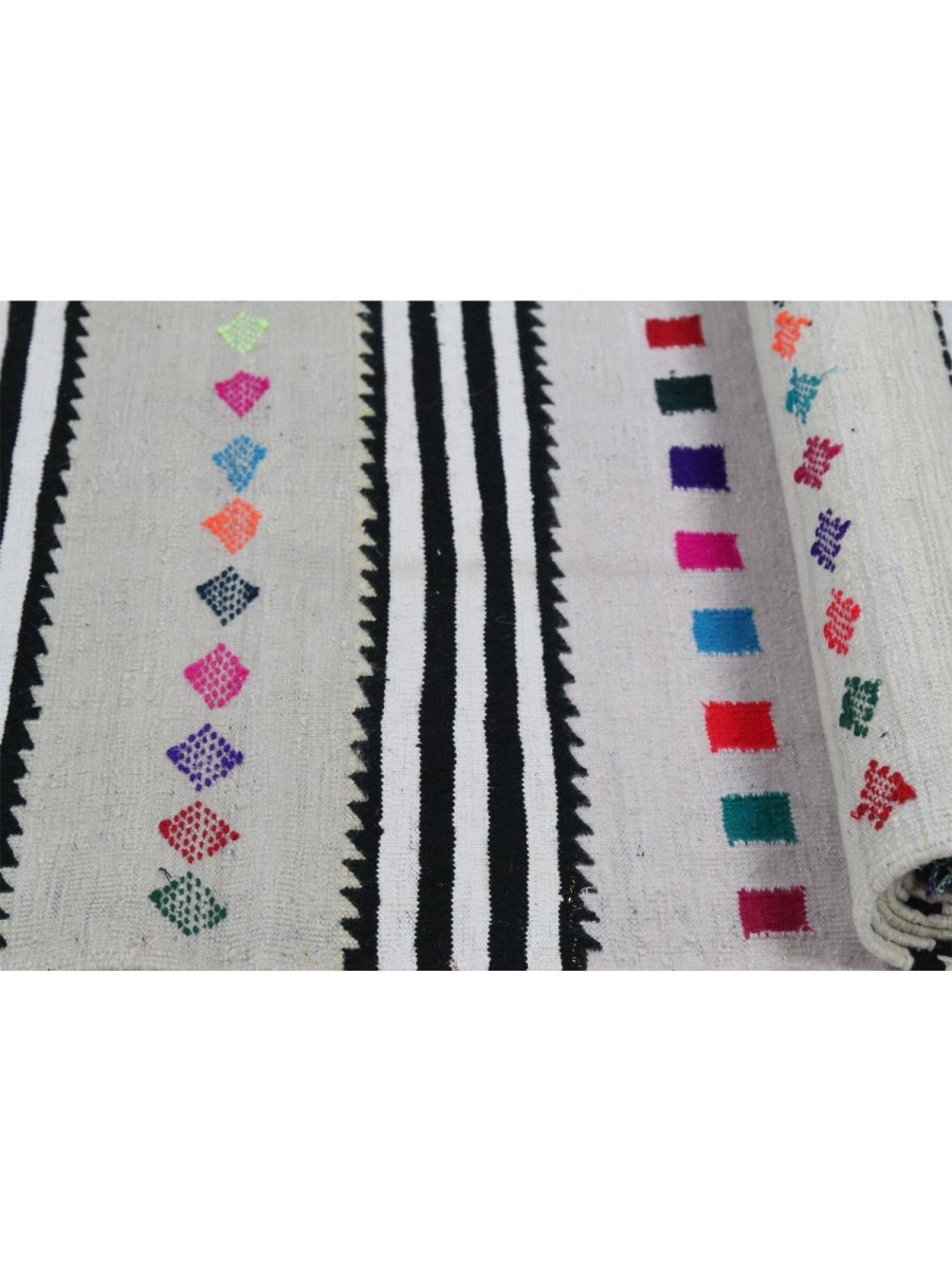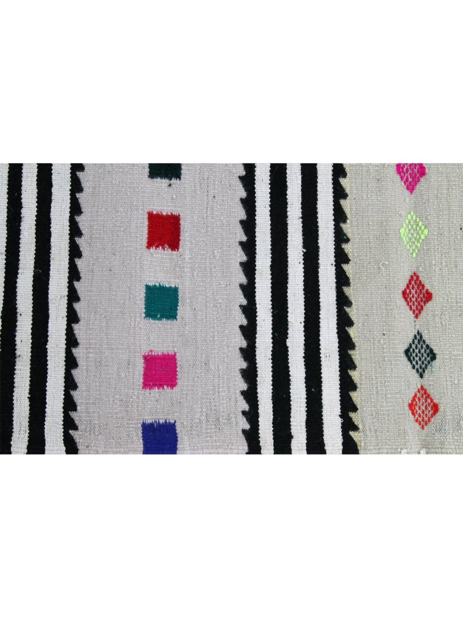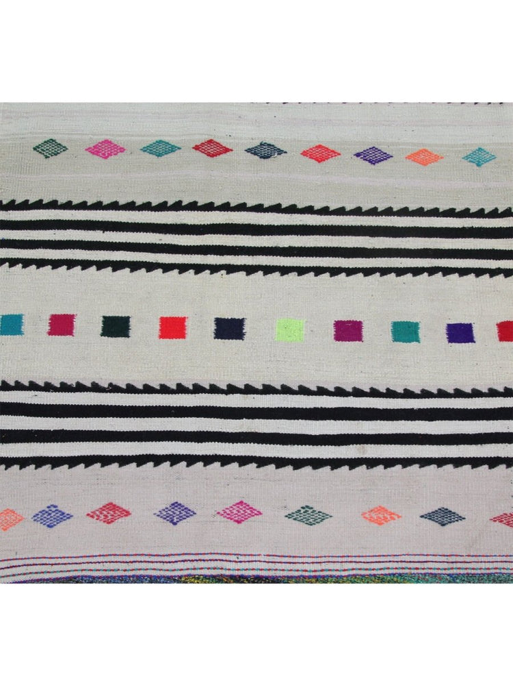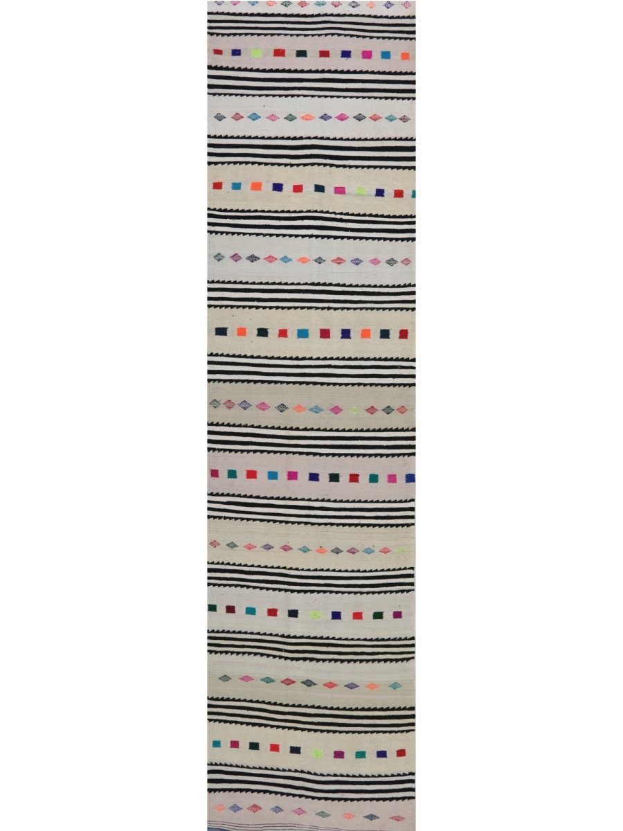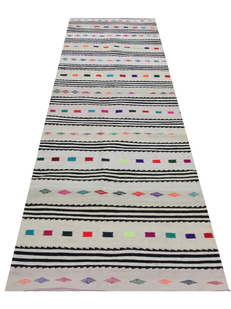 This 3x12 Handwoven Persian Kilim Runner is a beautifully detailed piece, featuring a ivory and gray background with red, blue, and green geometric accents and black stripes. The intricate handwoven patterns add a touch of cultural heritage and charm. Crafted in Persia using premium wool, this flat-weave construction ensures durability while remaining lightweight and easy to maintain. Its artistic design complements classic and chic interiors, bringing warmth and character to any setting. Whether you want to add a bold touch or a subtle cultural element to your home, this Persian Kilim runner is an excellent choice.