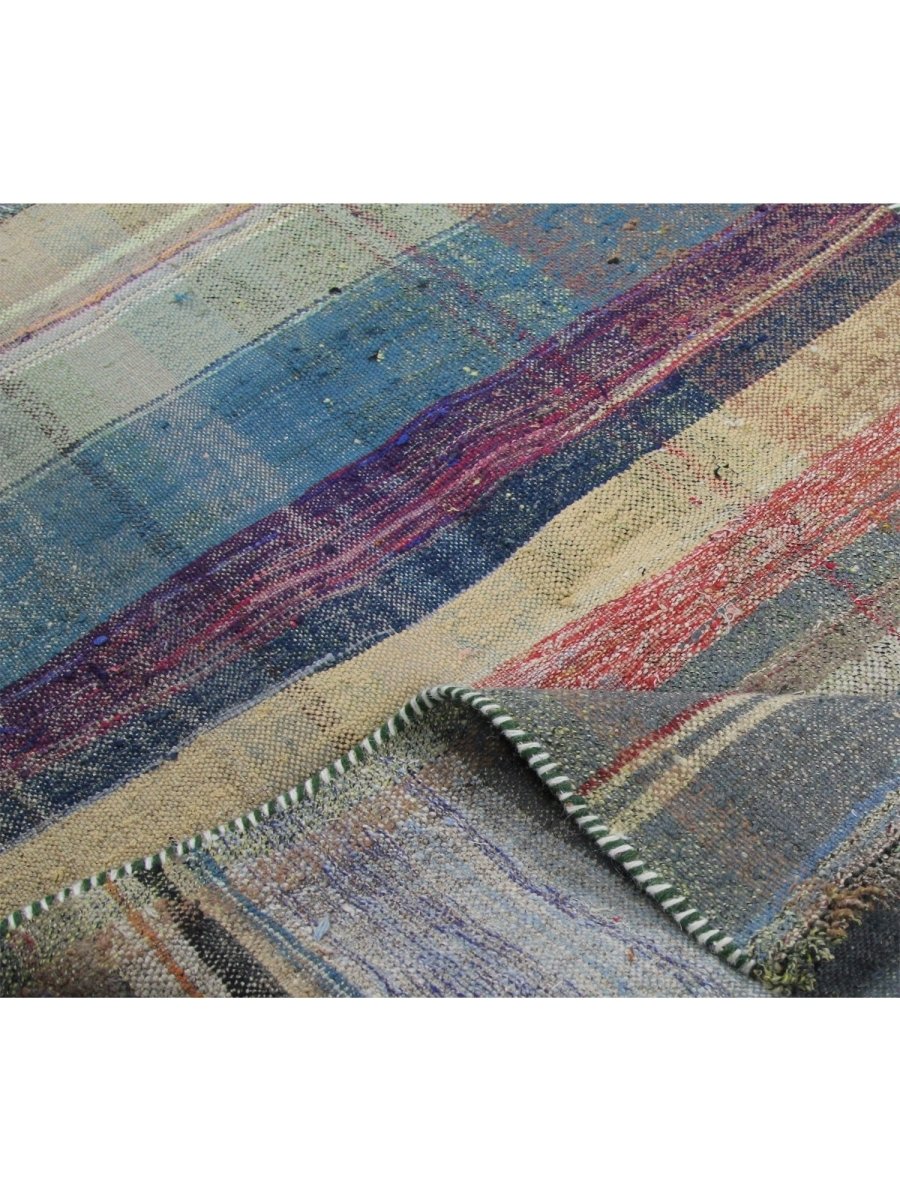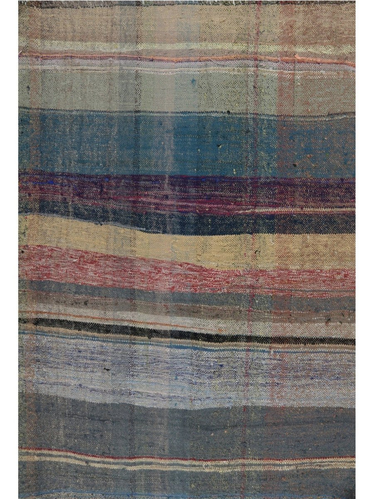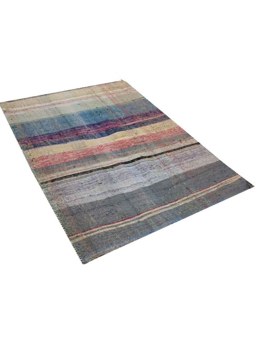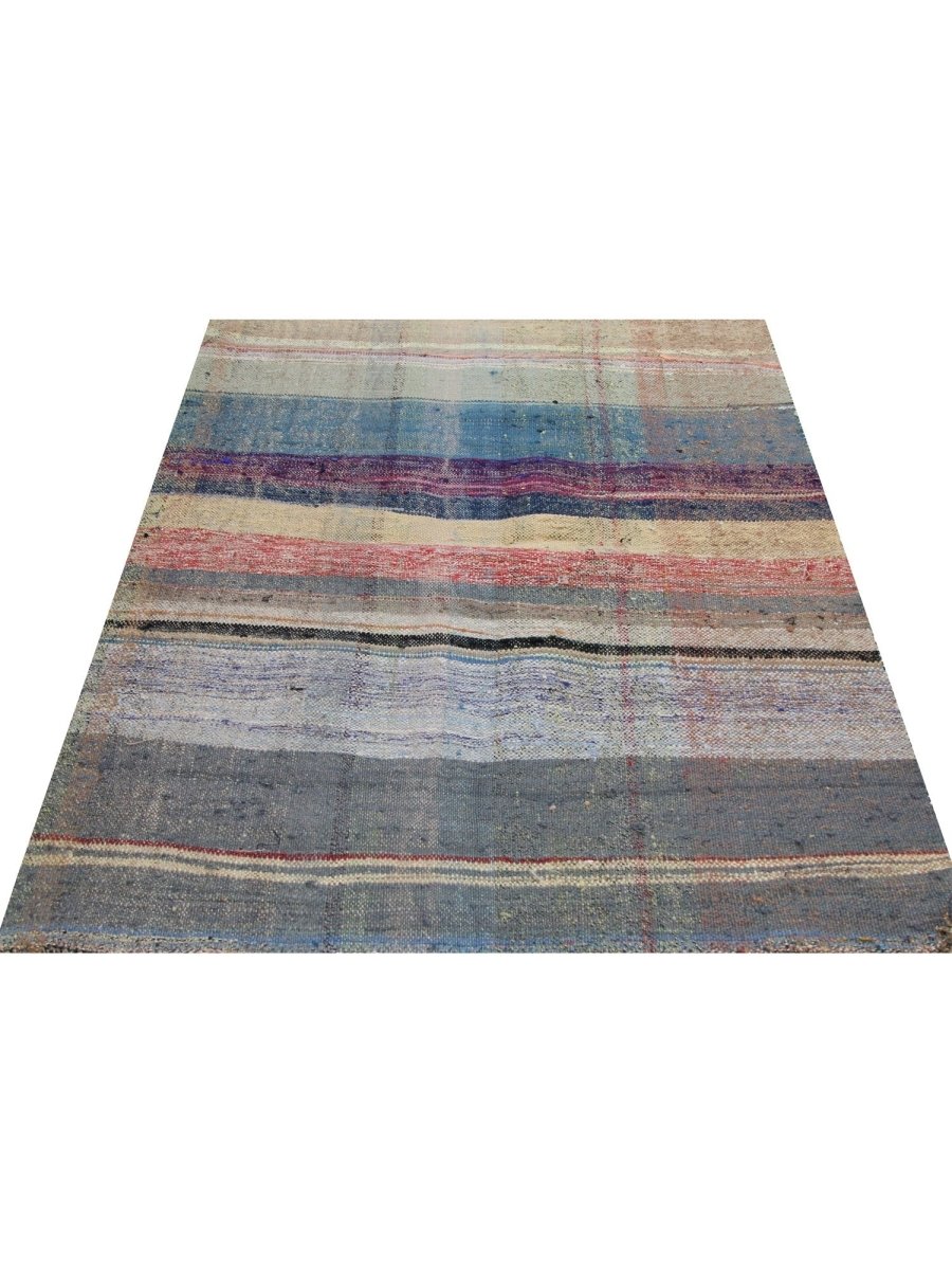 The 3x4 Persian Kilim Area Rug is a striking blend of artistry, featuring an striped pattern of horizontal stripes in varying shades of blue, red, beige, and gray. Its handwoven flat-weave construction offers a rustic yet timeless appeal, with visible weaving imperfections that enhance its timeless, handmade character.