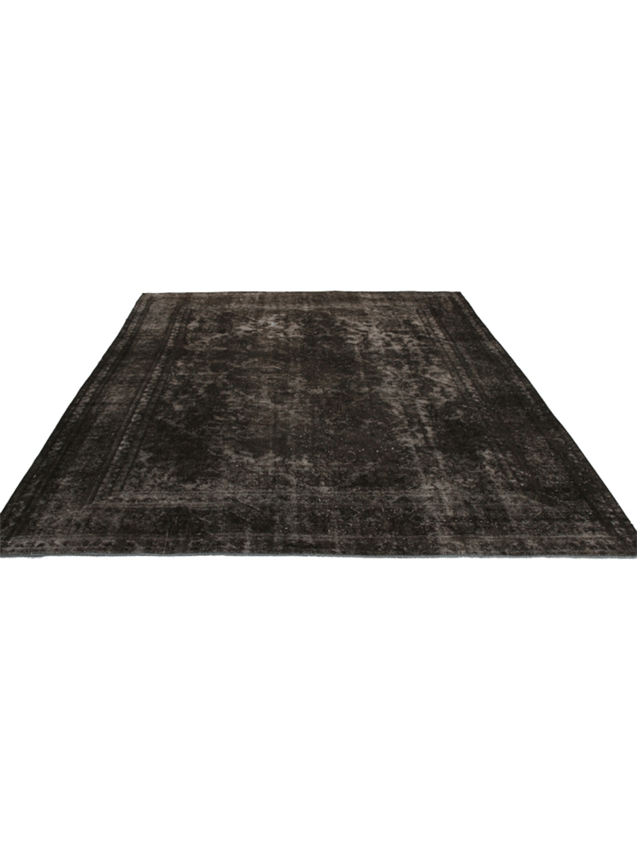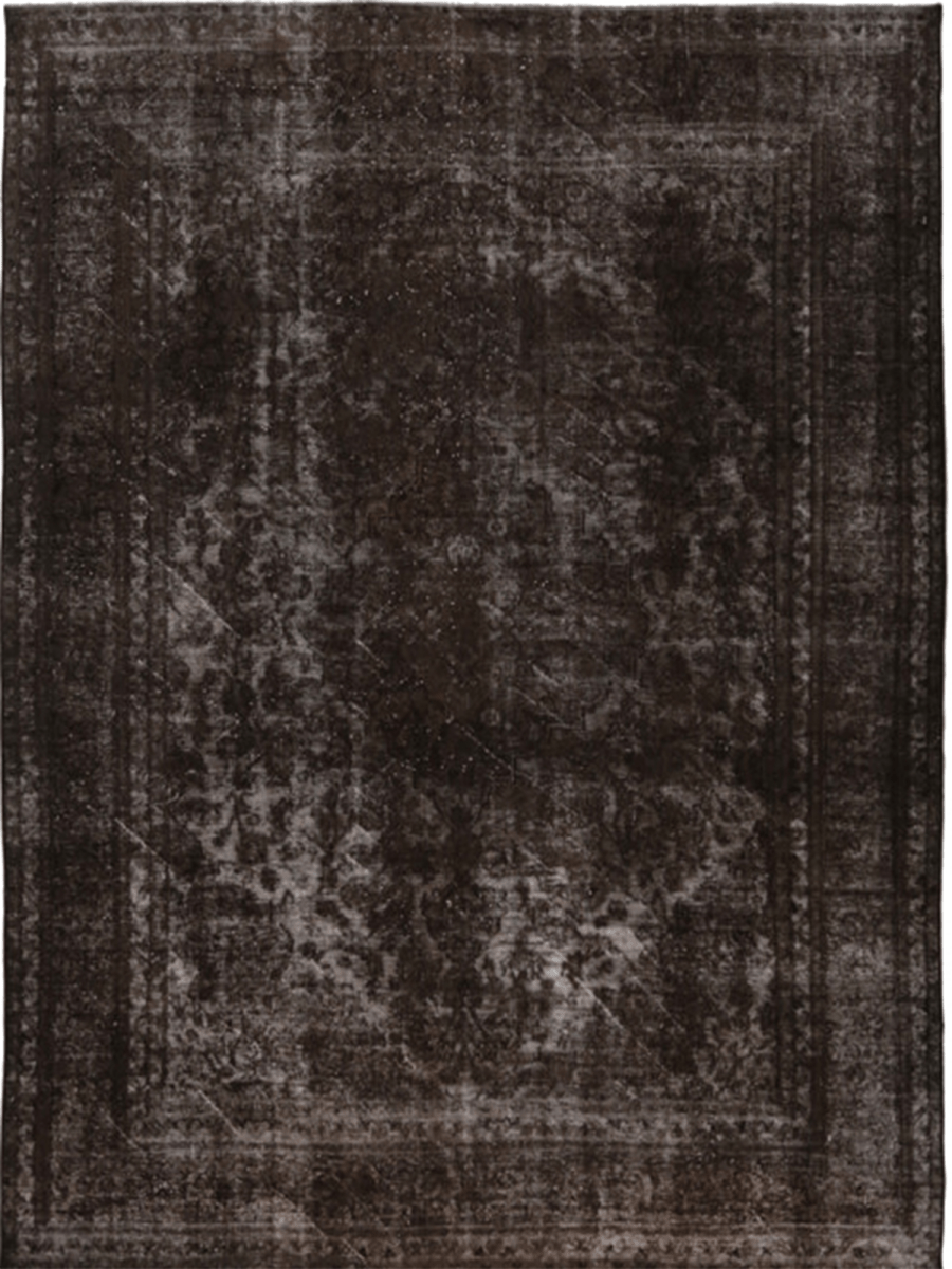 This 10x12 vintage distressed overdyed Persian area rug radiates timeless elegance. Hand-knotted from quality wool, its faded geometric motif heightens its vintage appeal. A unique find, this rug brings both warmth and personality to your decor. With touches of brown and white, it conveys a neutral yet impactful presence. Its plush yet long-lasting structure is a stylish investment. Free US shipping included.