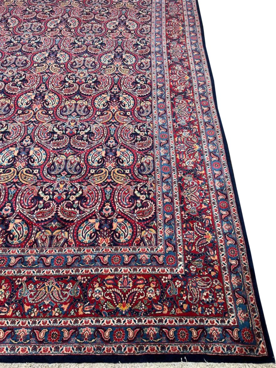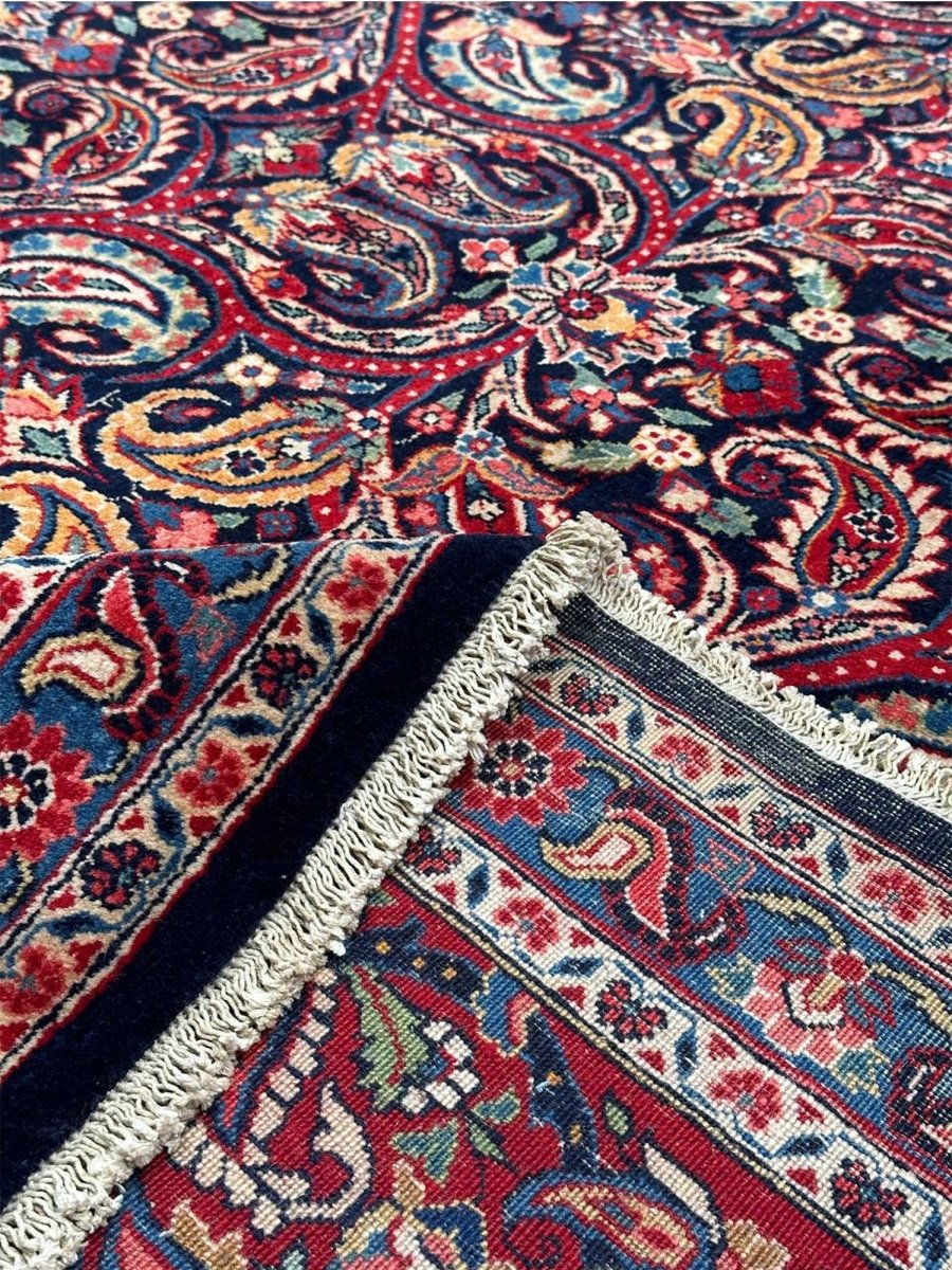 Introduce vibrant artistry with this 10x13 Old Persian Hamedan area rug. Handmade in Persia from wool, the large rug features a captivating repetitive pattern across its surface. The intricate design of repeating motifs creates a rich and dynamic visual field. The field has a striking deep red hue, providing the warm, traditional backdrop. All-over pattern, borders detailed with many colors, including navy blue, light blue, soft beige, yellow, or gold accents, adding visual complexity. This large size is perfect for anchoring a living or dining area. Crafted with traditional hand-making techniques, this wool rug offers lasting durability and a soft feel underfoot. Enjoy free US shipping.
