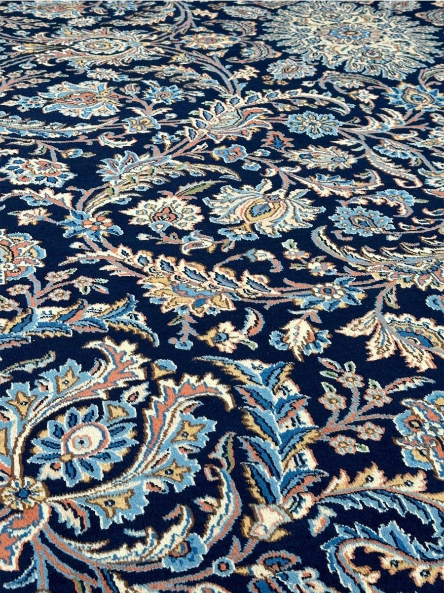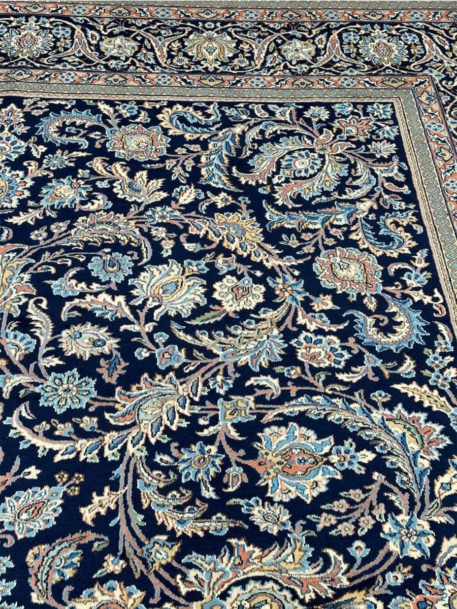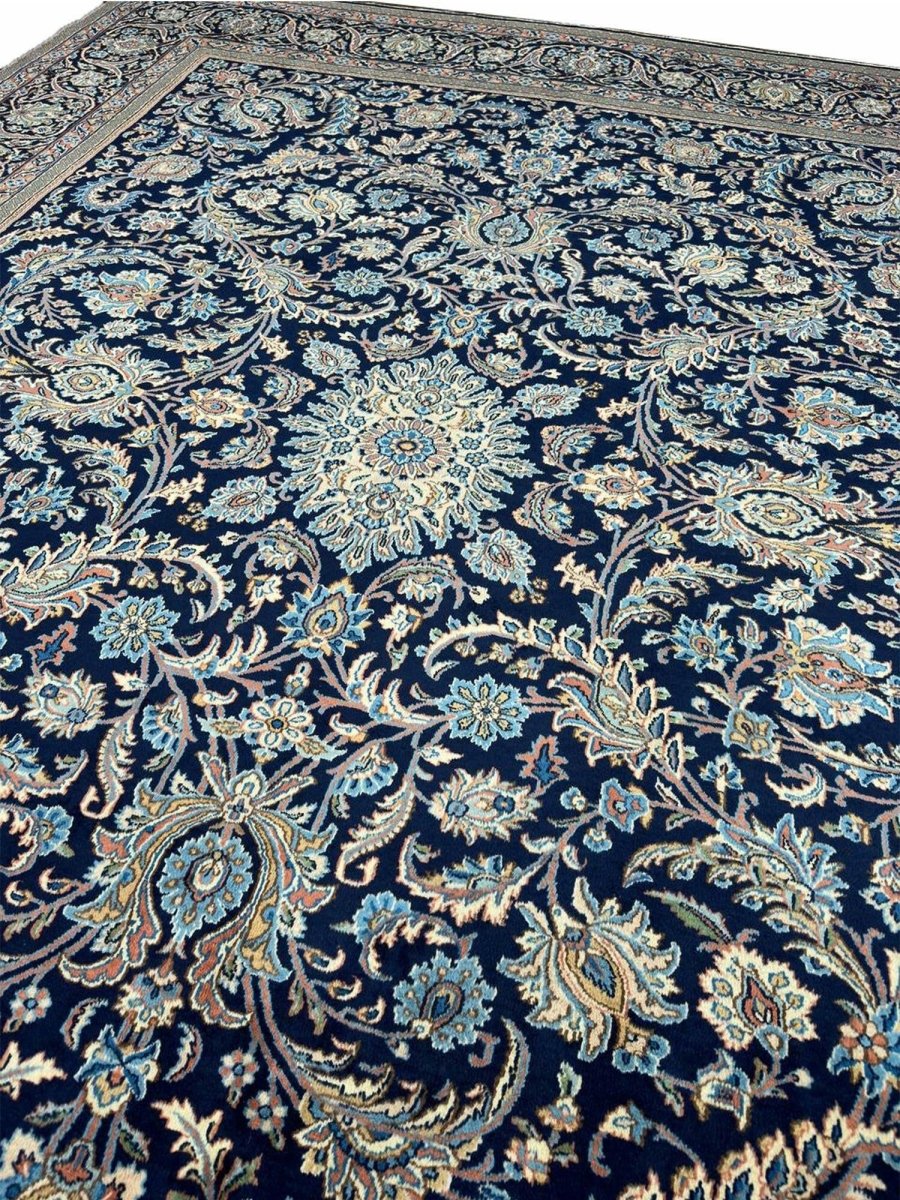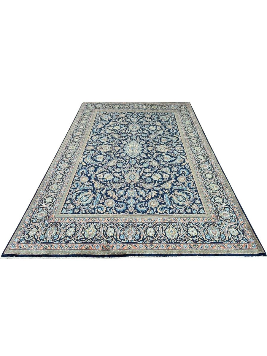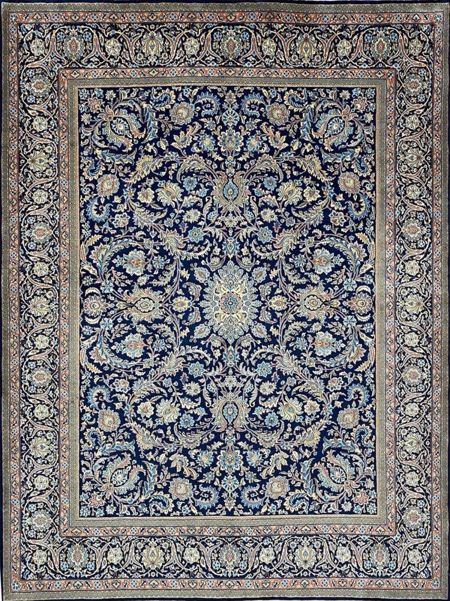 Decorate your space with the striking beauty of this 10x13 Old Persian Mashad area rug. The magnificent rug is handmade in Persia from wool and showcases a commanding central medallion design within the all-over pattern. The background presents a beautiful, deep navy blue tone, providing the classic backdrop to the intricate design. The floral motifs have a color palette of brown, warm beige, light blue, and green. This generously sized piece is perfect for anchoring spacious bedrooms, living rooms, or dining areas. Crafted with traditional hand-making techniques, this wool rug offers enduring durability and a soft touch underfoot. Enjoy the convenience of free and fast delivery within the United States.
