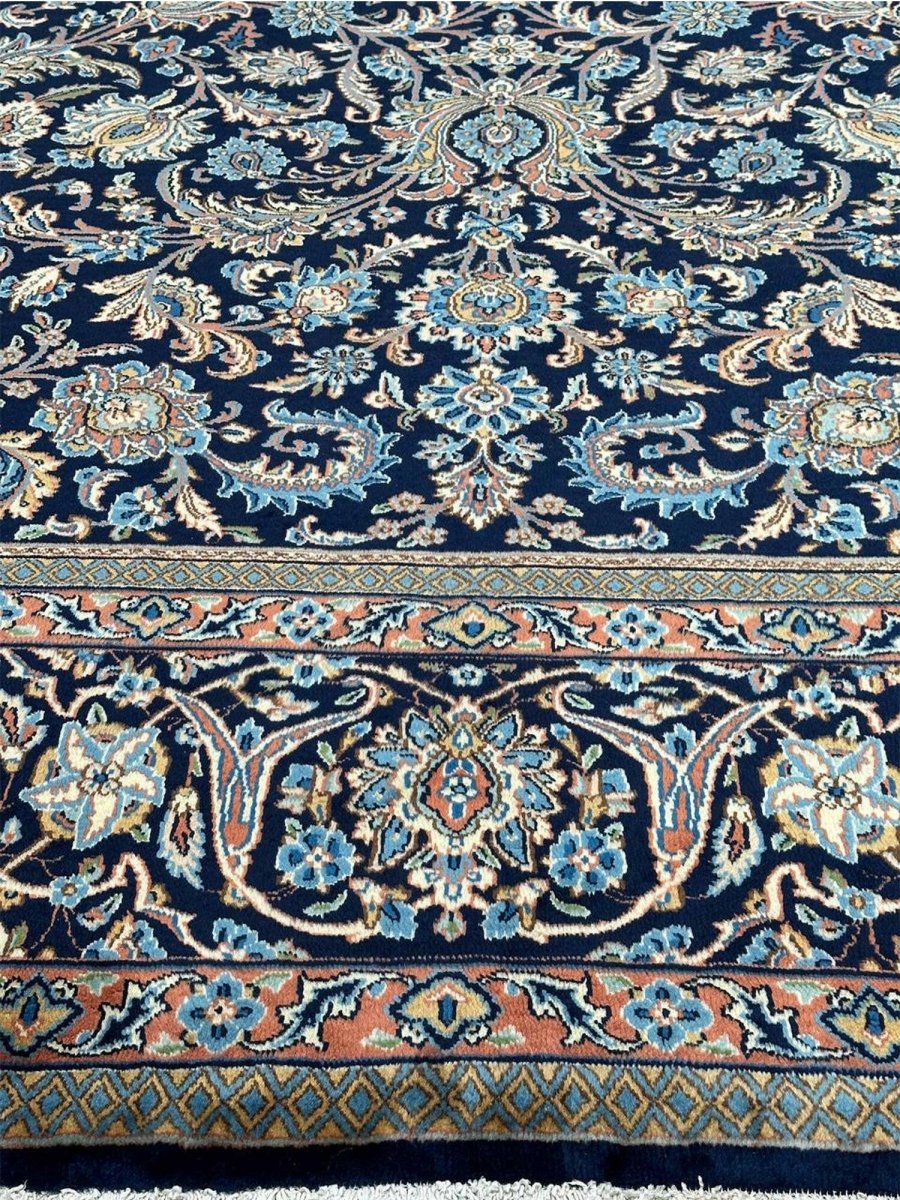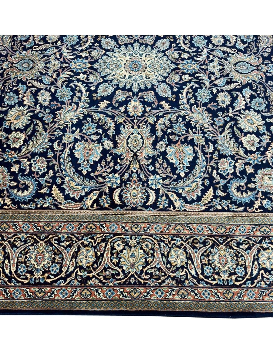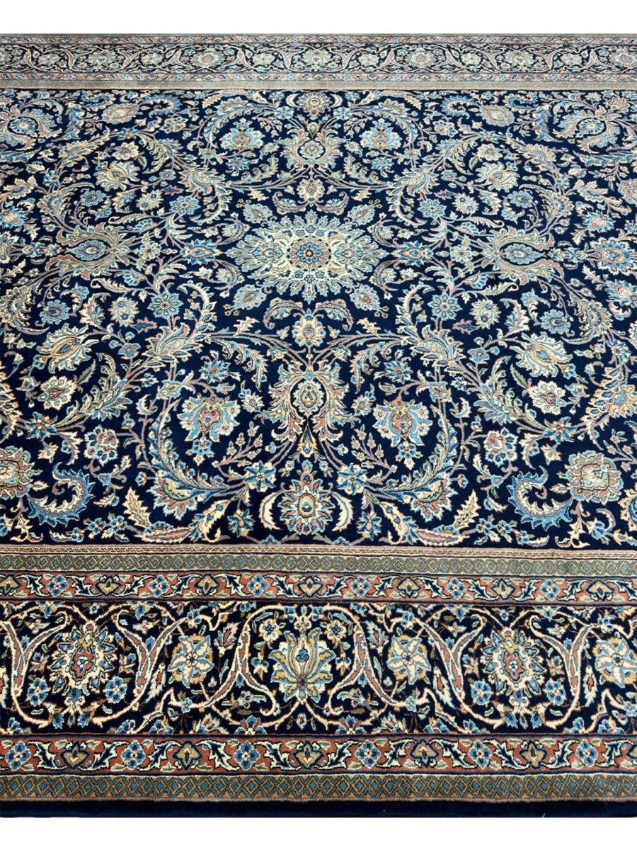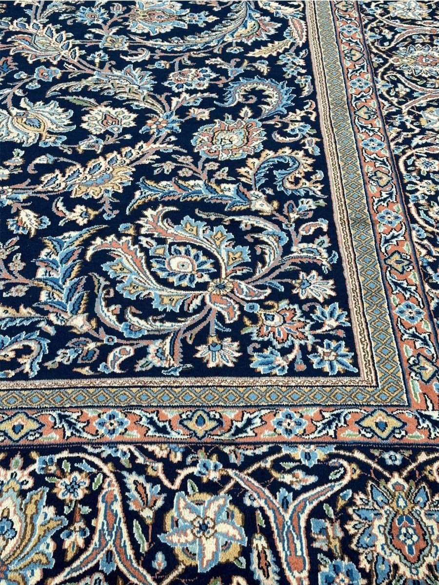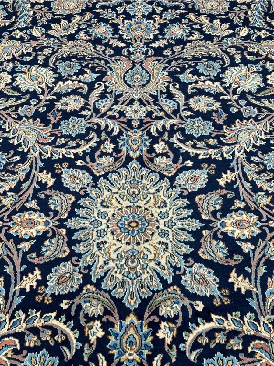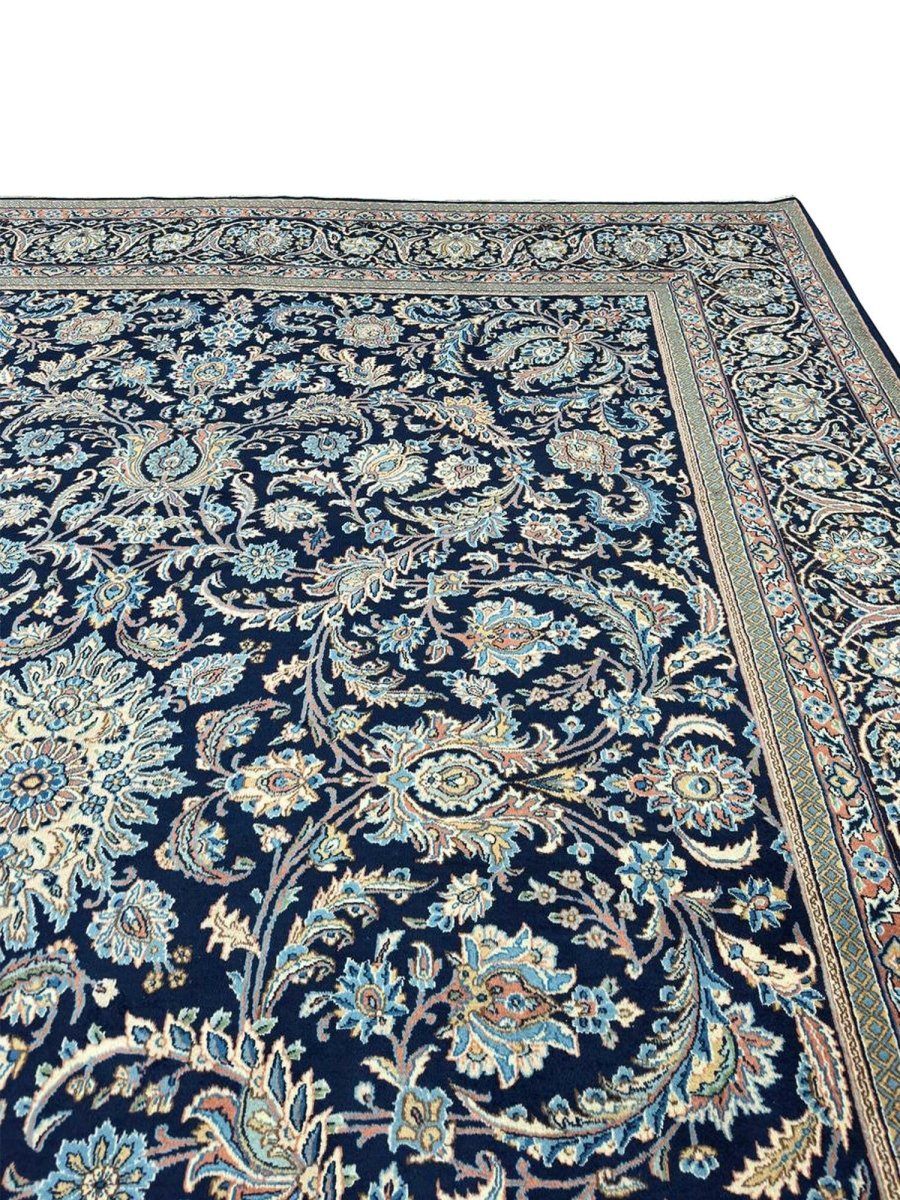Decorate your space with the striking beauty of this 10x13 Old Persian Mashad area rug. The magnificent rug is handmade in Persia from wool and showcases a commanding central medallion design within the all-over pattern. The background presents a beautiful, deep navy blue tone, providing the classic backdrop to the intricate design. The floral motifs have a color palette of brown, warm beige, light blue, and green. This generously sized piece is perfect for anchoring spacious bedrooms, living rooms, or dining areas. Crafted with traditional hand-making techniques, this wool rug offers enduring durability and a soft touch underfoot. Enjoy the convenience of free and fast delivery within the United States.