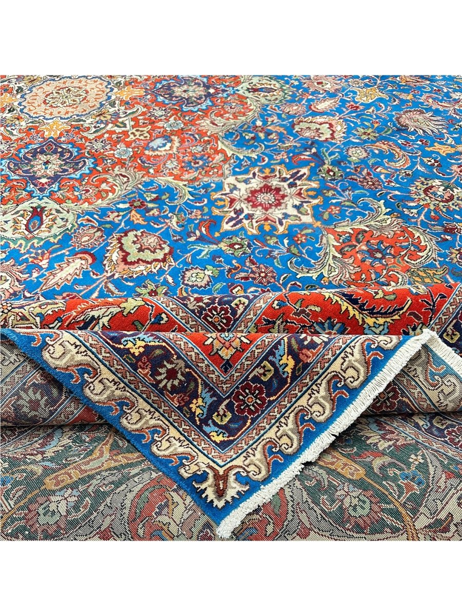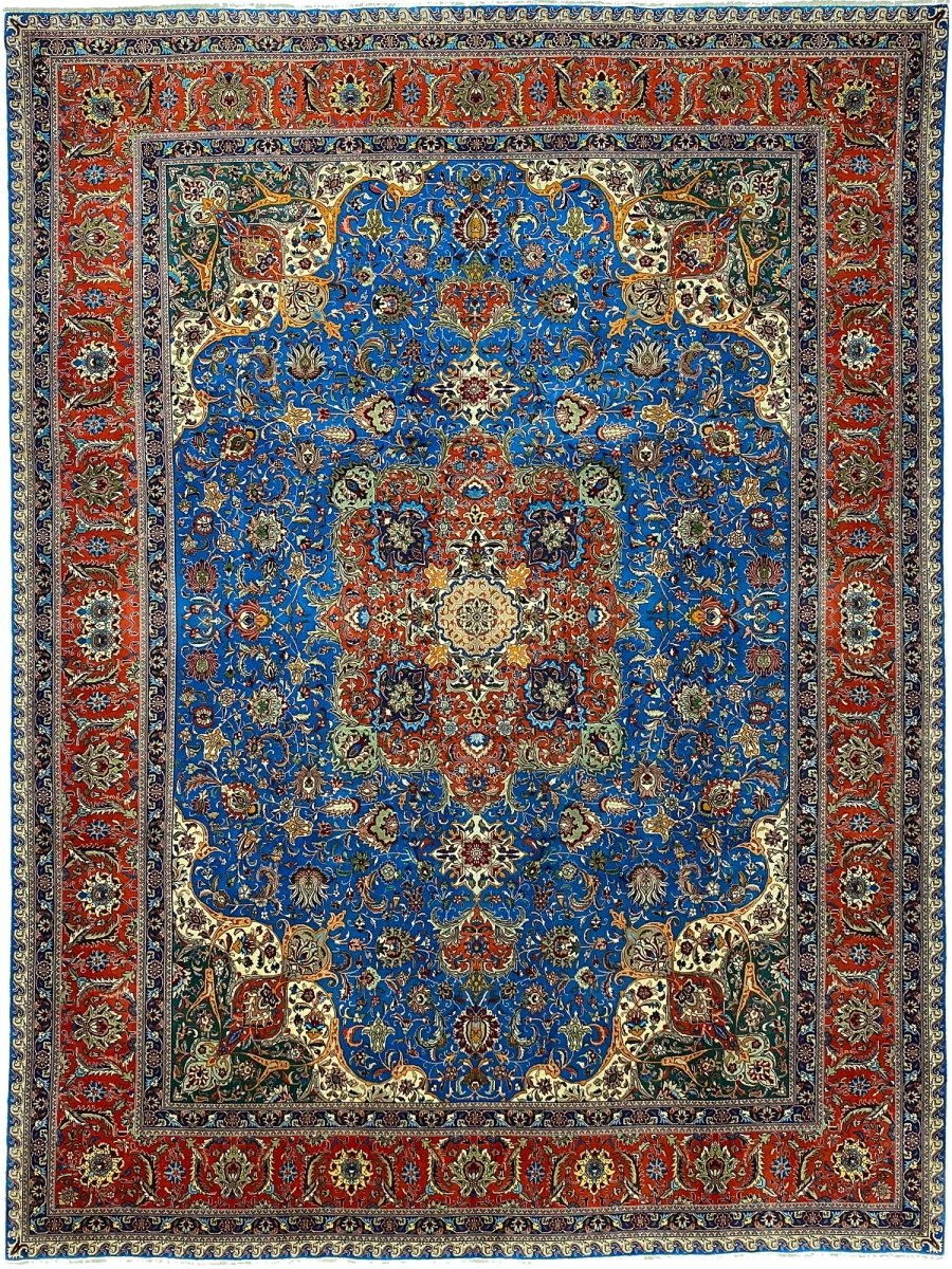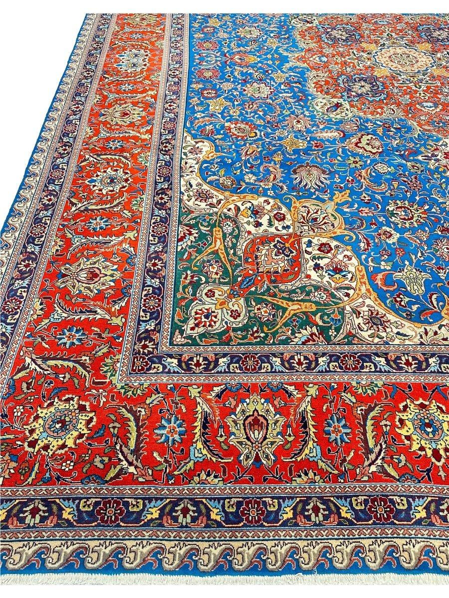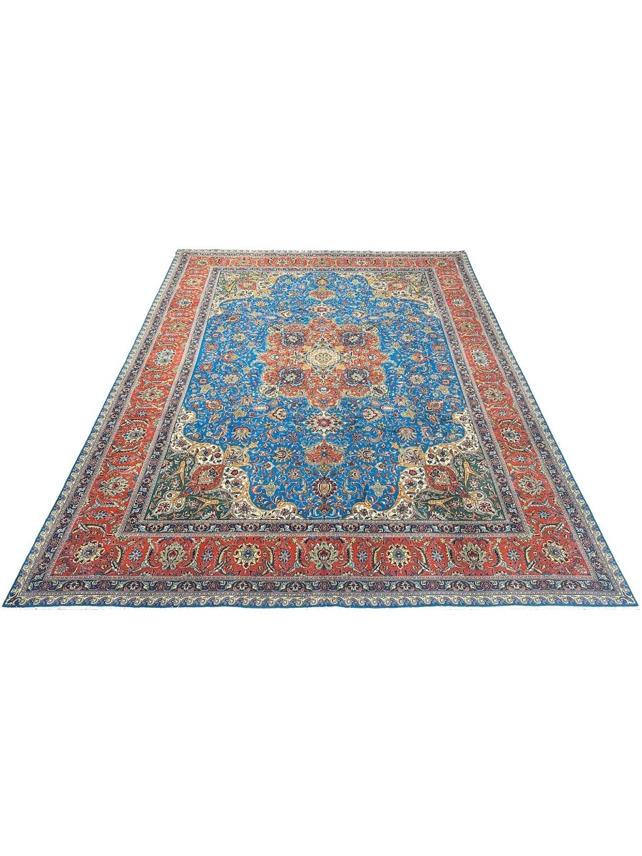 Step into elegance with this magnificent 10 'x 13' Old Persian Tabriz rug. Hand-knotted in Persia from fine wool, it showcases an exquisite central medallion pattern. The design unfolds with intricate floral motifs across a captivating light blue field and rich, deep red borders, detailed in blue, ivory, and green. This substantial size is perfect for anchoring large spaces, such as living rooms and dining rooms, adding timeless beauty and luxurious comfort. The meticulous craftsmanship ensures lasting quality. Bringing this rug into your home adds a piece of art and history, a true testament to Persian weaving tradition. Enjoy its enduring charm.