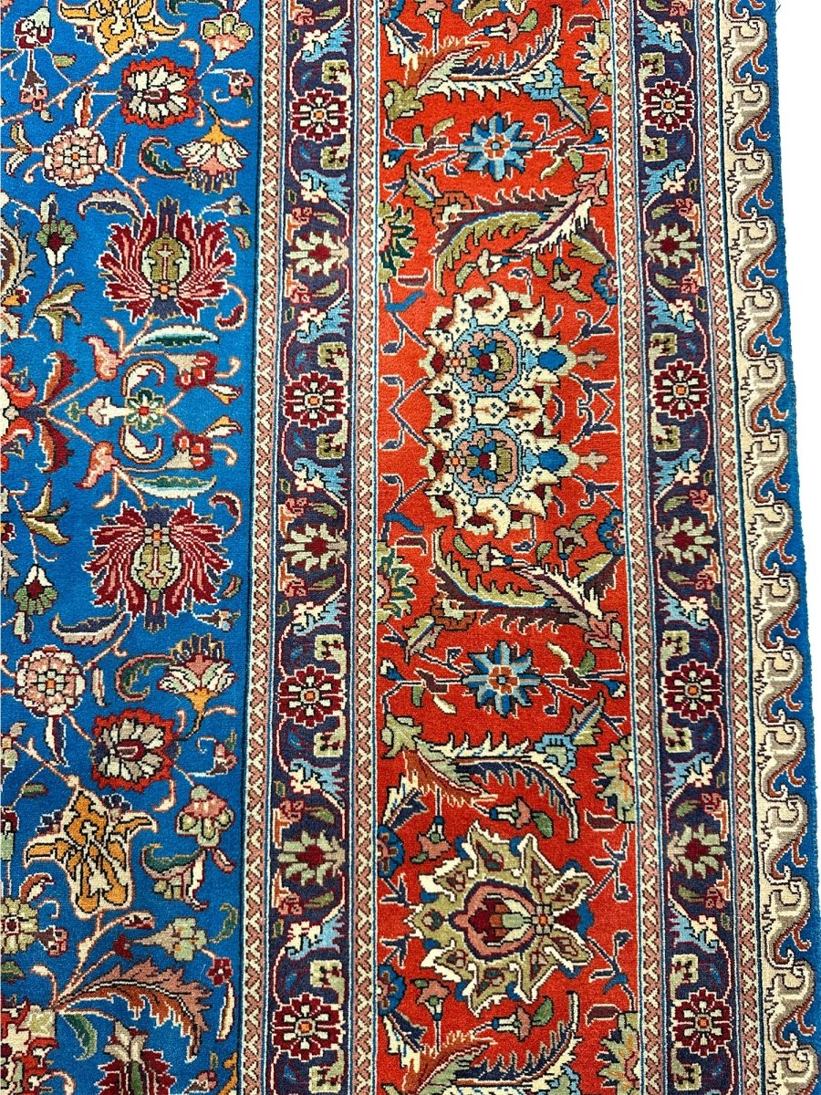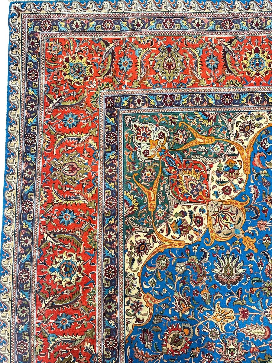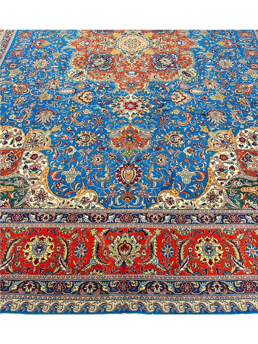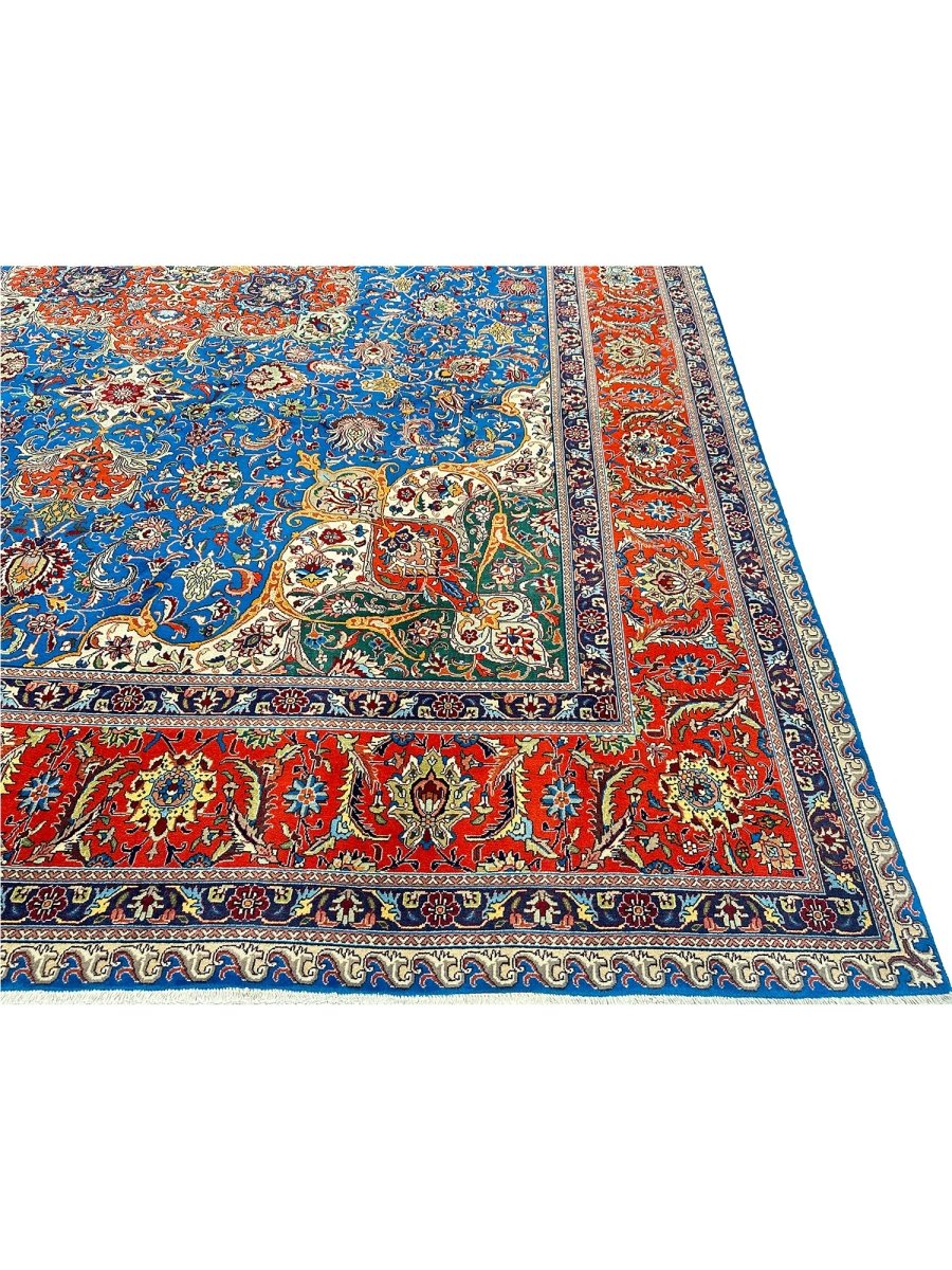 Step into elegance with this magnificent 10 'x 13' Old Persian Tabriz rug. Hand-knotted in Persia from fine wool, it showcases an exquisite central medallion pattern. The design unfolds with intricate floral motifs across a captivating light blue field and rich, deep red borders, detailed in blue, ivory, and green. This substantial size is perfect for anchoring large spaces, such as living rooms and dining rooms, adding timeless beauty and luxurious comfort. The meticulous craftsmanship ensures lasting quality. Bringing this rug into your home adds a piece of art and history, a true testament to Persian weaving tradition. Enjoy its enduring charm.