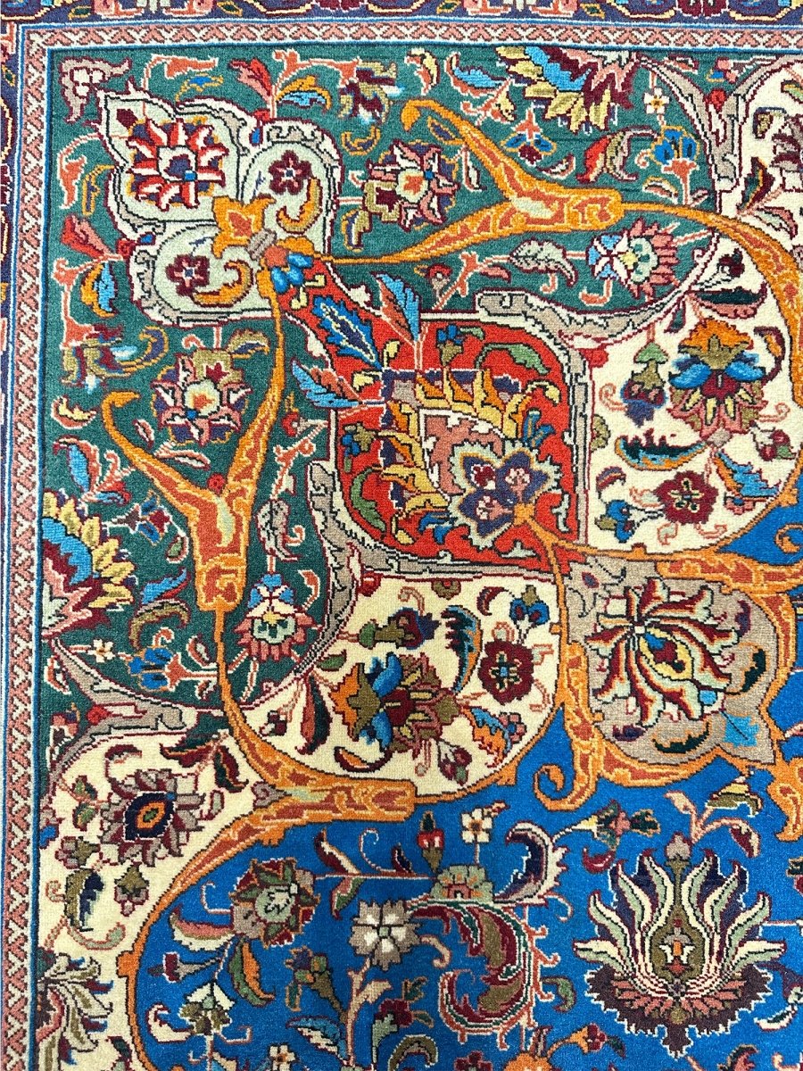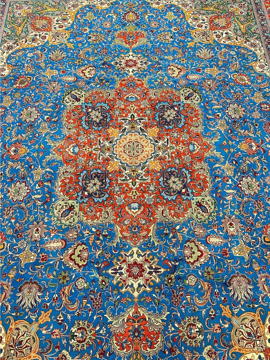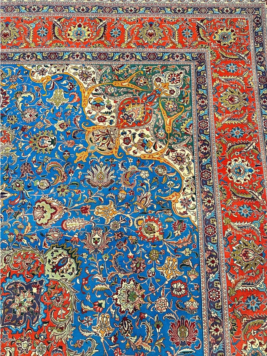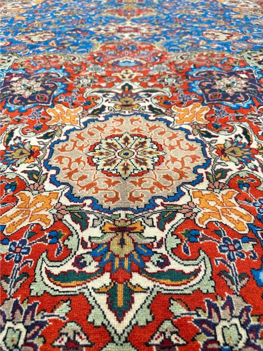 Step into elegance with this magnificent 10 'x 13' Old Persian Tabriz rug. Hand-knotted in Persia from fine wool, it showcases an exquisite central medallion pattern. The design unfolds with intricate floral motifs across a captivating light blue field and rich, deep red borders, detailed in blue, ivory, and green. This substantial size is perfect for anchoring large spaces, such as living rooms and dining rooms, adding timeless beauty and luxurious comfort. The meticulous craftsmanship ensures lasting quality. Bringing this rug into your home adds a piece of art and history, a true testament to Persian weaving tradition. Enjoy its enduring charm.