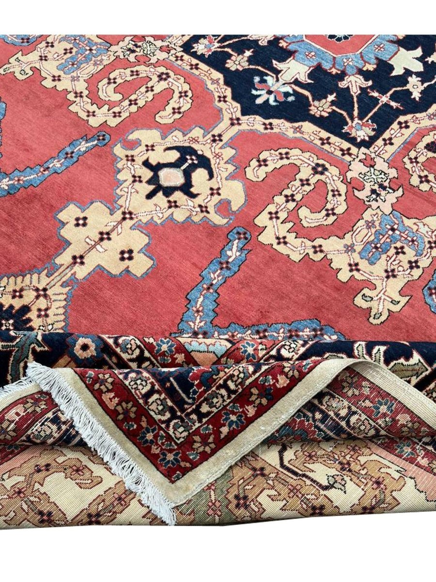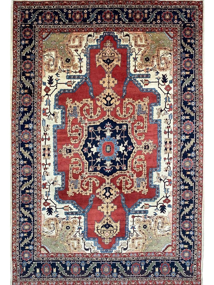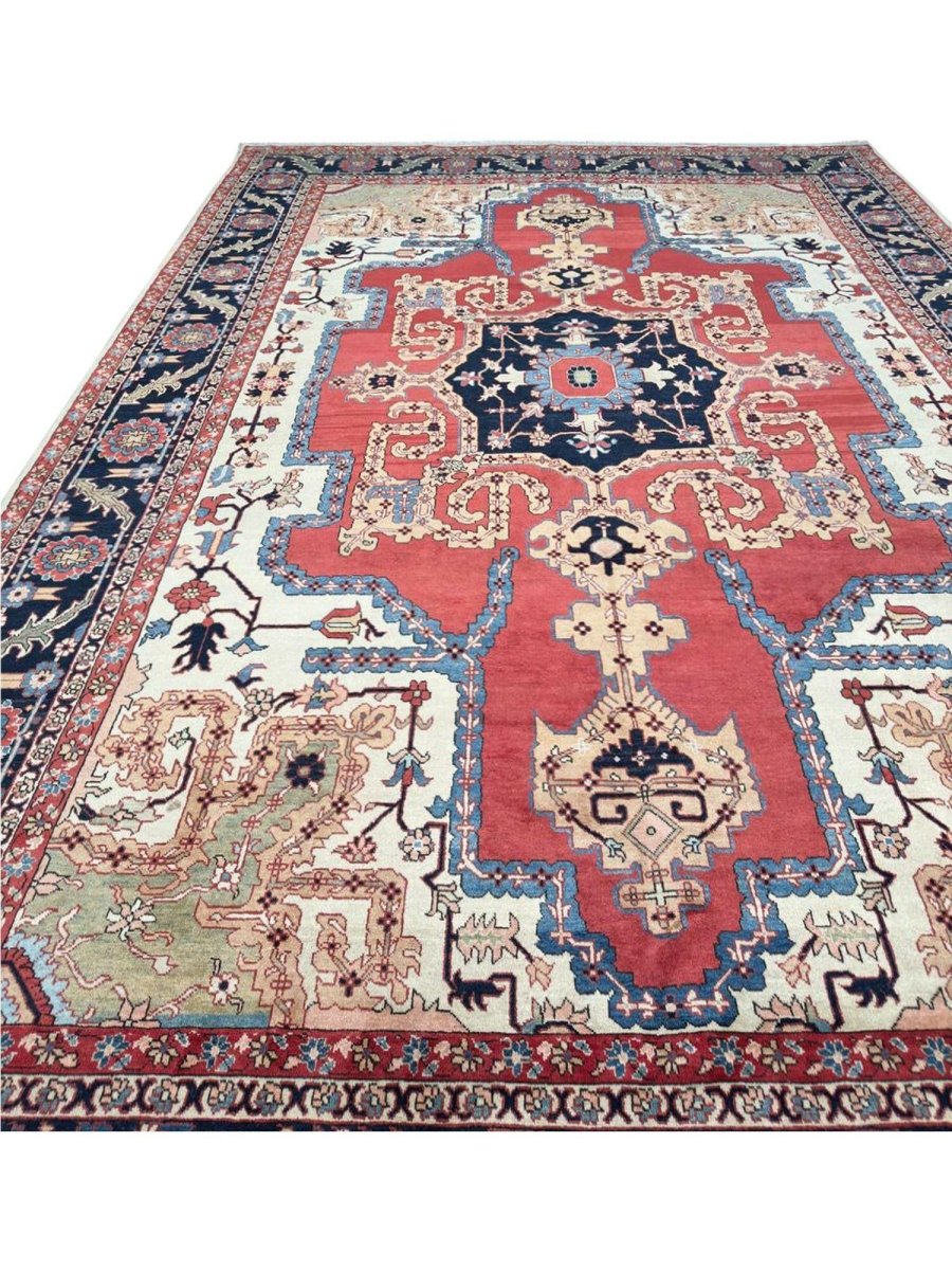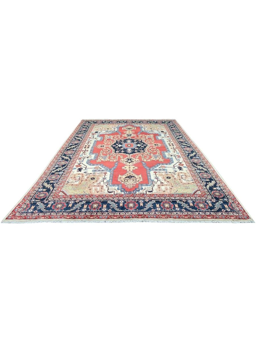 Decorate your space with the striking beauty of this 10x14 Persian Heriz area rug. Handmade in Persia from wool, the magnificent rug showcases a commanding central medallion design. The background features beautiful tones of red and ivory, providing a classic backdrop for intricate design. Rich and elaborate design features geometric motifs with a color palette of blue, beige, gold, green, and pink accents. This generously sized piece is perfect for anchoring spacious bedrooms, living rooms, or dining areas. Crafted with traditional hand-making techniques, this wool rug offers enduring durability, soft touch underfoot. Enjoy the convenience of free and fast delivery within the United States.