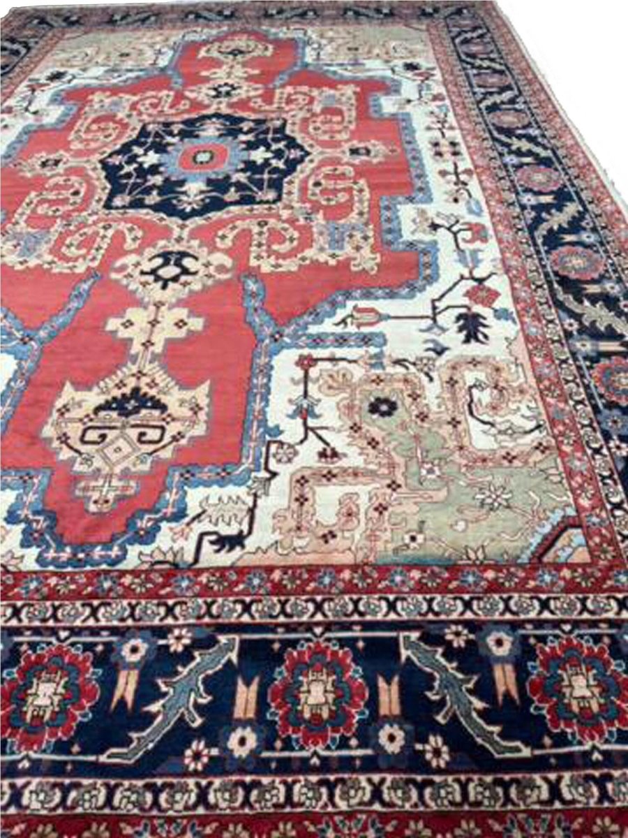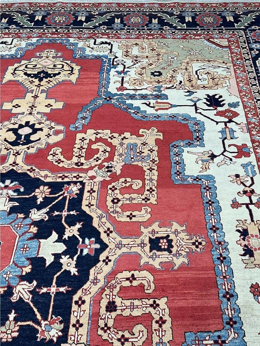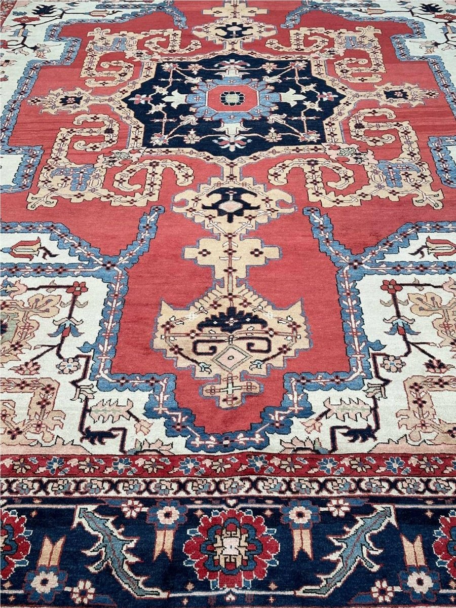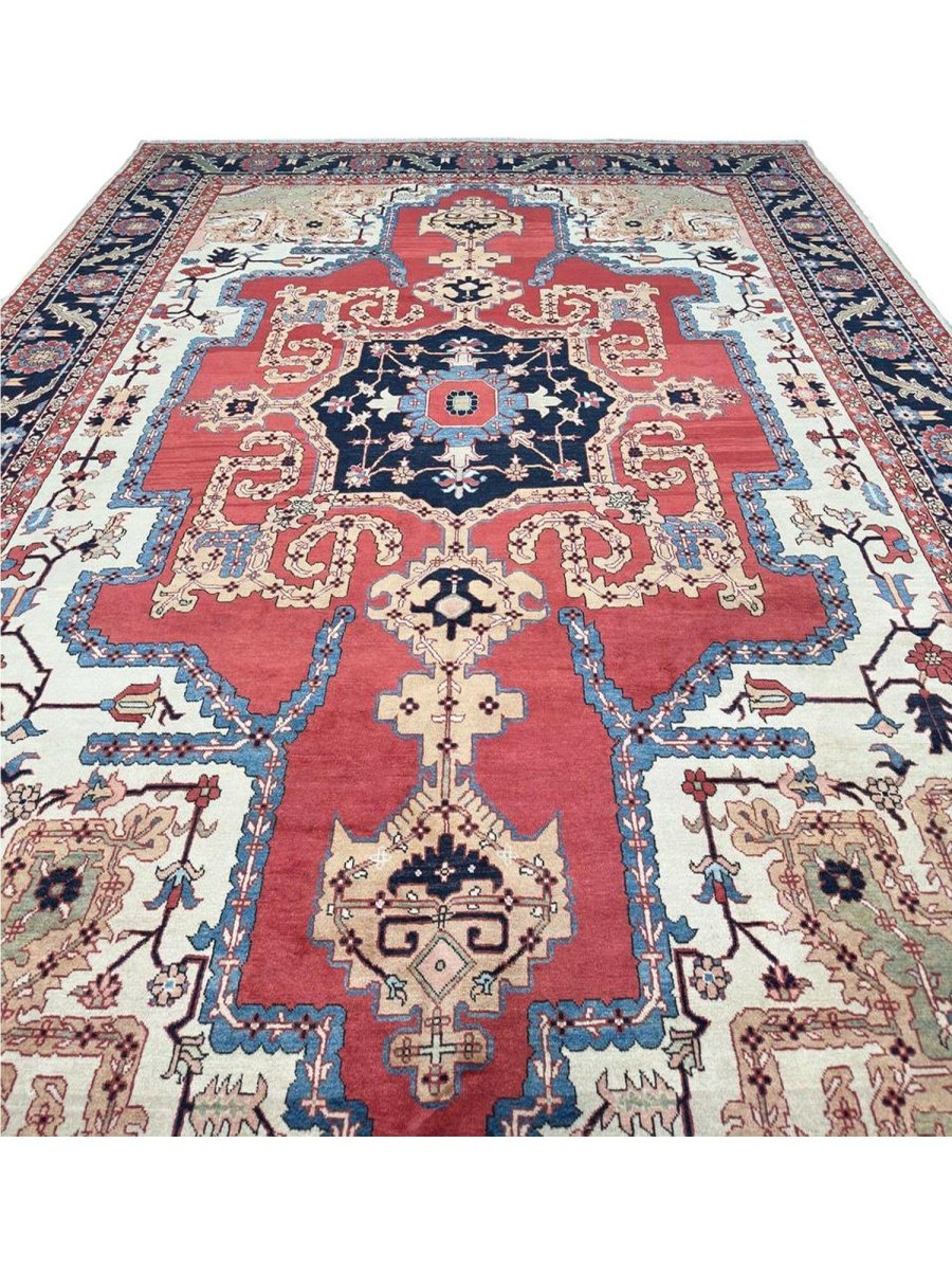 Decorate your space with the striking beauty of this 10x14 Persian Heriz area rug. Handmade in Persia from wool, the magnificent rug showcases a commanding central medallion design. The background features beautiful tones of red and ivory, providing a classic backdrop for intricate design. Rich and elaborate design features geometric motifs with a color palette of blue, beige, gold, green, and pink accents. This generously sized piece is perfect for anchoring spacious bedrooms, living rooms, or dining areas. Crafted with traditional hand-making techniques, this wool rug offers enduring durability, soft touch underfoot. Enjoy the convenience of free and fast delivery within the United States.