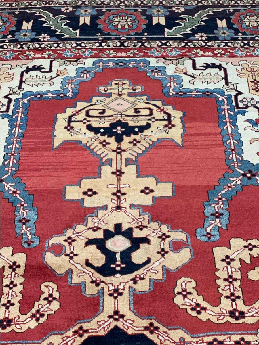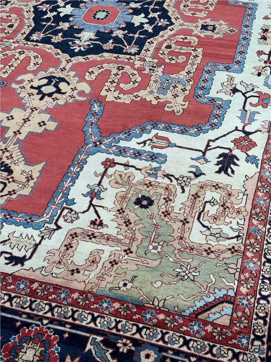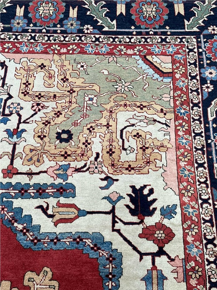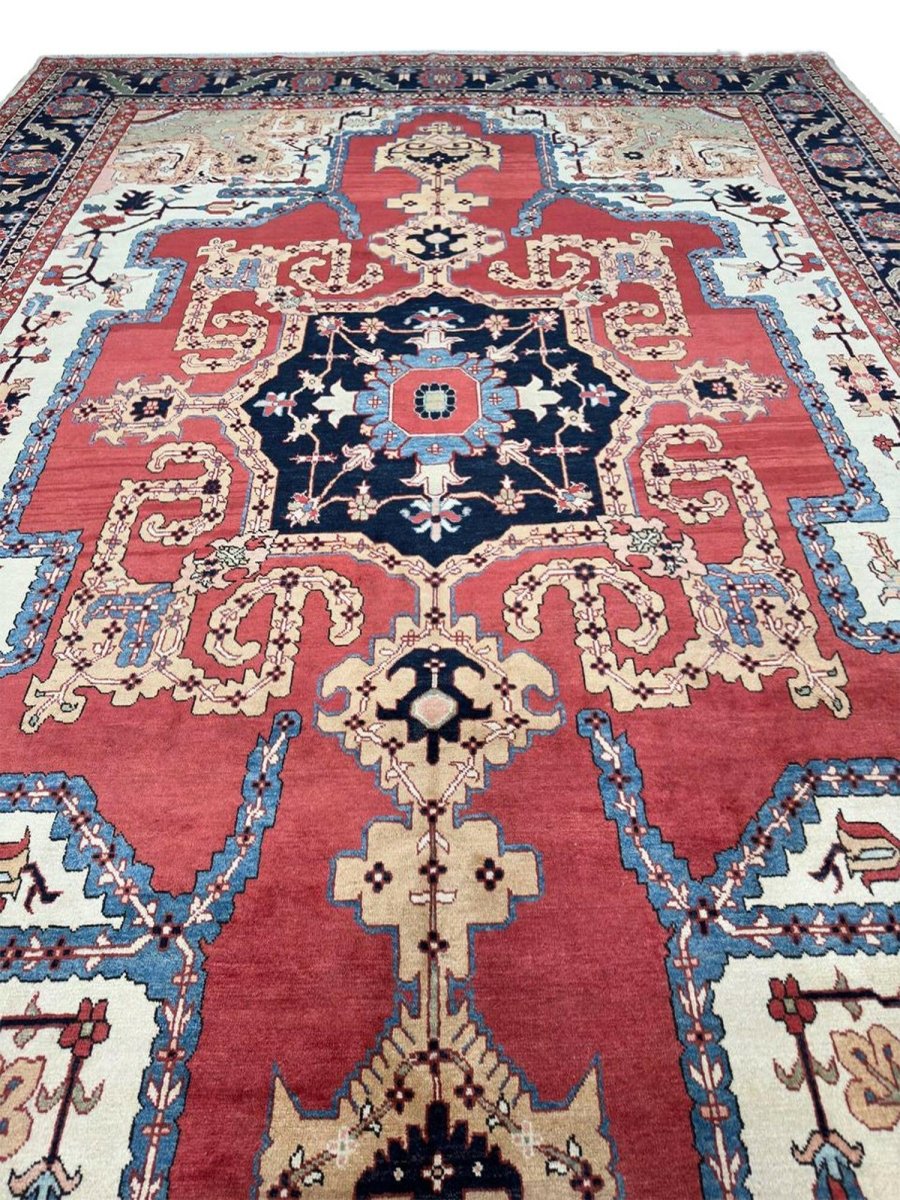Decorate your space with the striking beauty of this 10x14 Persian Heriz area rug. Handmade in Persia from wool, the magnificent rug showcases a commanding central medallion design. The background features beautiful tones of red and ivory, providing a classic backdrop for intricate design. Rich and elaborate design features geometric motifs with a color palette of blue, beige, gold, green, and pink accents. This generously sized piece is perfect for anchoring spacious bedrooms, living rooms, or dining areas. Crafted with traditional hand-making techniques, this wool rug offers enduring durability, soft touch underfoot. Enjoy the convenience of free and fast delivery within the United States.
