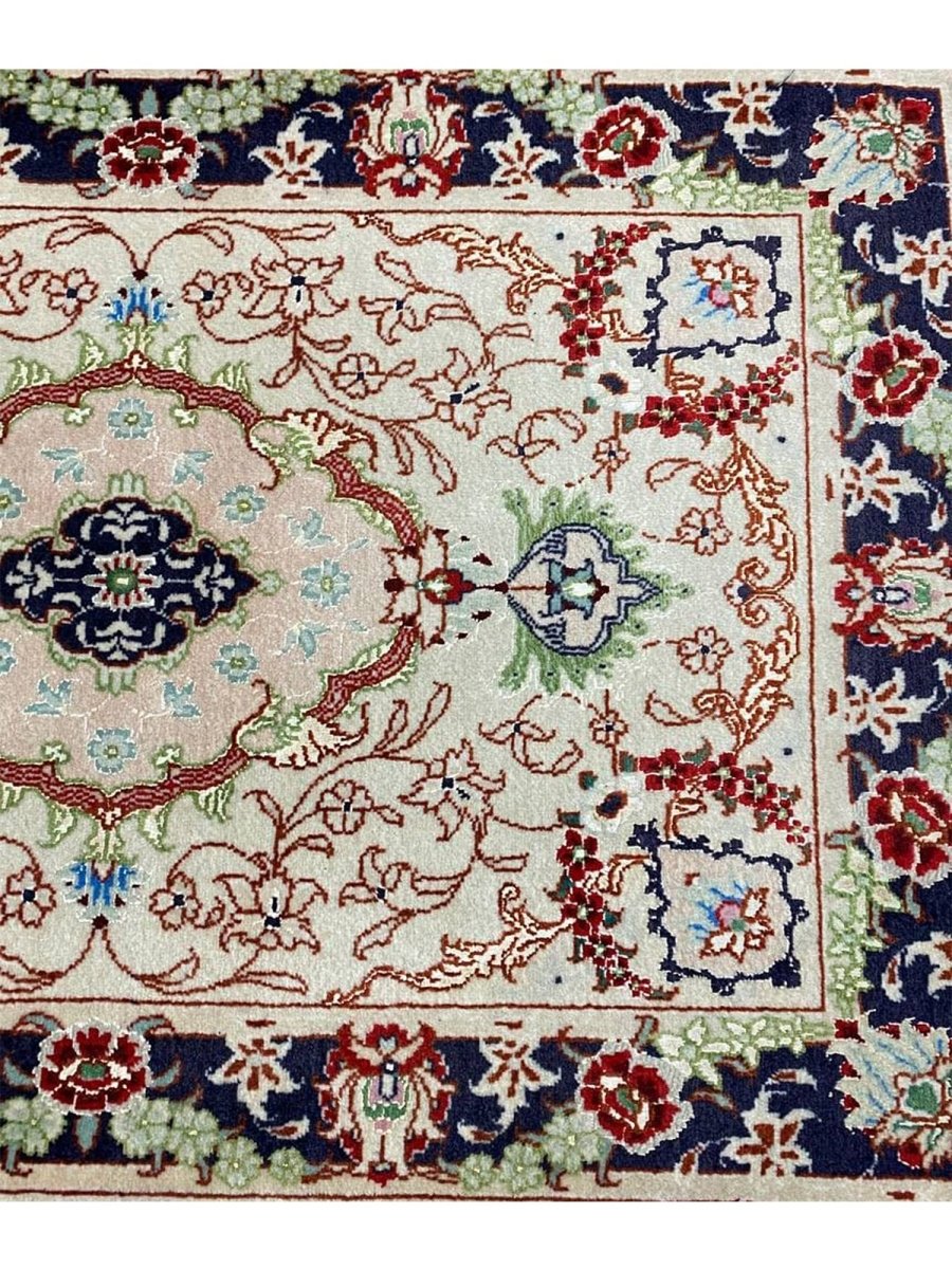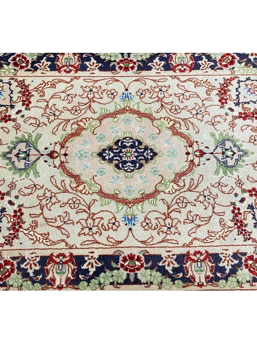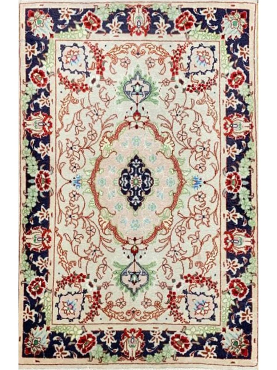 Immerse your space in the exquisite artistry of this magnificent 2x3 Persian Tabriz Masterpiece rug. Hand-knotted by skilled artisans in Tabriz, Persia, this piece exemplifies the enduring beauty and intricate craftsmanship for which Tabriz rugs are renowned. This is perfect for elevating your entryways or beside any furniture. The detailed medallion motifs and harmonious color palette create an atmosphere of timeless elegance and sophistication. The color palette includes cream, red, blue, and green tones. Crafted from a luxurious blend of wool and natural silk, this rug offers both durability and a soft, inviting texture. This rug is a true testament to Persian weaving, promising to be a cherished addition to any room.