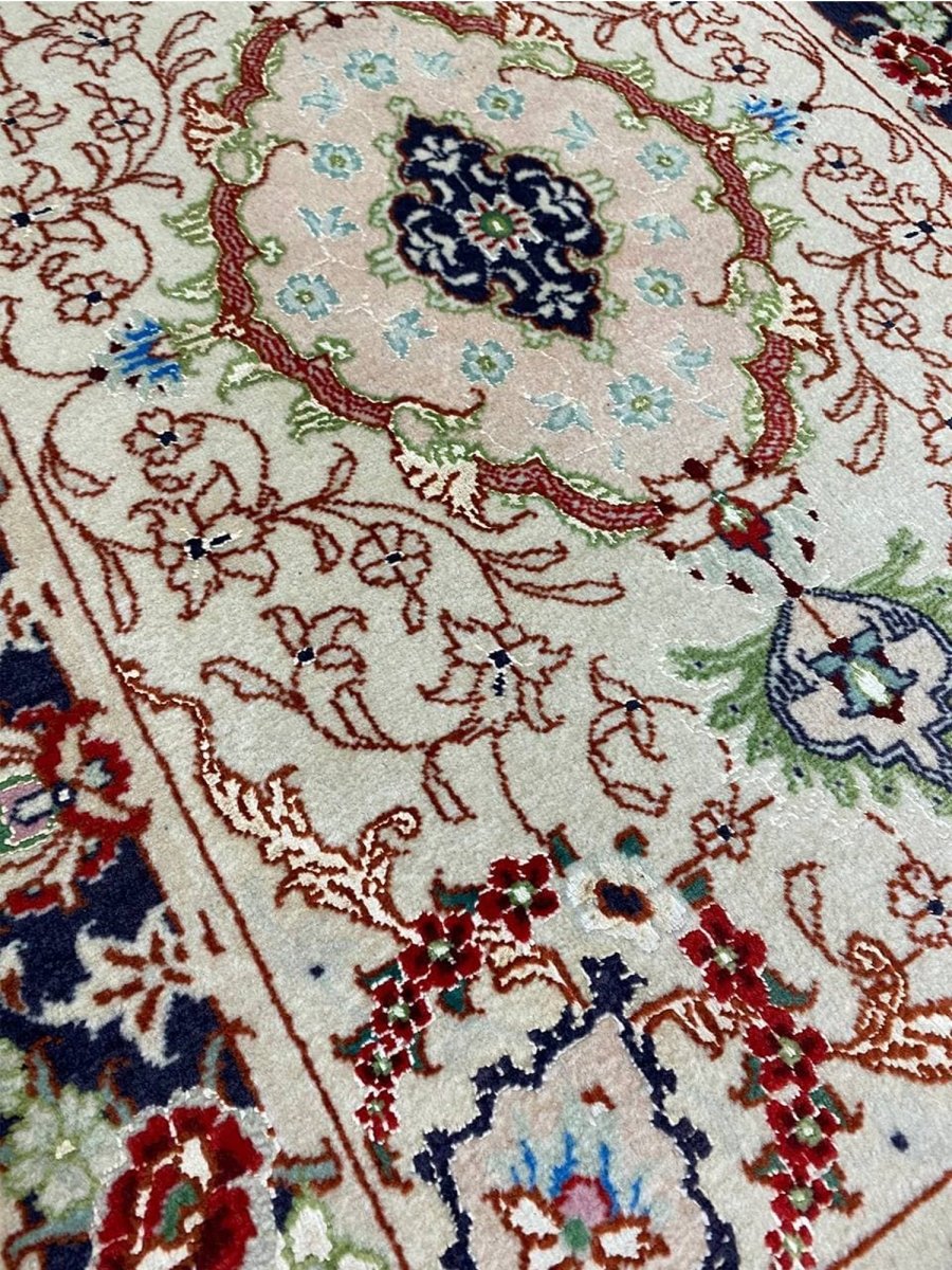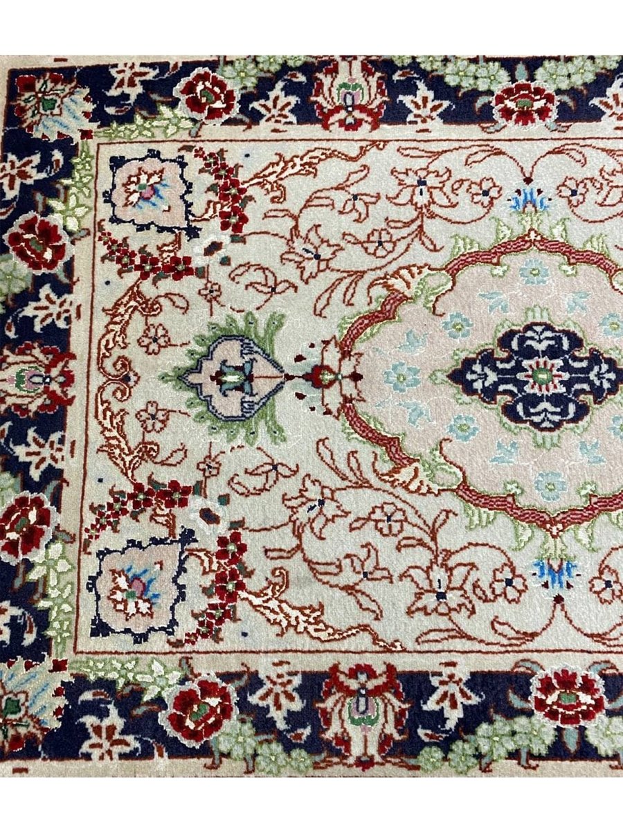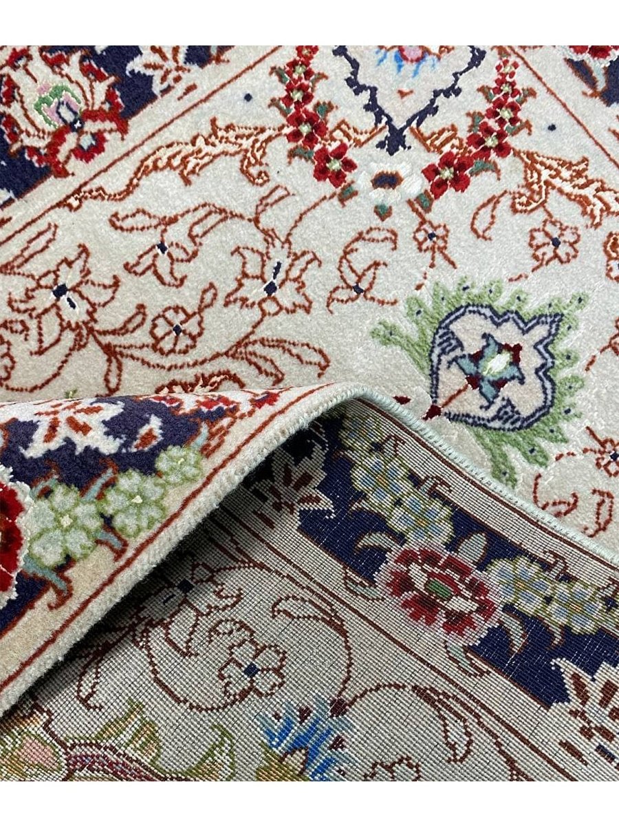 Immerse your space in the exquisite artistry of this magnificent 2x3 Persian Tabriz Masterpiece rug. Hand-knotted by skilled artisans in Tabriz, Persia, this piece exemplifies the enduring beauty and intricate craftsmanship for which Tabriz rugs are renowned. This is perfect for elevating your entryways or beside any furniture. The detailed medallion motifs and harmonious color palette create an atmosphere of timeless elegance and sophistication. The color palette includes cream, red, blue, and green tones. Crafted from a luxurious blend of wool and natural silk, this rug offers both durability and a soft, inviting texture. This rug is a true testament to Persian weaving, promising to be a cherished addition to any room.