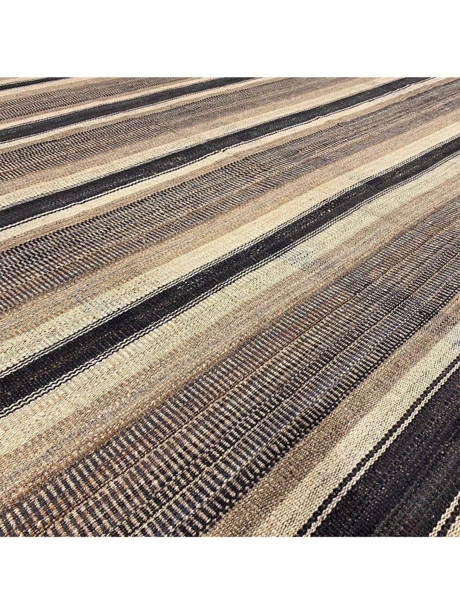 This 11x13 Handwoven Persian Kilim Rug is a true testament to classic craftsmanship, featuring a classic striped pattern in beige, brown and black hues. Woven in Persia, this rug is hand-knotted from high-quality wool, ensuring a soft yet durable surface that withstands daily use. Its flat-weave construction provides a lightweight texture, making it ideal for layering or as a standalone statement piece.