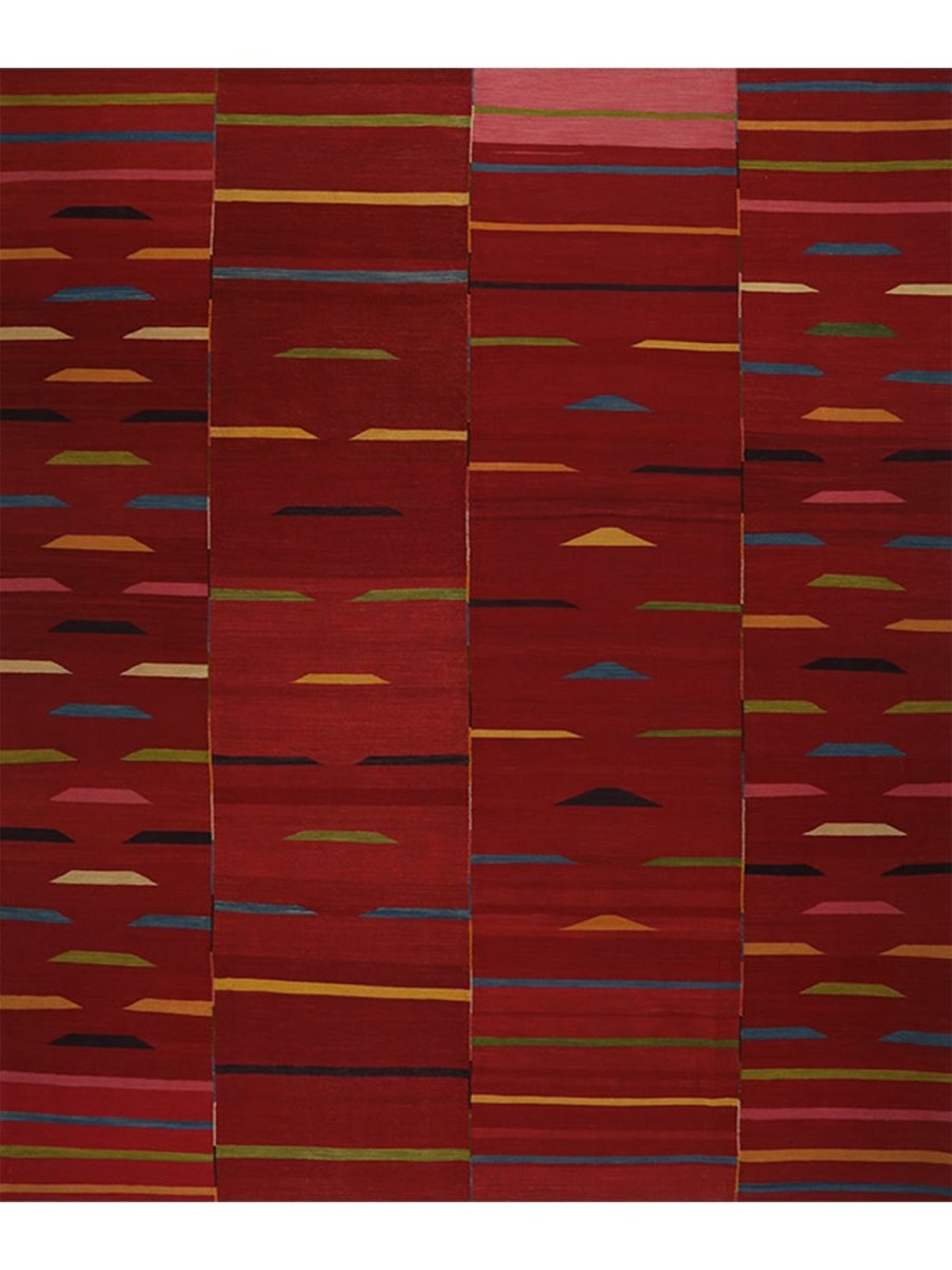 Hand-knotted in Persia from high-quality wool, this rug is durable and resilient, ensuring long-term beauty and functionality. Its structured composition of angular shapes and thin stripes brings a sense of rhythm and harmony to any space. This rug adds warmth, depth, and elegance to your decor.