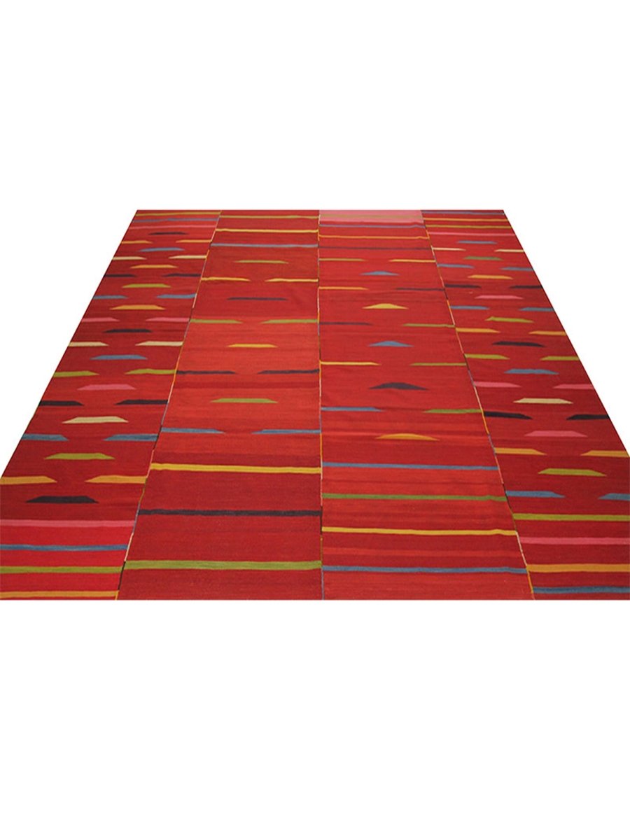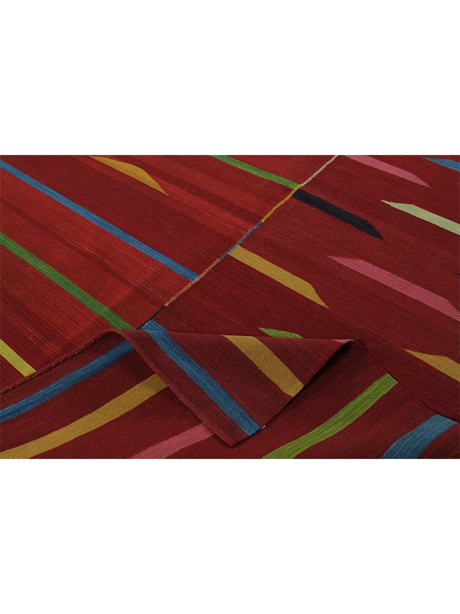 The 11x13 Red Persian Kilim Rug is a stunning fusion of Persian heritage and masterful craftsmanship. This rug is a bold statement piece, featuring rich crimson and ruby-red hues, enhancing any classic or sleek interior. The intricately woven striped patterns reflect centuries-old Persian artistry, creating a visually captivating and culturally significant design.