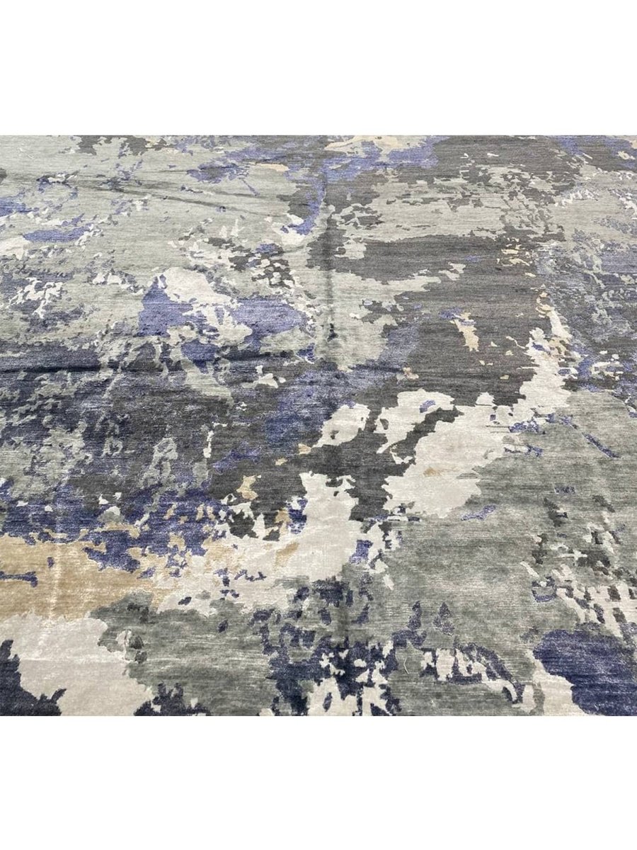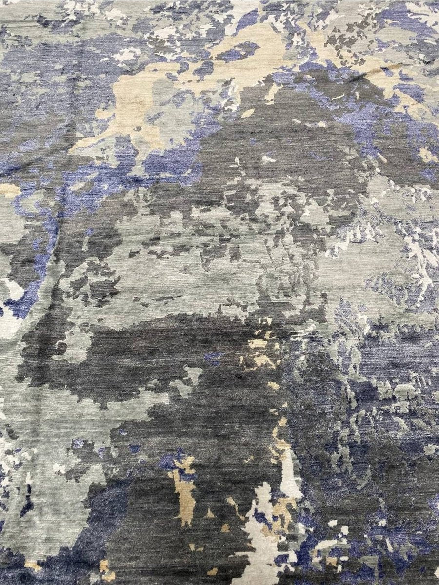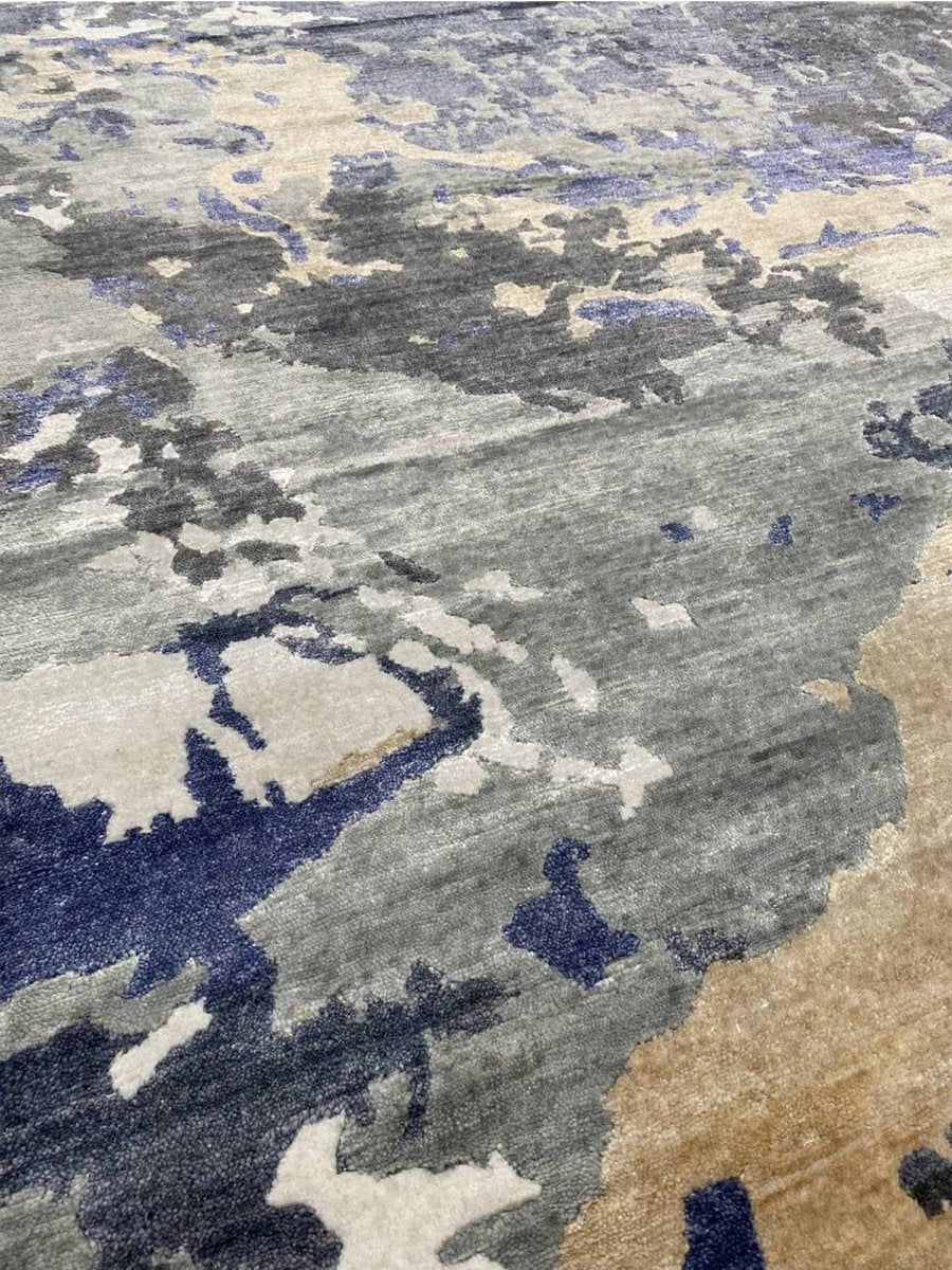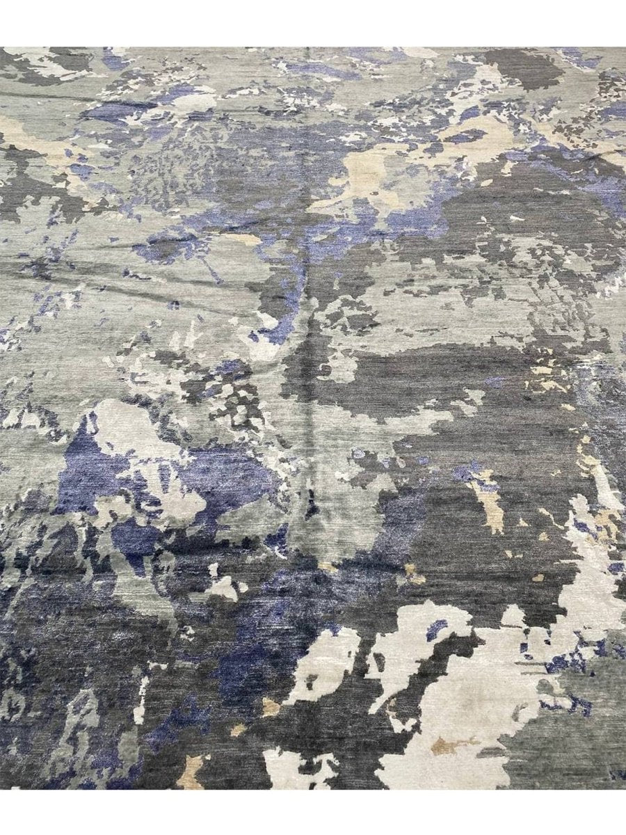 Infuse your space with a dynamic sense of artistry and depth with this captivating 12x15 hand-knotted modern abstract area rug, meticulously crafted in India. This generously sized rug showcases an expressive abstract pattern, where a compelling blend of gray, charcoal, varying shades of blue, ivory, and warm beige creates a visually stunning composition. The design evokes a sense of layered texture and fluid motion, offering a sophisticated aesthetic that is both striking and refined.