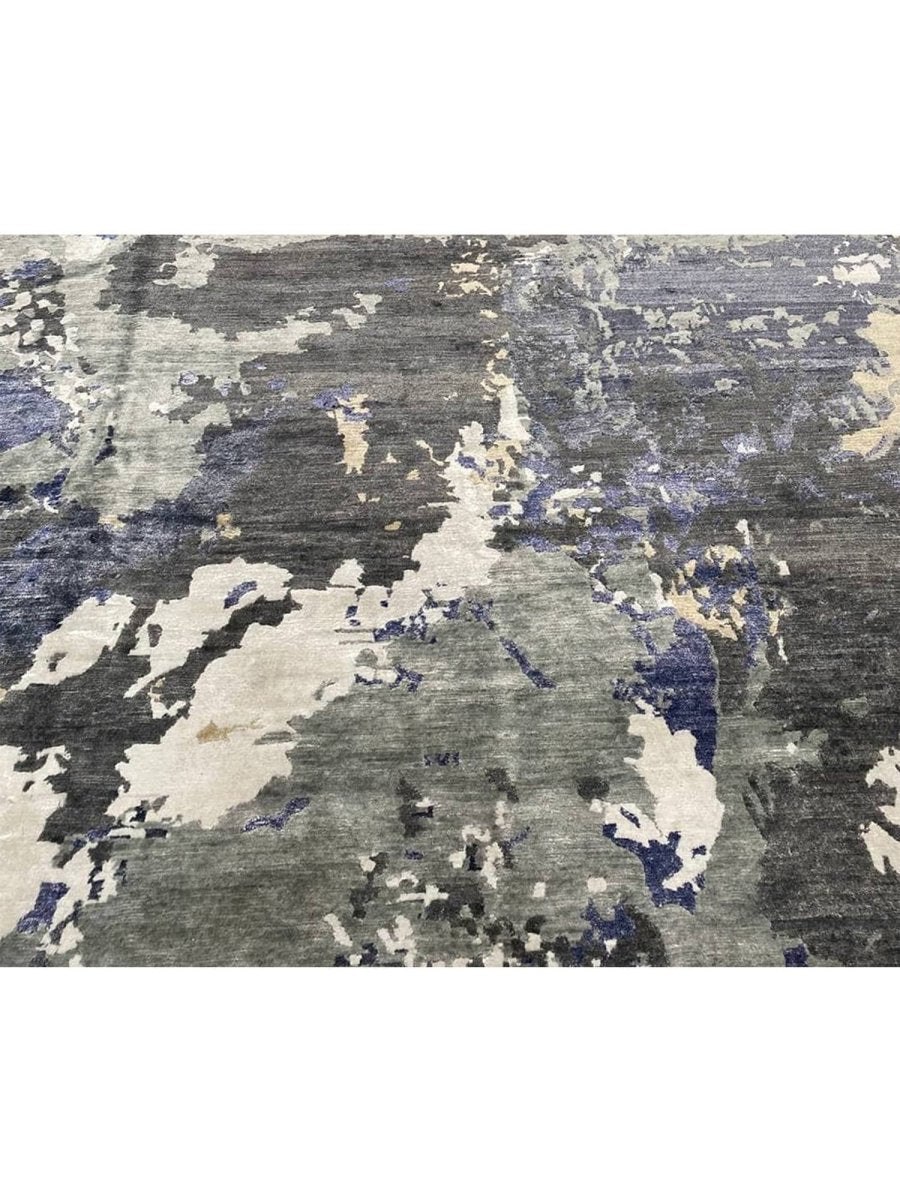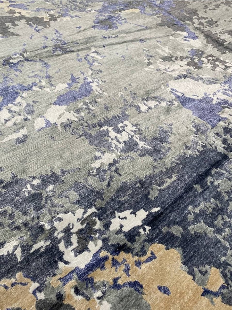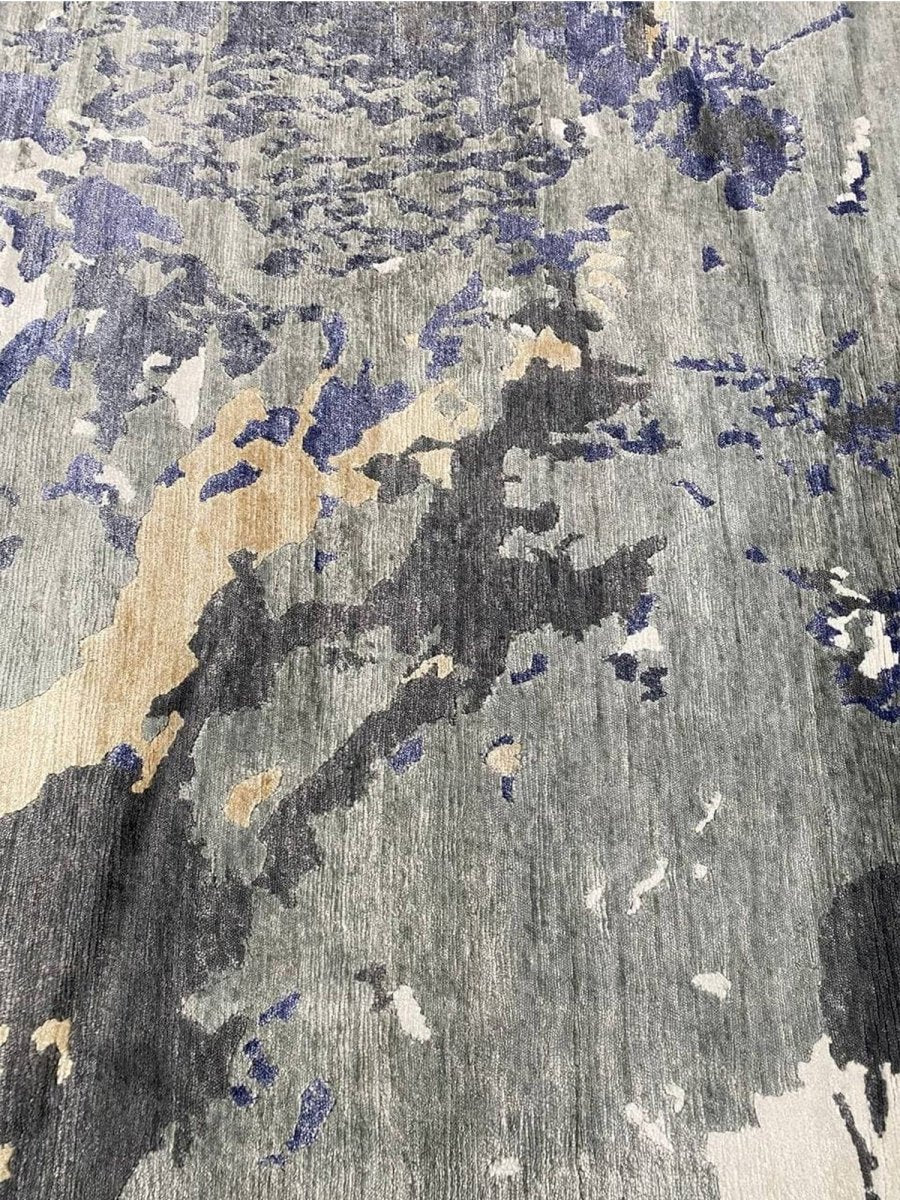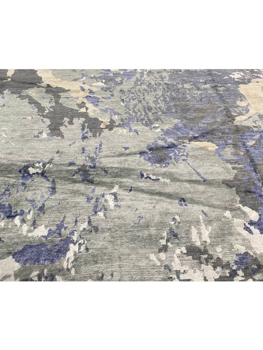 Infuse your space with a dynamic sense of artistry and depth with this captivating 12x15 hand-knotted modern abstract area rug, meticulously crafted in India. This generously sized rug showcases an expressive abstract pattern, where a compelling blend of gray, charcoal, varying shades of blue, ivory, and warm beige creates a visually stunning composition. The design evokes a sense of layered texture and fluid motion, offering a sophisticated aesthetic that is both striking and refined.