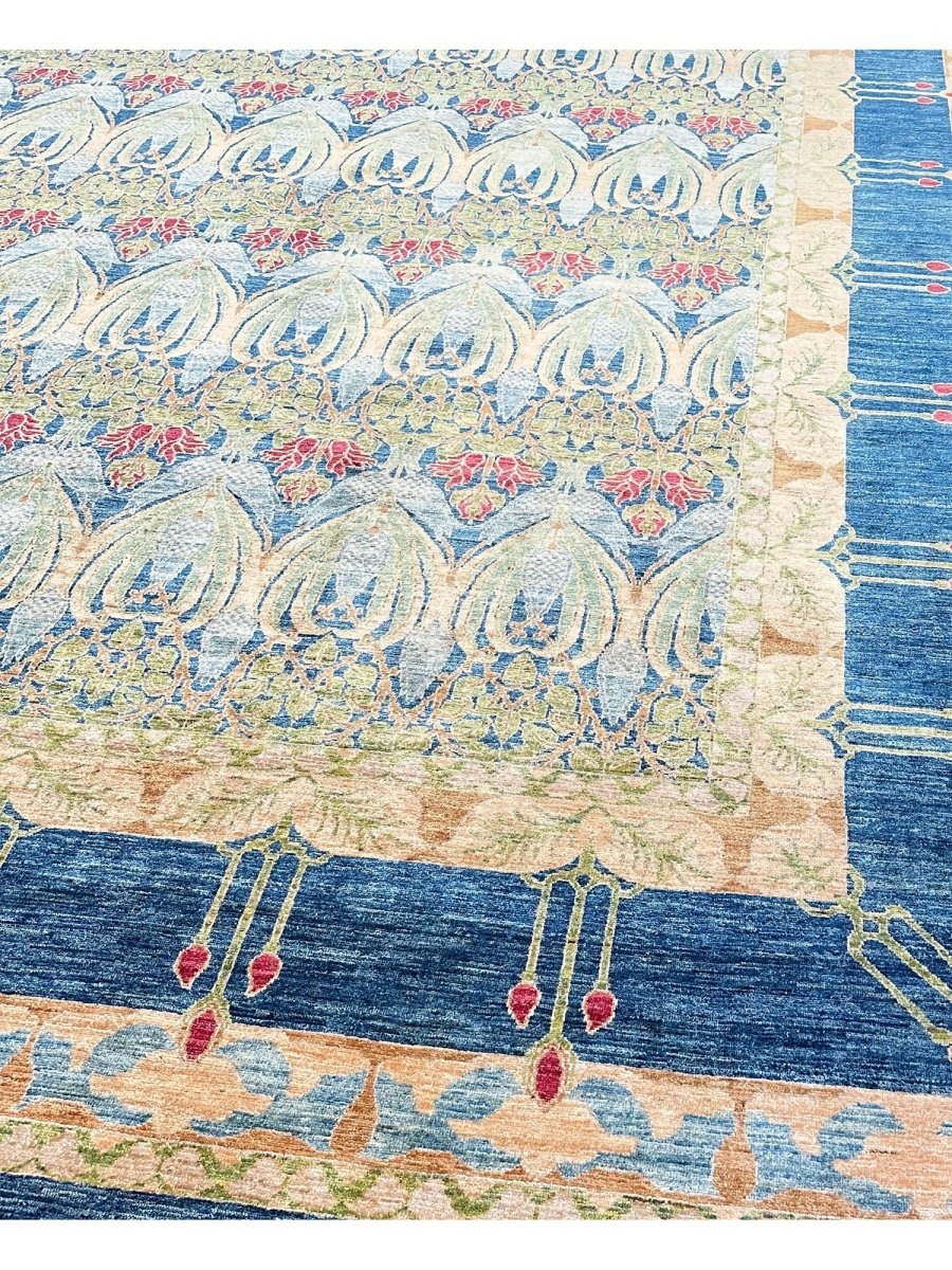 Enhance your large living room, dining room, and spacious bedrooms with the distinctive charm of this 14x20 Arts and Crafts area rug. Hand-knotted in Pakistan from premium wool, this rug showcases a beautiful all-over geometric pattern with repeating motifs. The captivating color palette of deep blue, light blue, beige, light green, and red adds a touch of subtle elegance to any space. Crafted for durability and style, this Arts and Crafts rug will be a cherished addition to your home. Its soft texture and intricate detailing make it a cozy yet refined choice for high-traffic areas. Shop now and get free delivery to your doorstep in the United States. Experience timeless design and comfort in one elegant piece.