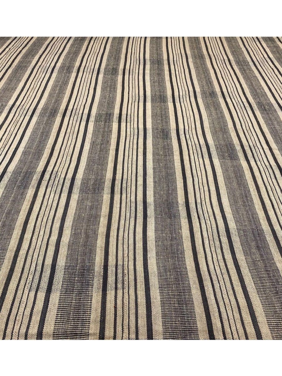 This 13x13 Old Persian Kilim Rug is a stunning example of classic Persian craftsmanship, hand-knotted with precision and care. Its sophisticated beige and black striped design brings elegance to any space. Its neutral tones make it a versatile choice, complementing sleek minimalist interiors and classic, rustic aesthetics.