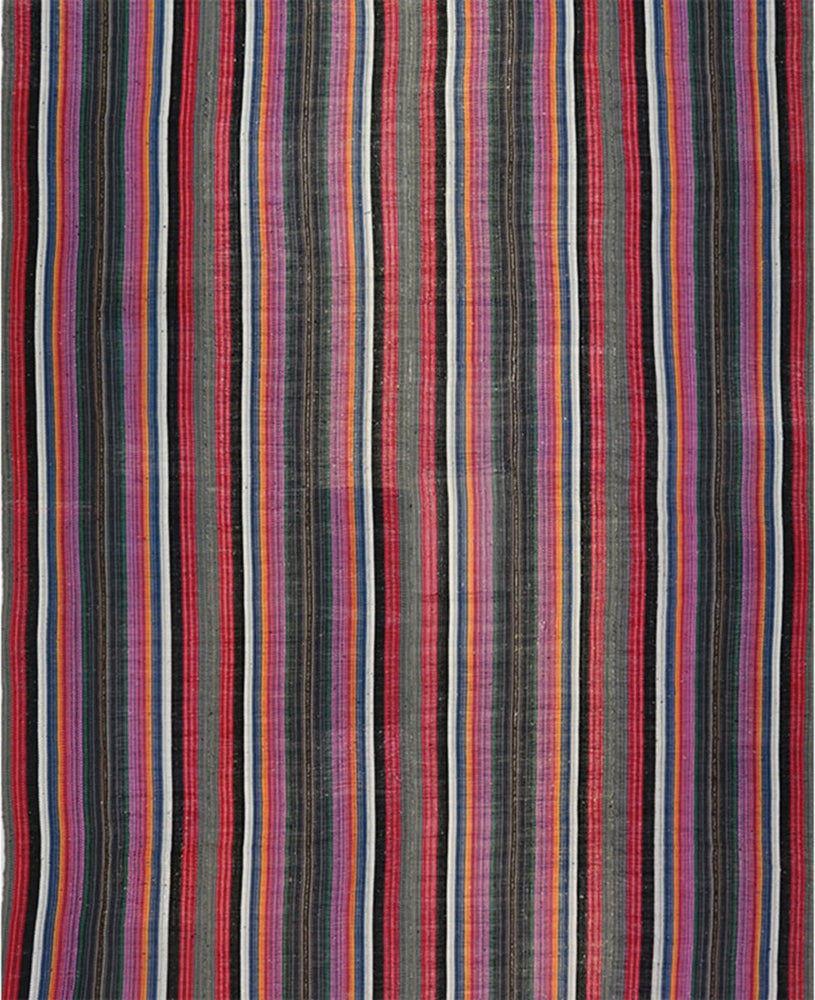 This 13x15 Persian Kilim Rug is a striking representation of Persian craftsmanship, featuring a bold striped design in black, red, white, gray, blue, and purple hues. Handwoven from high-quality cotton blend, this rug offers both durability and a soft texture. Its flat-weave construction ensures a lightweight yet sturdy design, perfect for layering or as a standalone statement piece.