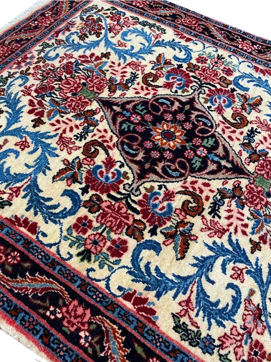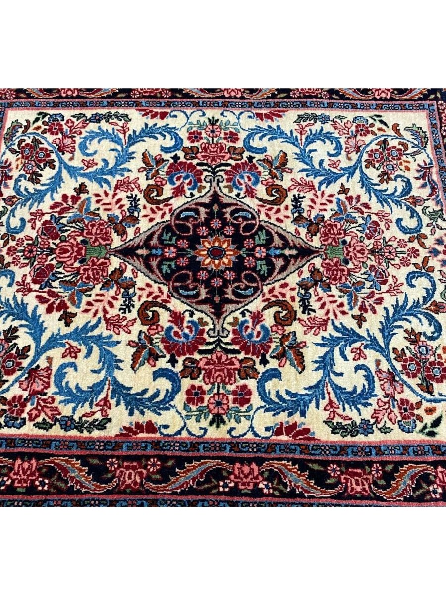 Hand-knotted in Persia with a sturdy weave, this beautiful 2x3 Old Persian Bijar rug offers lasting beauty and artistry. The bold medallion pattern is detailed, showcasing its primary colors. Crafted from durable wool, this rug features an ivory field with patterns primarily in red and blue. The floral motifs give it an elegant touch. Its small size and classic design make it a perfect accent piece for entryways, beside a chair, or layered in a room. This antique rug brings traditional charm and resilience to any small space. Enjoy the convenience of free US shipping.
