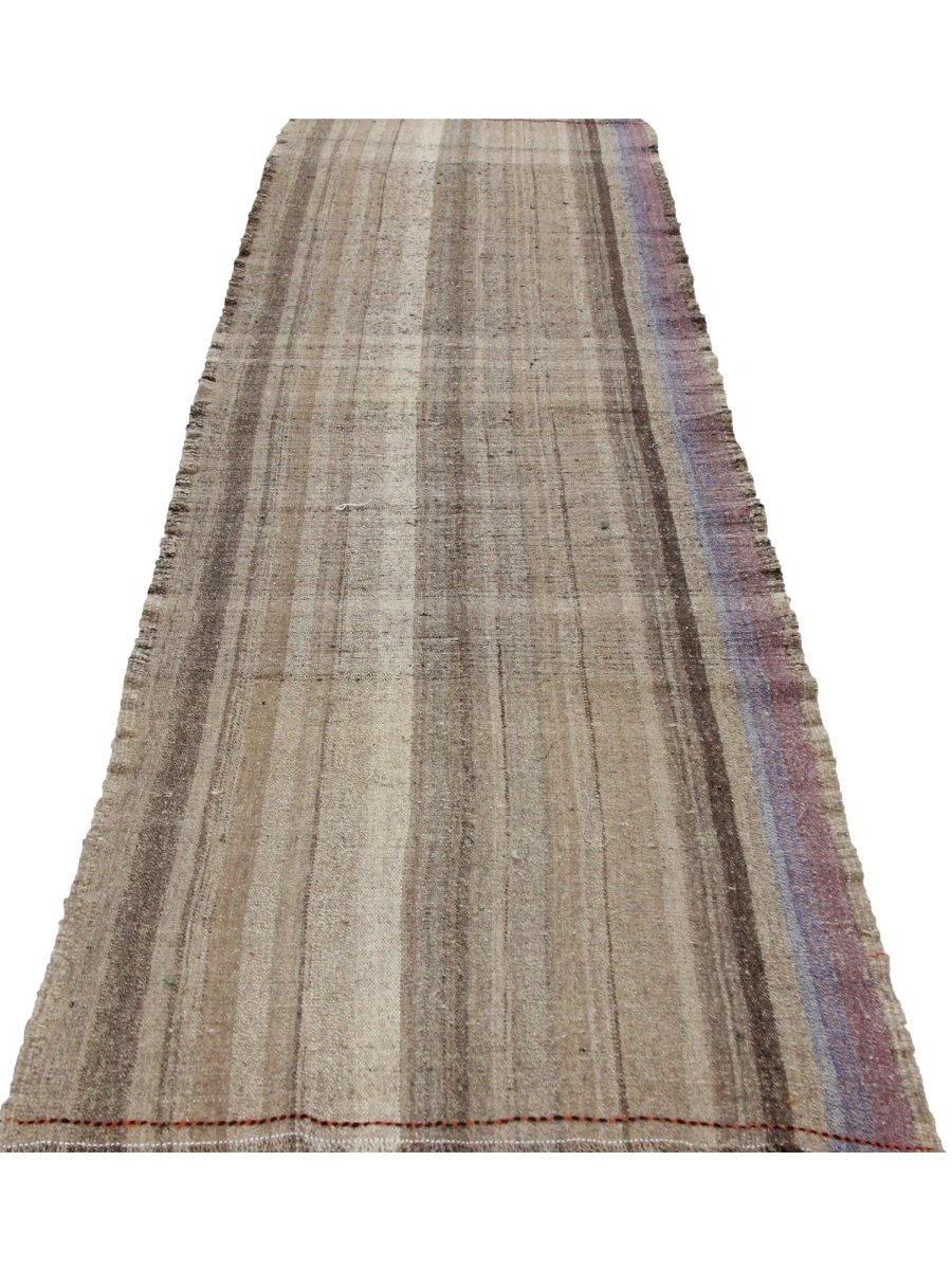 This 3x11 Handwoven Persian Kilim Runner is a stunning piece of Persian artistry, featuring a beige and brown color palette with subtle pattern variations. Its natural tones and simple yet elegant design allow it to seamlessly integrate into various interior styles, from minimalist and chic to classic and bohemian.