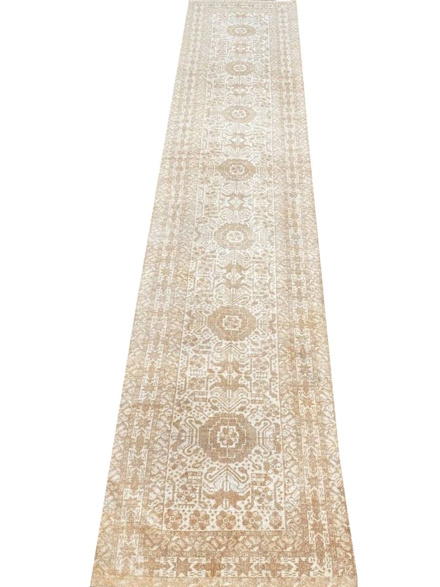 The 3x13 handwoven Old Afghani Runner Rug is a unique treasure that embodies the rich history of Afghani weaving and will transform your living area. Made from high-quality wool, this gorgeous rug features a geometric design that blends in perfectly with any type of interior design. It provides a friendly atmosphere and is perfect for narrow spaces such as hallways or entryways or as a chic addition in your workplace. It is a multipurpose addition to your house because of the striking blend of beige, light, and dark brown hues that offer depth and character. This amazing carpeting is a stunning work of art that elevates your living area and goes beyond simple decoration. Take advantage of free US delivery.