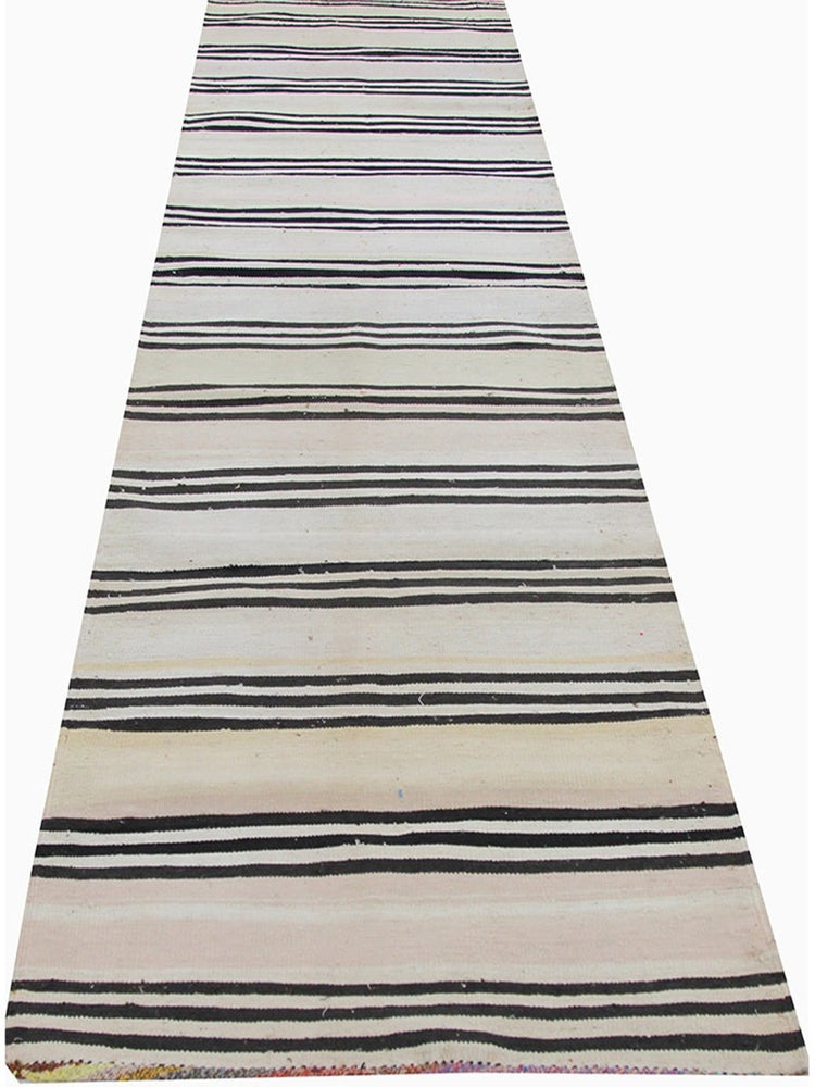 This 3x13 Persian Kilim runner rug features a soft ivory base with refined stripes in black, beige, and gray. The neutral color palette creates a harmonious and elegant aesthetic. Handwoven from fine Persian wool, this flatweave rug offers durability and easy maintenance while showcasing classic craftsmanship. The understated yet classic striped design enhances both classic and rustic interiors, adding warmth and texture to any room.