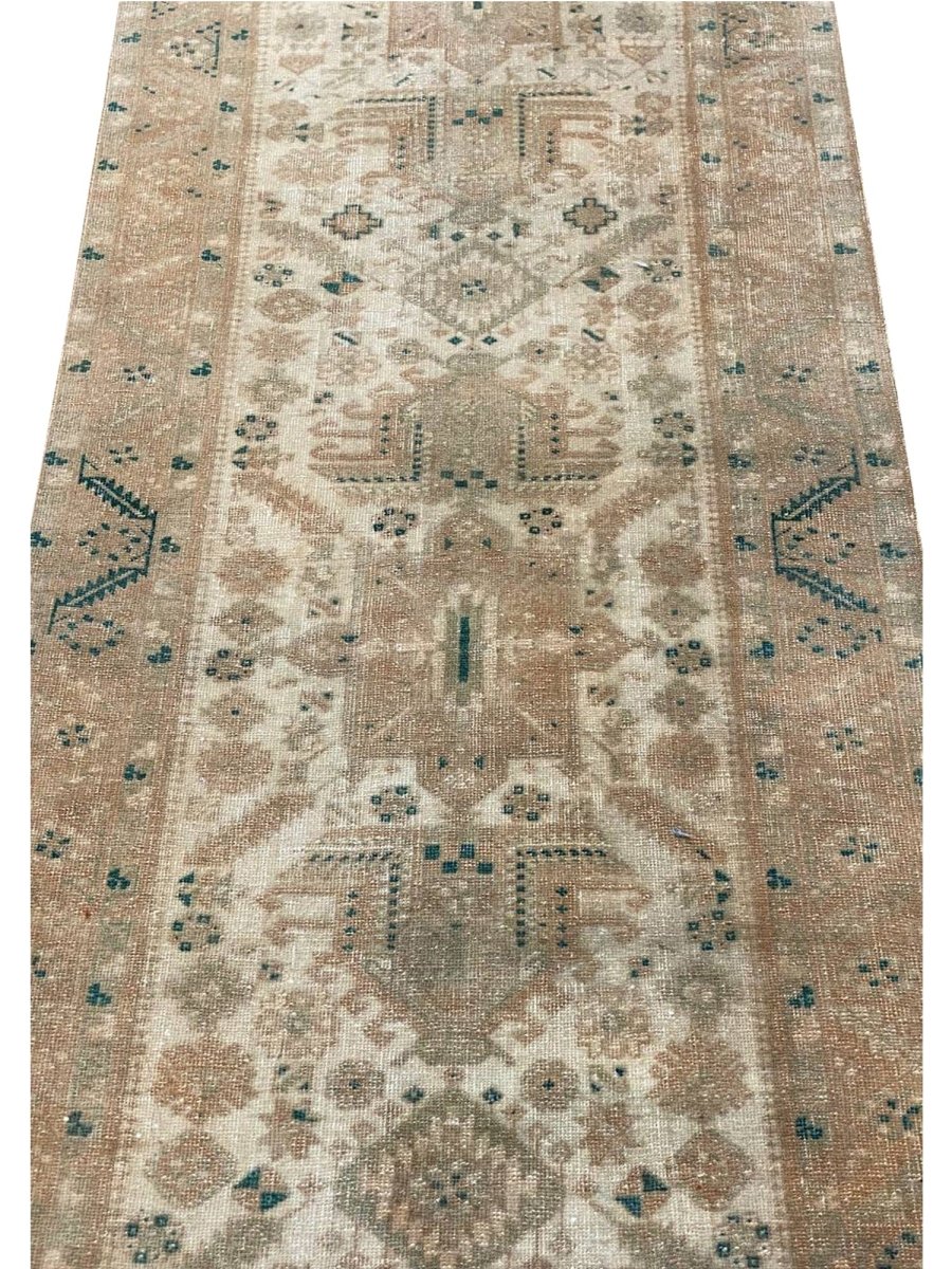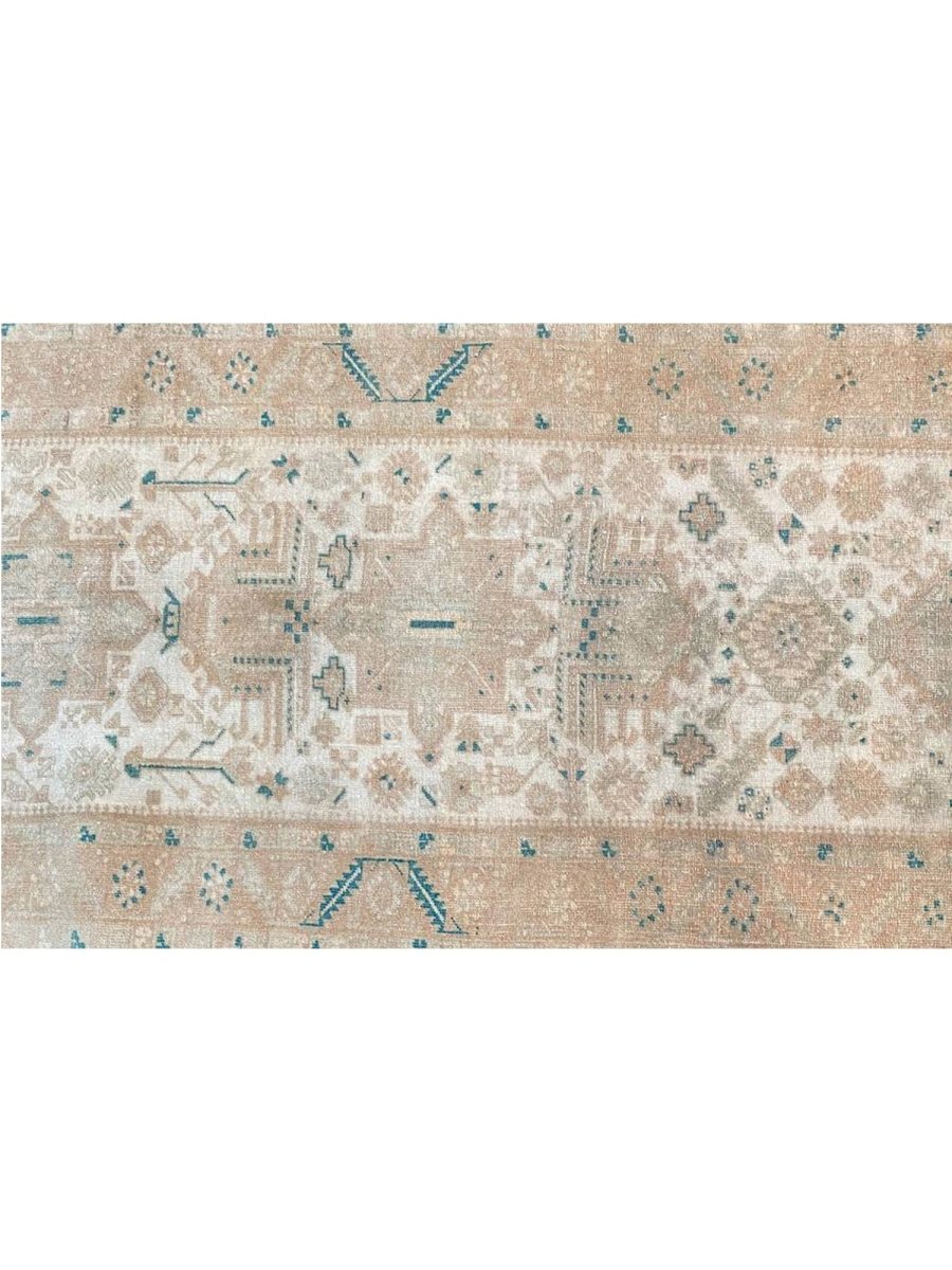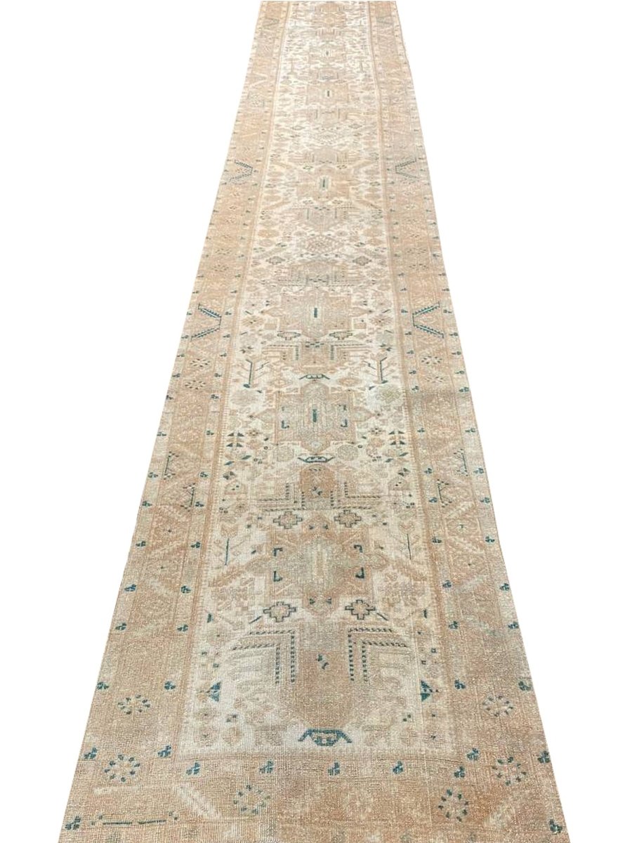 Discover the beauty of this 3x19 Old Persian Heriz Runner Rug. Handwoven in Persia, this rug showcases skilled artistry. Its size makes it an excellent choice for hallways, entryways, and narrow spaces, adding a touch of traditional elegance to your decor. The pattern features a geometric design, giving it a unique and eye-catching feel. The color palette includes warm beige and light brown tones, with subtle accents of blue within the geometric and ethnic motifs. These tones work together to create a welcoming and distinctive ambiance. Made from durable wool, this rug is more than just a floor covering; it's a work of art that will enhance your home decor for years. Enjoy the lasting charm of a handwoven rug, plus free shipping within the United States.