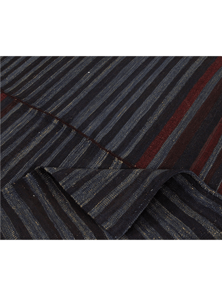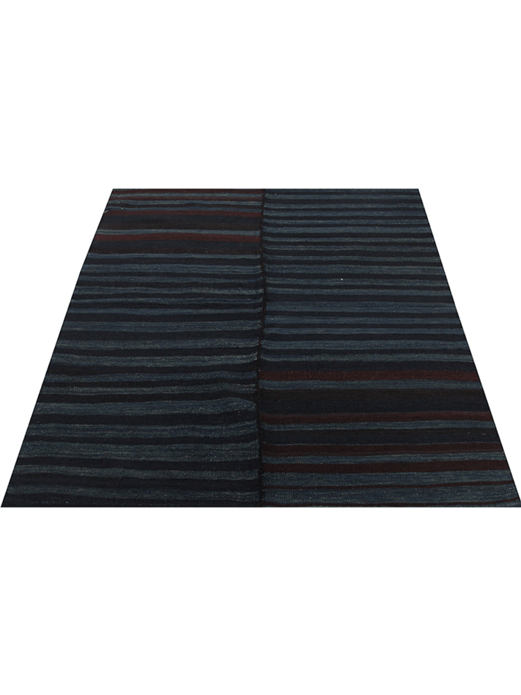 This 3x4 square blue Persian kilim rug is a stunning example of Persian weaving, boasting a beautiful regular striped pattern that showcases a rich rust and blue color. The rug's hand-knotted construction and bold color palette make it perfect for those who want to add a touch of sophistication and elegance to their home decor. The blue color is expertly woven to create a sense of calmness and serenity, making this rug a perfect choice for those who want to create a peaceful atmosphere in their room. The subtle rust accents add a touch of warmth and texture to the rug, making it a unique and eye-catching piece. With its compact size and elegant design, this rug is perfect for adding a touch of refinement to any room. A true conversation starter, this rug is sure to draw attention and admiration.