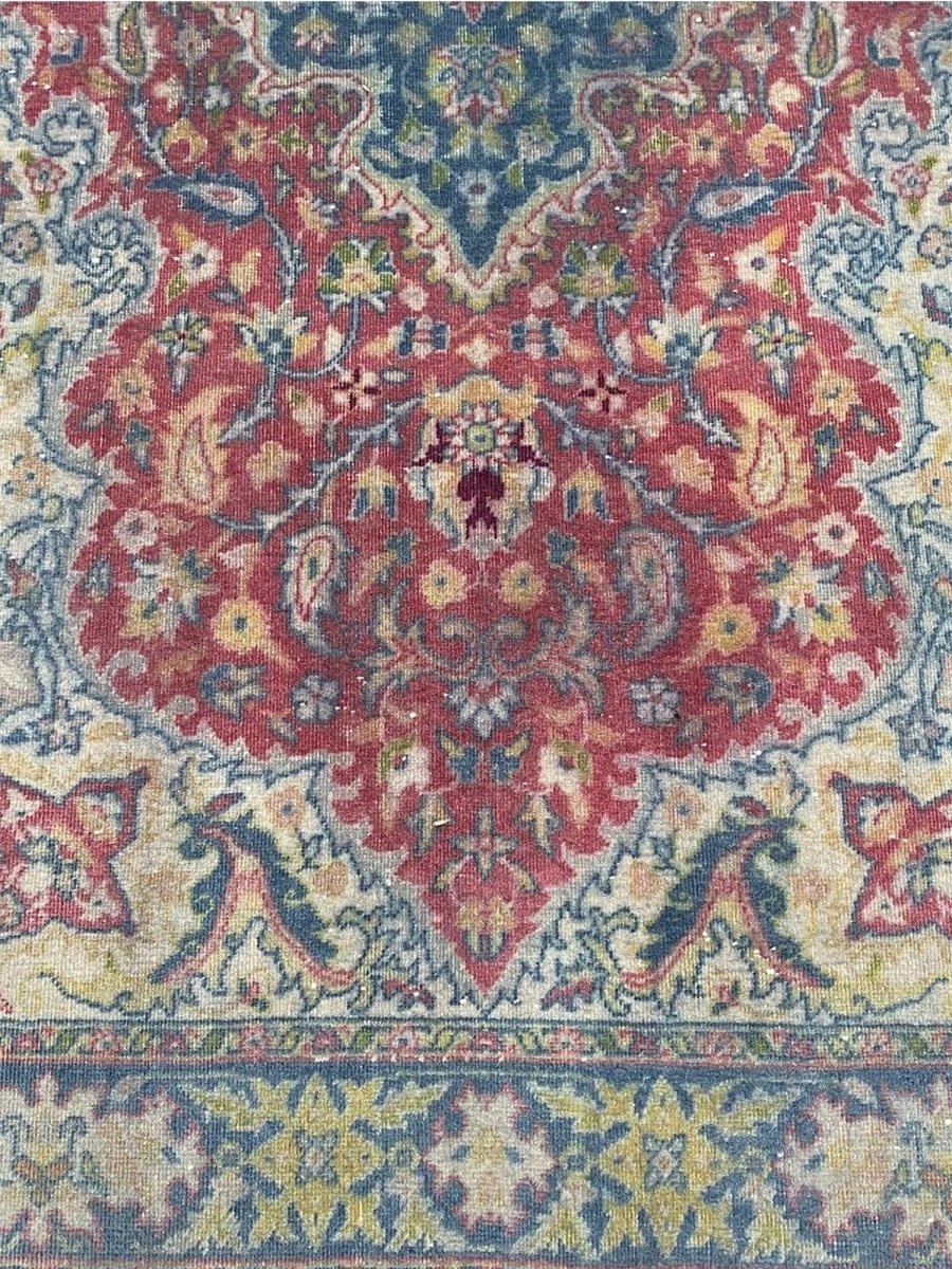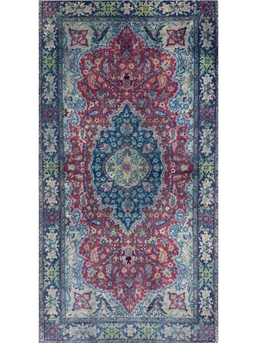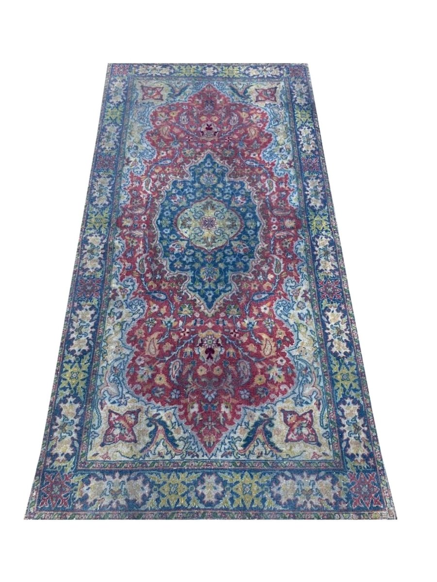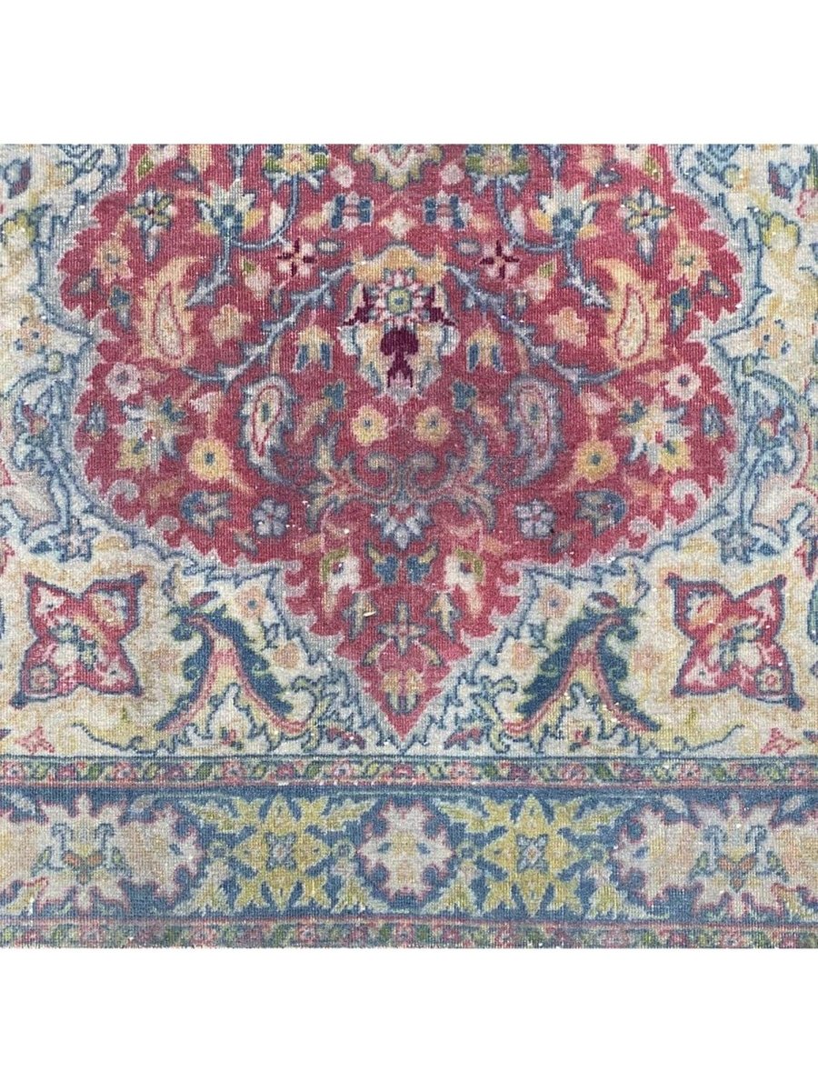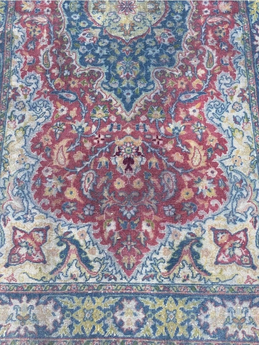 Immerse your space in the grandeur of this 3x6 Antique Persian Tabriz Area Rug. Handwoven in Persia, this rug showcases the enduring artistry of Persian weaving. Its size makes it a charming addition to entryways, hallways, or small living rooms. The central medallion pattern gives it a sophisticated and eye-catching focal point. The color palette features a vibrant combination of red, blue, and beige tones. These rich and contrasting colors create a lively and inviting ambiance. Made from durable wool, this rug is not just a floor covering; it's a piece of history that will enhance your home decor for generations.