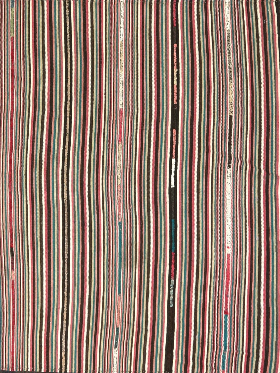 The striking striped pattern adds a touch of dynamism and visual interest to the rug's design, which is characterized by delicate motifs and subtle color gradations. With its compact size of 4'4" x 5'1", this old Persian Kilim rug is perfect for adding a touch of elegance. Its exceptional quality and beautiful design make it a valuable addition to any home. The rug's timeless appeal and durable construction ensure it will remain a treasured possession for years to come. Whether displayed in a formal setting or a cozy retreat, this old Persian Kilim rug is sure to impress.
