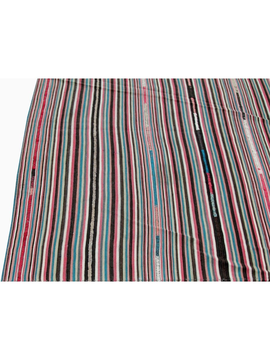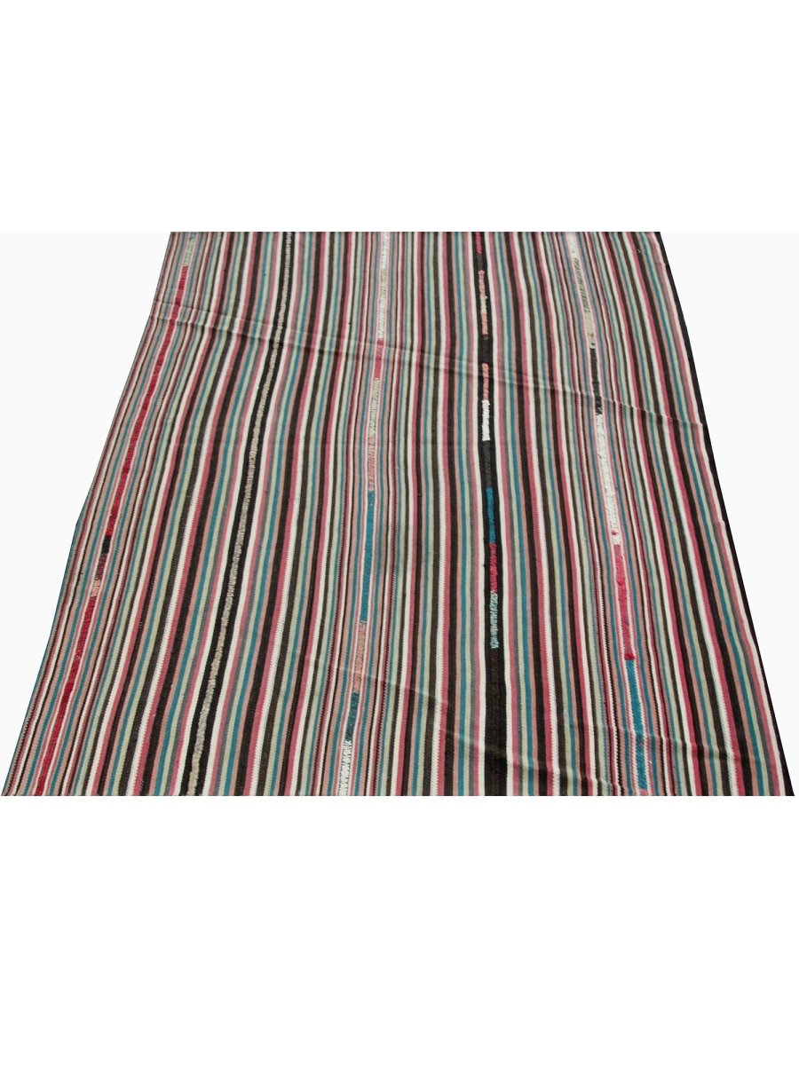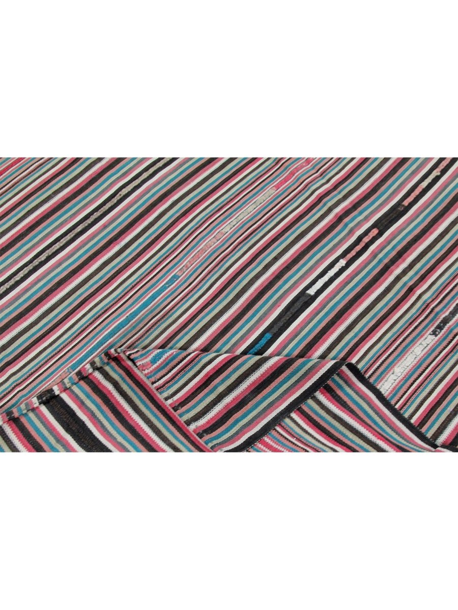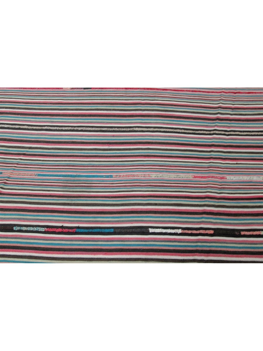 This charming 4x5 old Persian Kilim rug is a delightful addition to any room, boasting a stunning color palette that adds a touch of warmth and sophistication. Made from high-quality wool using a flat construction, it features a beautiful combination of black, red, pink, brown, blue, and white hues, perfectly balanced to create a sense of energy and vitality.