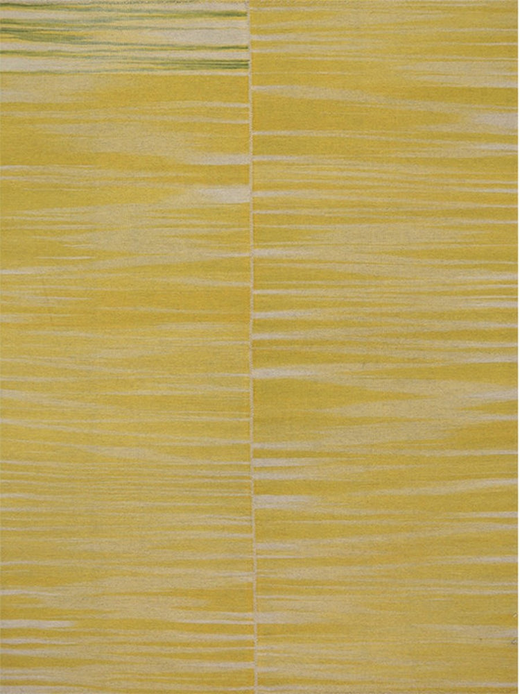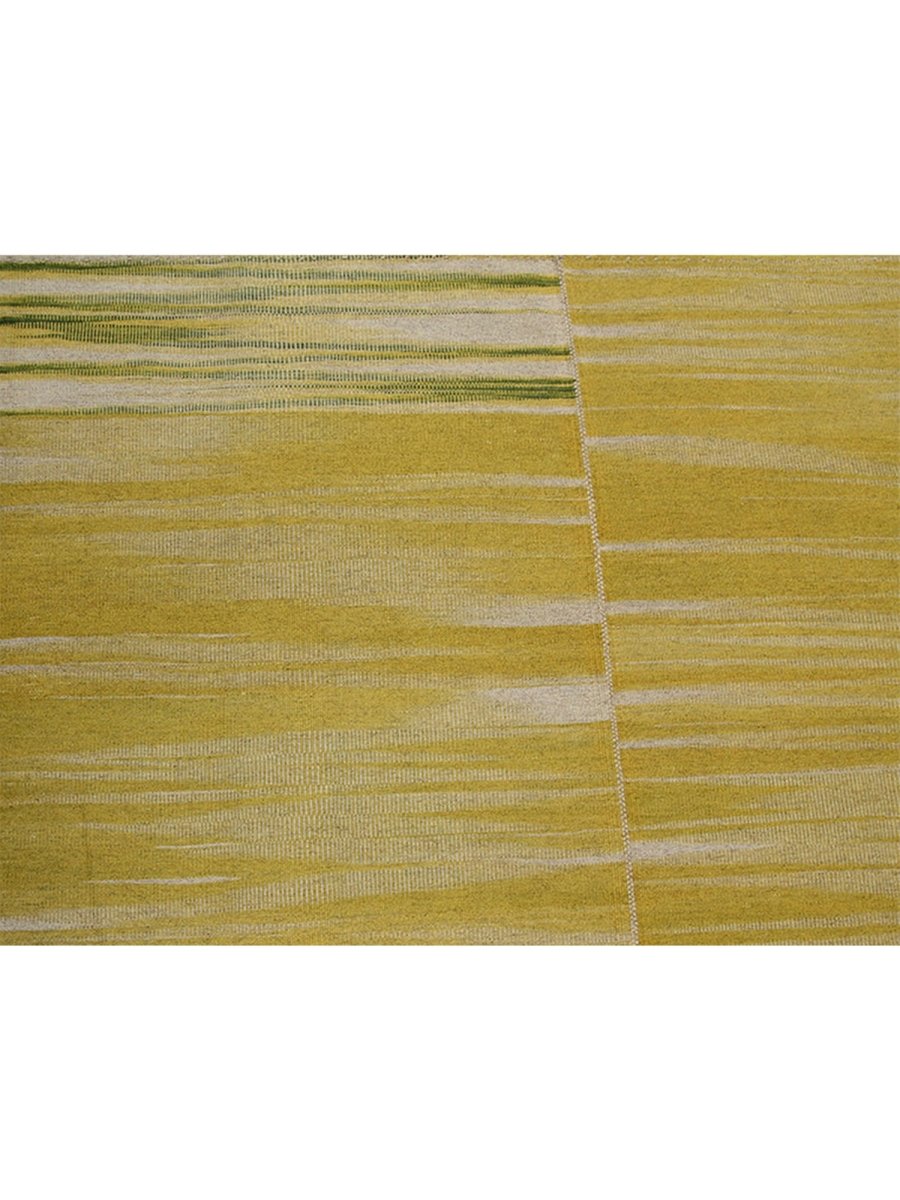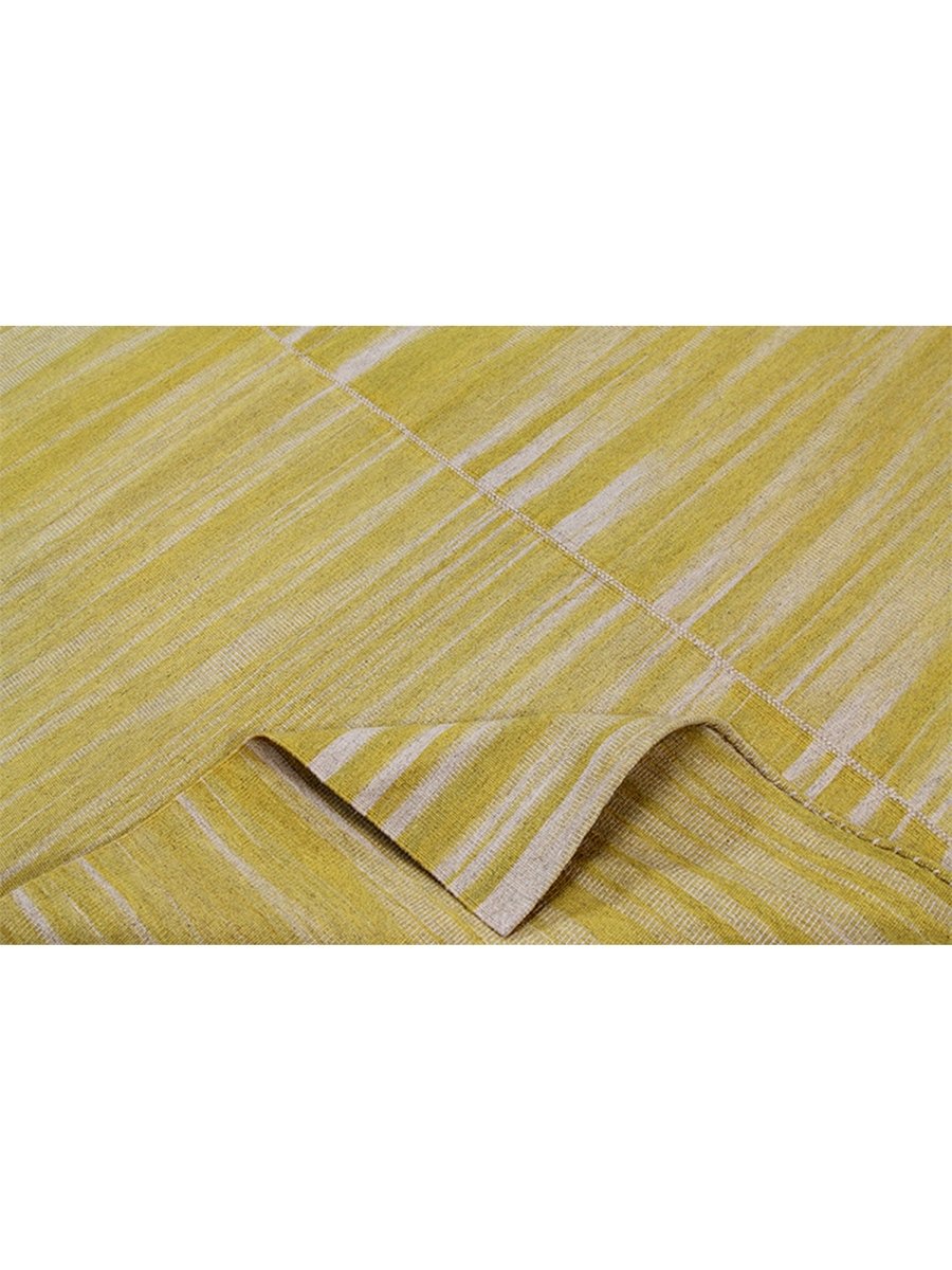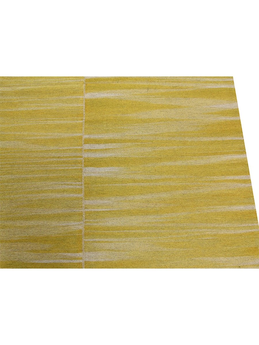 This 4x6 Gold Persian Kilim Area Rug is a stunning blend of classic Persian craftsmanship. Featuring a predominantly golden yellowish color with subtle variations in tone, the rug showcases fine, irregular horizontal lines that create a delicate striped effect. A central vertical division slightly distinguishes two similar sections, adding depth to the design, while faint greenish streaks in the upper left corner provide a touch of contrast.